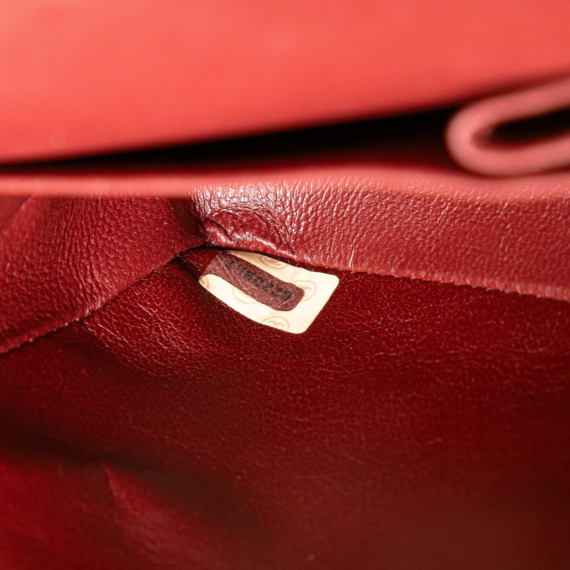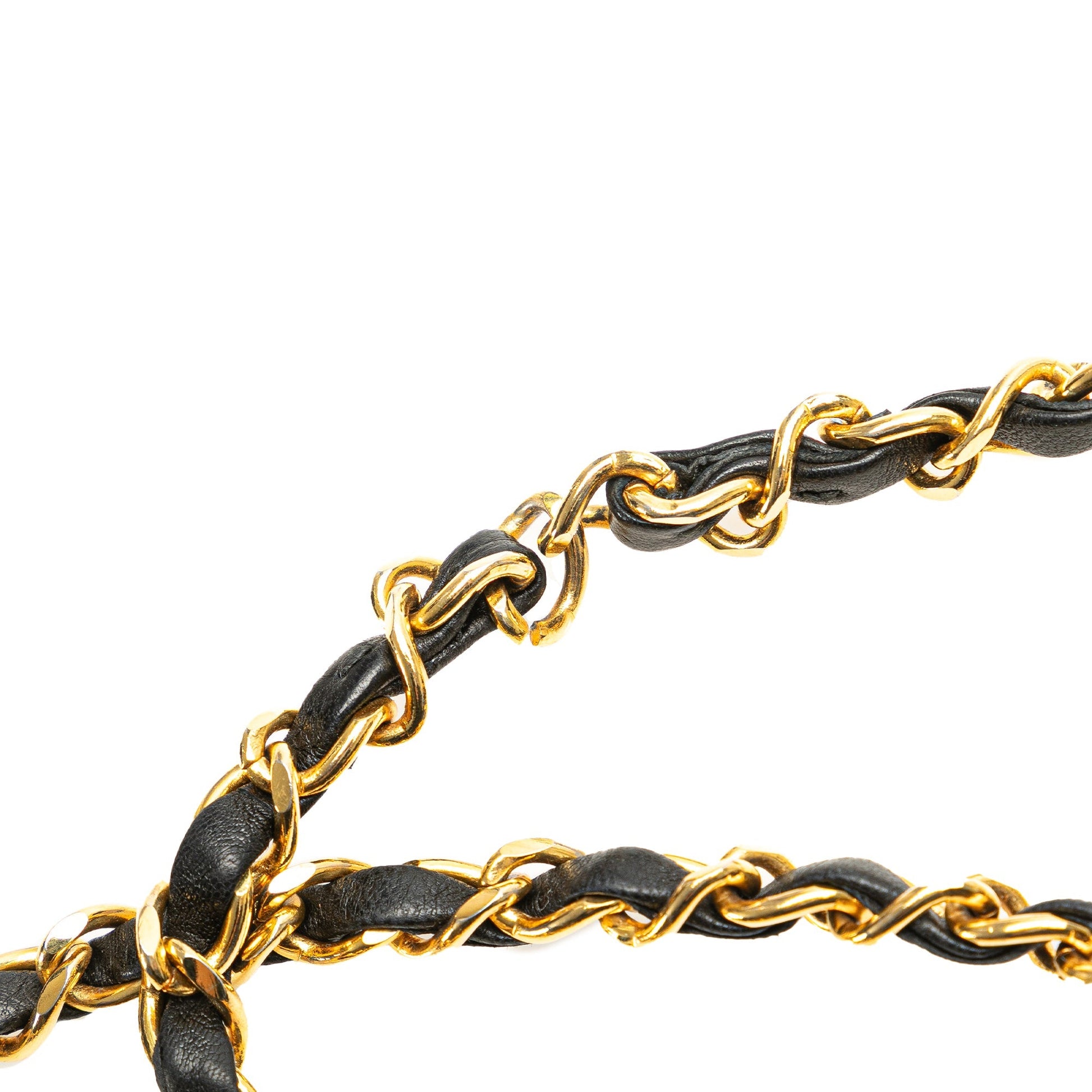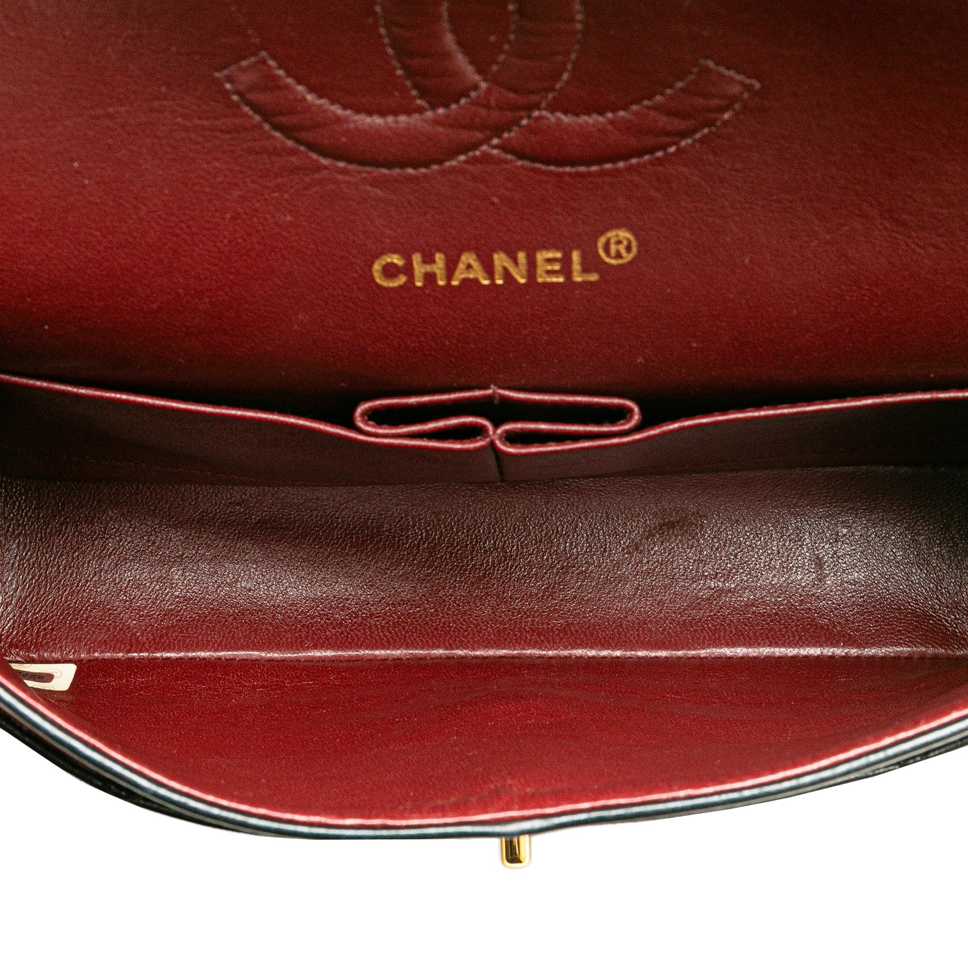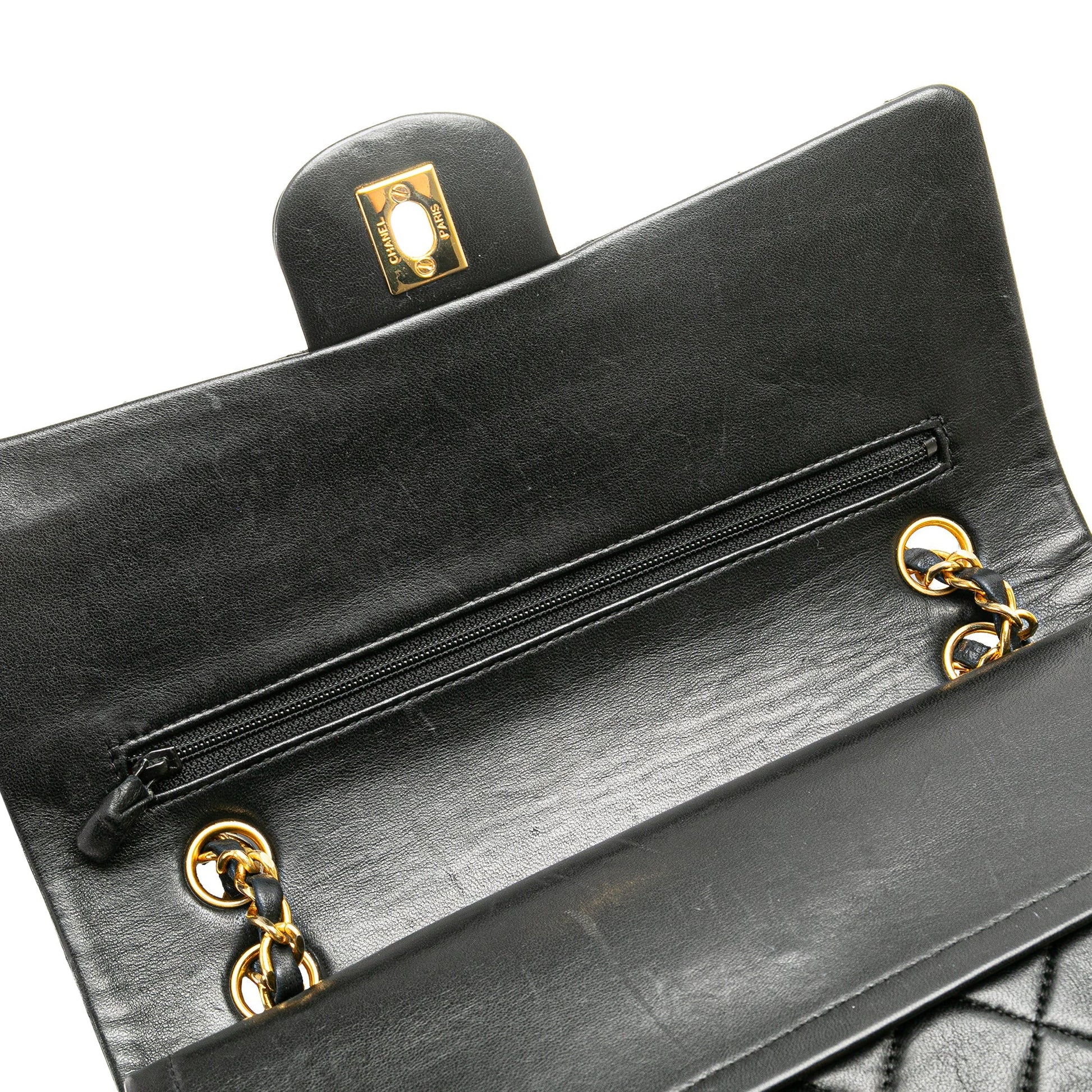 Product Details: Black Chanel Medium Classic Lambskin Double Flap Shoulder Bag. This shoulder bag features a quilted lambskin body, leather woven chain link straps, double front flaps with interlocking Cs and a twist lock closure, an exterior back slip pocket, and interior zip and slip pockets. Strap is repaired. 5.9" L x 9.8" W x 2.6" D. Serial number 1480229.