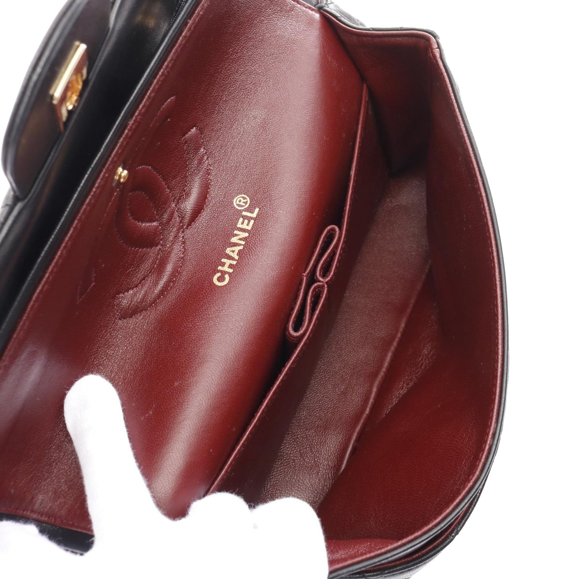 Product Details: Black Chanel Medium Classic Lambskin Double Flap Shoulder Bag. This shoulder bag features a quilted lambskin body, leather woven chain link straps, double front flaps with interlocking Cs and a twist lock closure, an exterior back slip pocket, and interior zip and slip pockets. 6.3" L x 9.8" W x 2.6" D, 8.7" drop. Serial number 1829335.