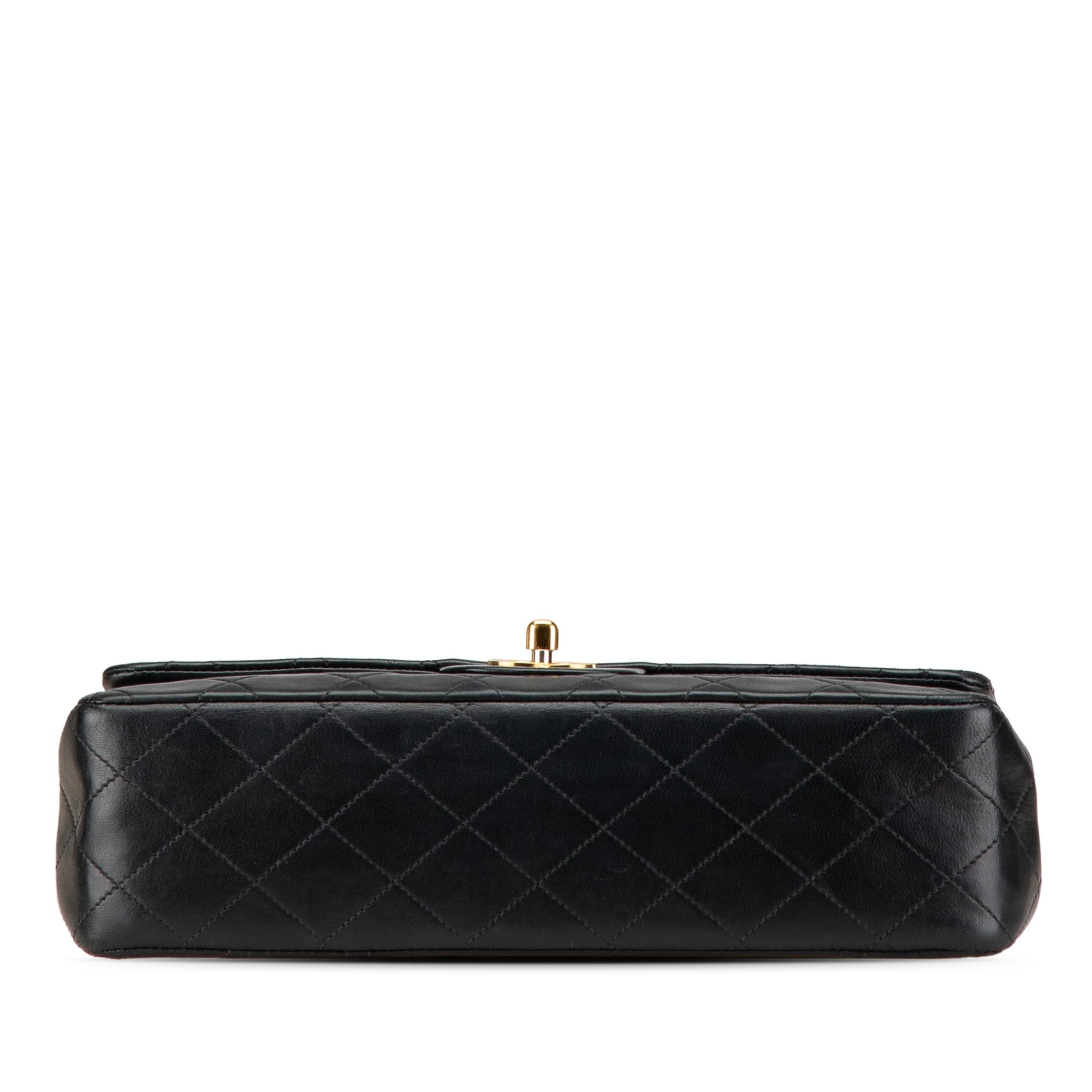 Product Details: Black Chanel Medium Classic Lambskin Double Flap Shoulder Bag. This shoulder bag features a quilted lambskin body, leather woven chain straps, double front flaps with interlocking Cs and a twist lock closure, an exterior back slip pocket, and interior zip and slip pockets. 6.3" L x 10" W x 2.6" D. Serial number 2032194.