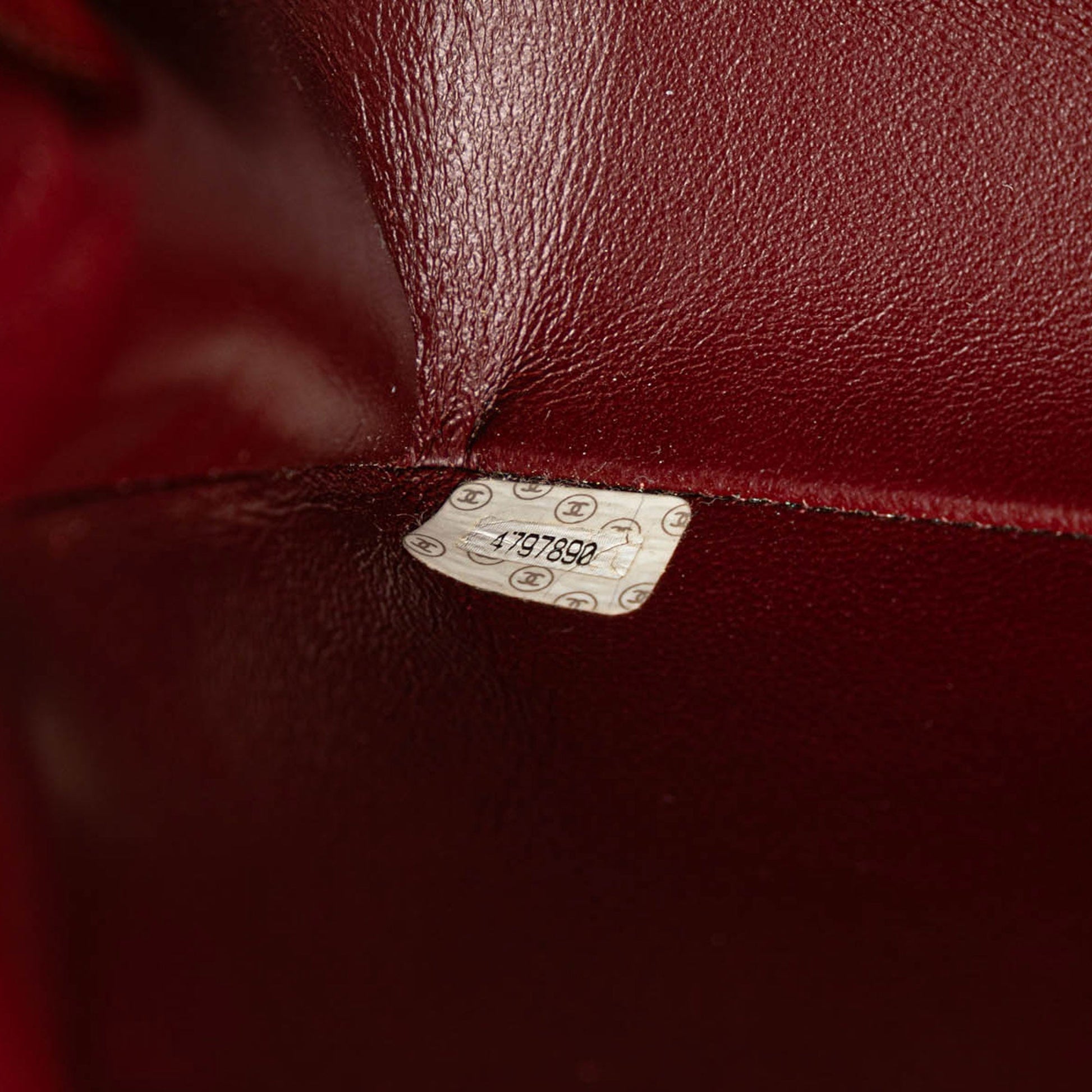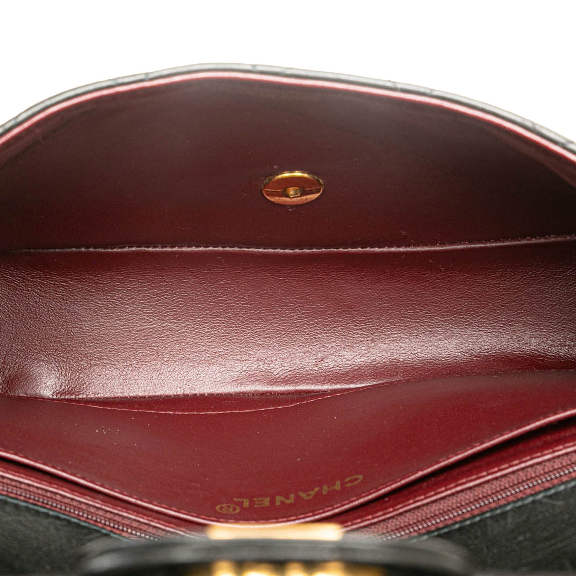 Product Details: Black Chanel Medium Classic Lambskin Kelly Flap Bag. The Kelly handbag features a lambskin leather body, a rolled leather top handle, a front flap with a twist lock closure, an exterior back slip pocket, and interior zip and slip pockets. 5.5" L x 10.2" W x 2.4" D. Serial number 4797890.