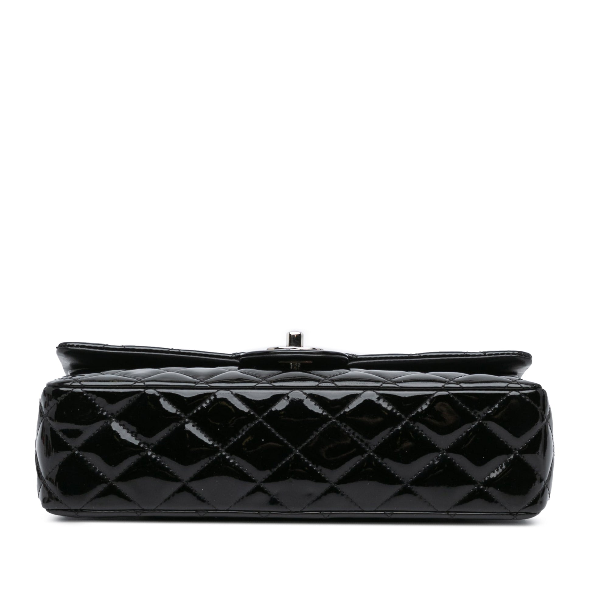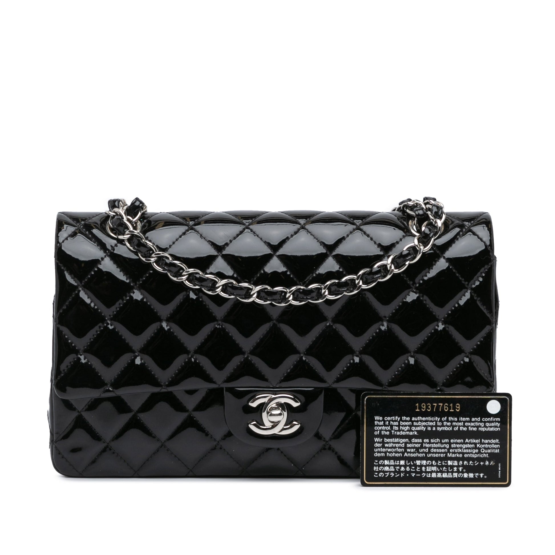 Product Details: Black Chanel Medium Classic Patent Double Flap Shoulder Bag. This shoulder bag features a quilted patent leather body, leather woven chain shoulder straps, double front flaps with CC turn-lock closure, an exterior back slip pocket, and interior zip and slip pockets. 5.9" L x 9.8" W x 2.4" D, 9.4" drop. Serial number 19377619.