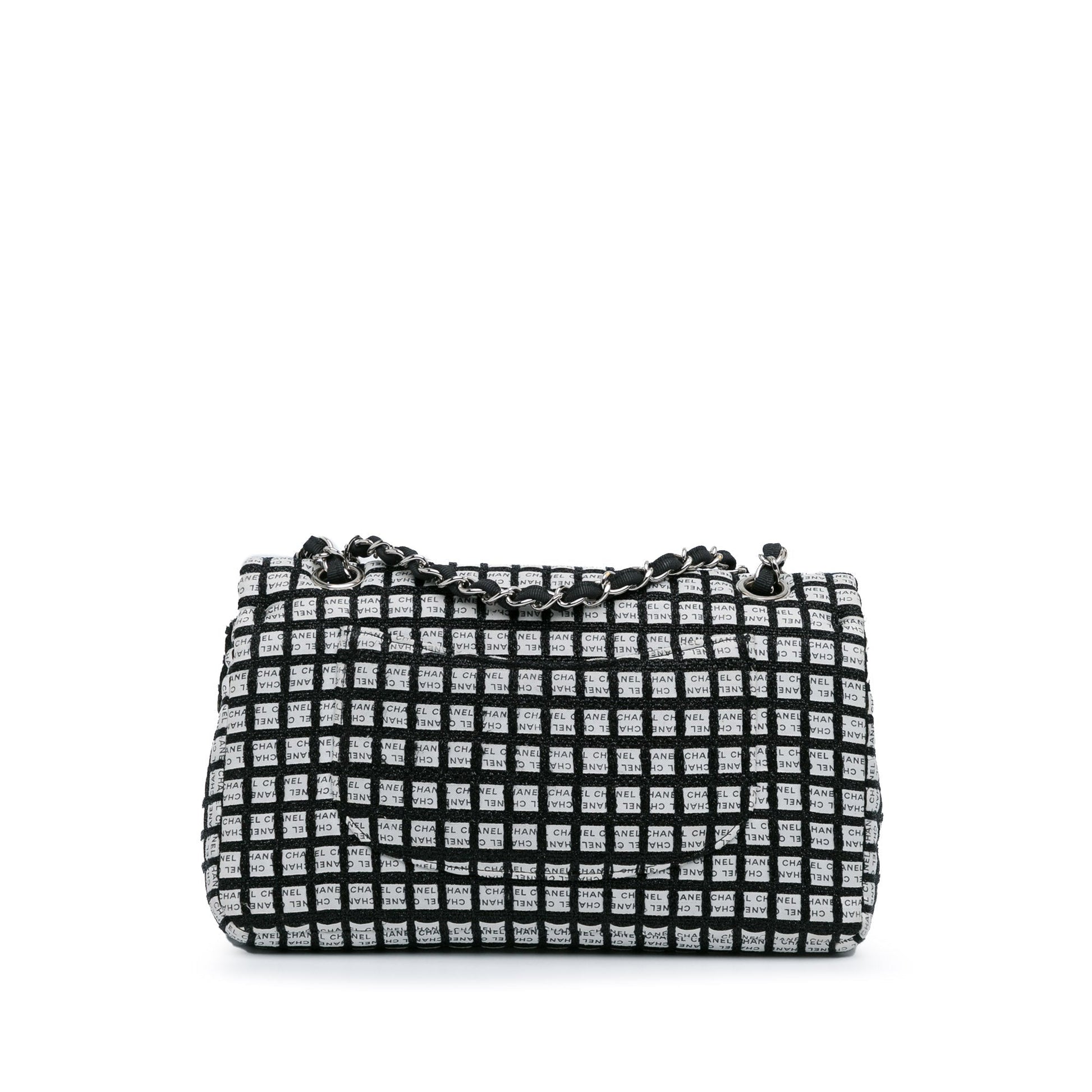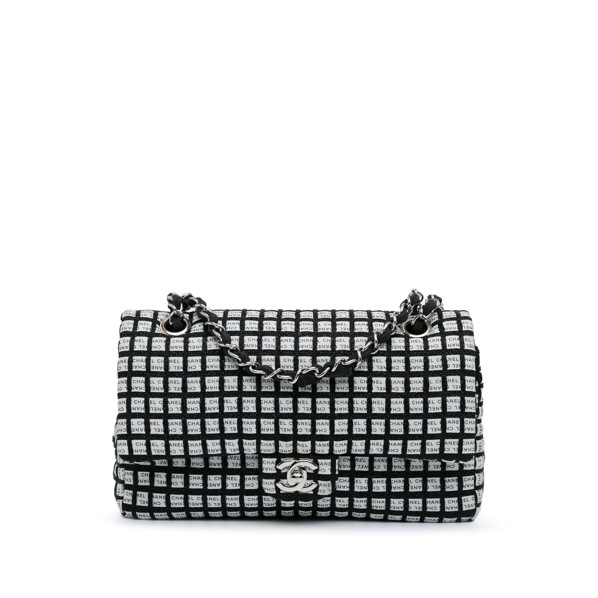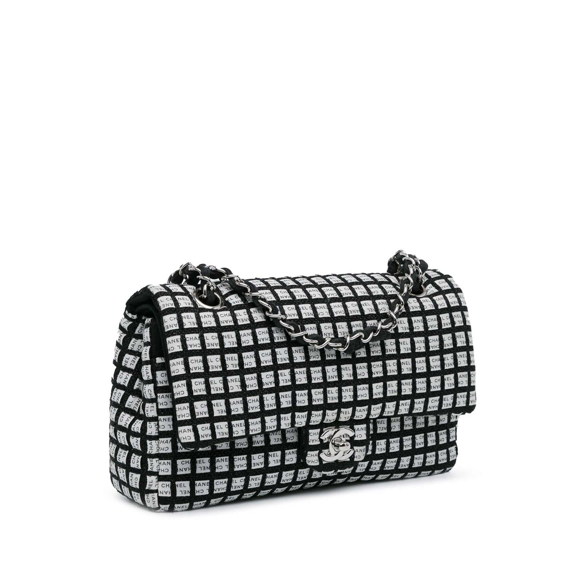 Product Details: White Chanel Medium Classic Ribbon Tweed Double Flap Shoulder Bag. This shoulder bag features a tweed and printed ribbon body, fabric-woven chain shoulder straps, double front flaps with CC turnlock closure, an exterior back slip pocket, and interior zip and slip pockets. 6.3" L x 10" W x 2.4" D, 9.1" drop. Serial number 19346440.