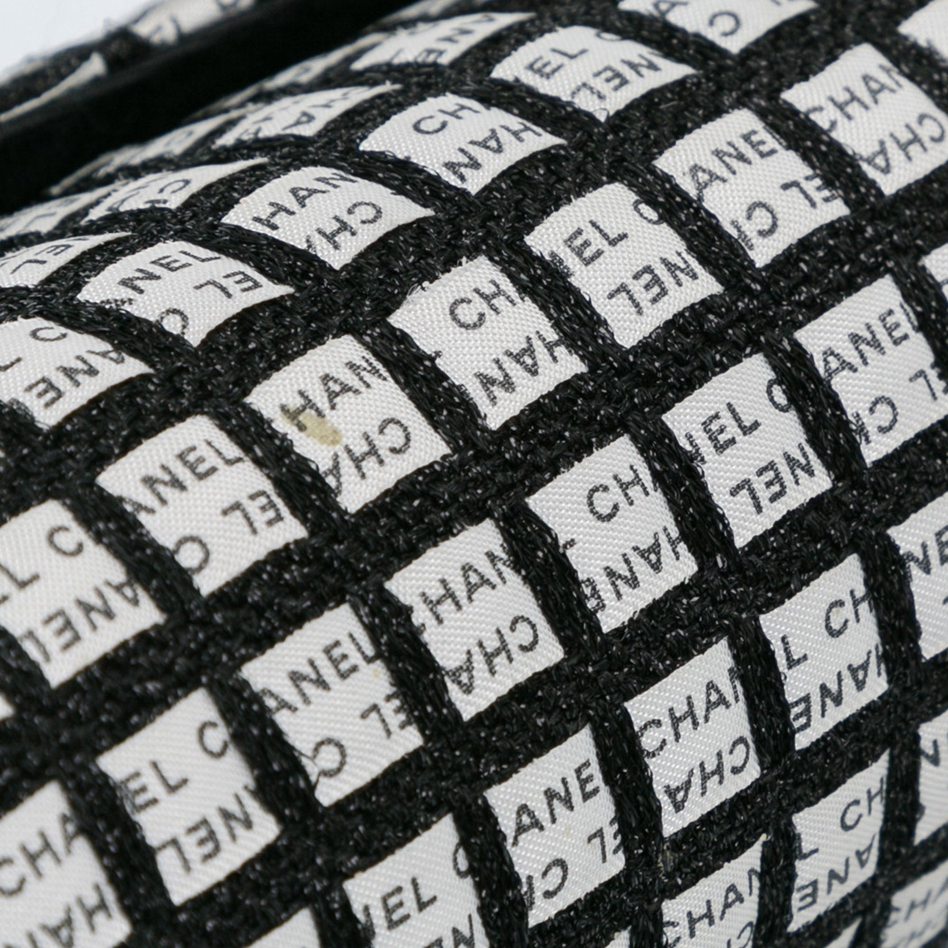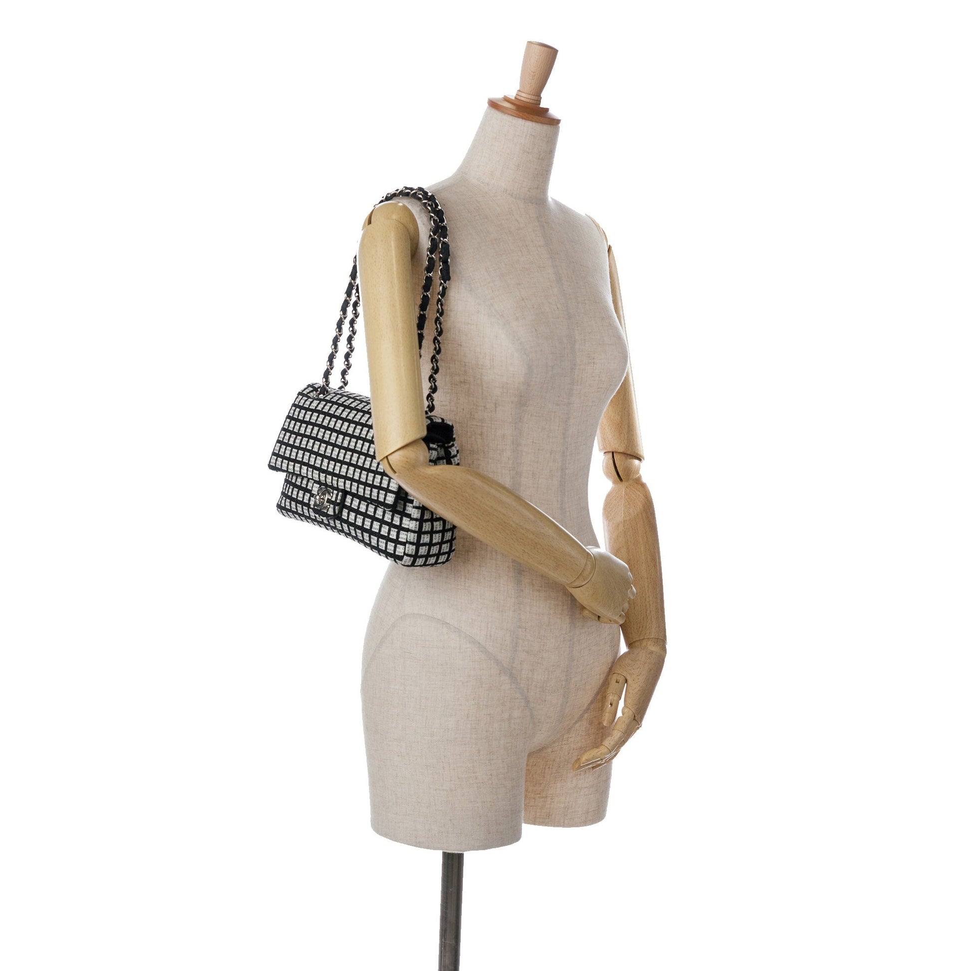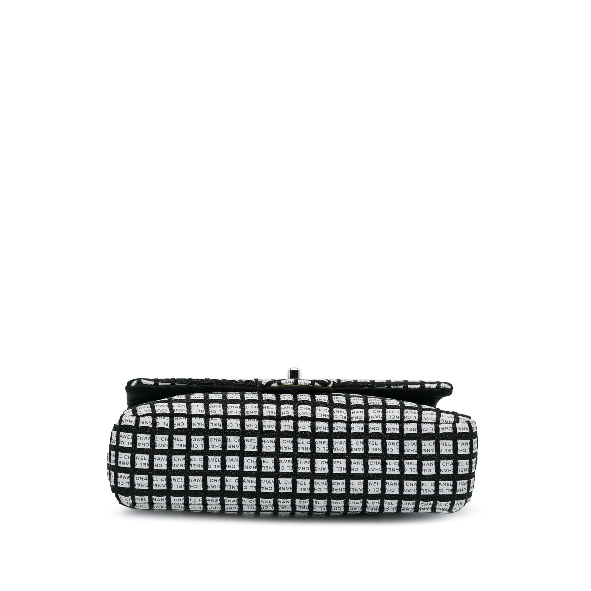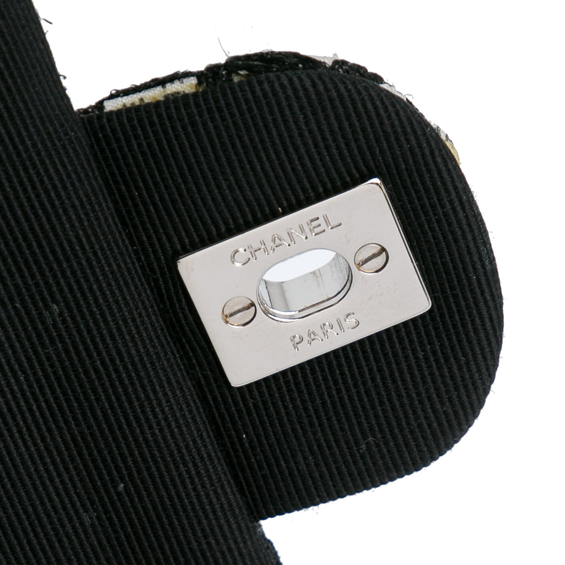 Product Details: White Chanel Medium Classic Ribbon Tweed Double Flap Shoulder Bag. This shoulder bag features a tweed and printed ribbon body, fabric-woven chain shoulder straps, double front flaps with CC turnlock closure, an exterior back slip pocket, and interior zip and slip pockets. 6.3" L x 10" W x 2.4" D, 9.1" drop. Serial number 19346440.