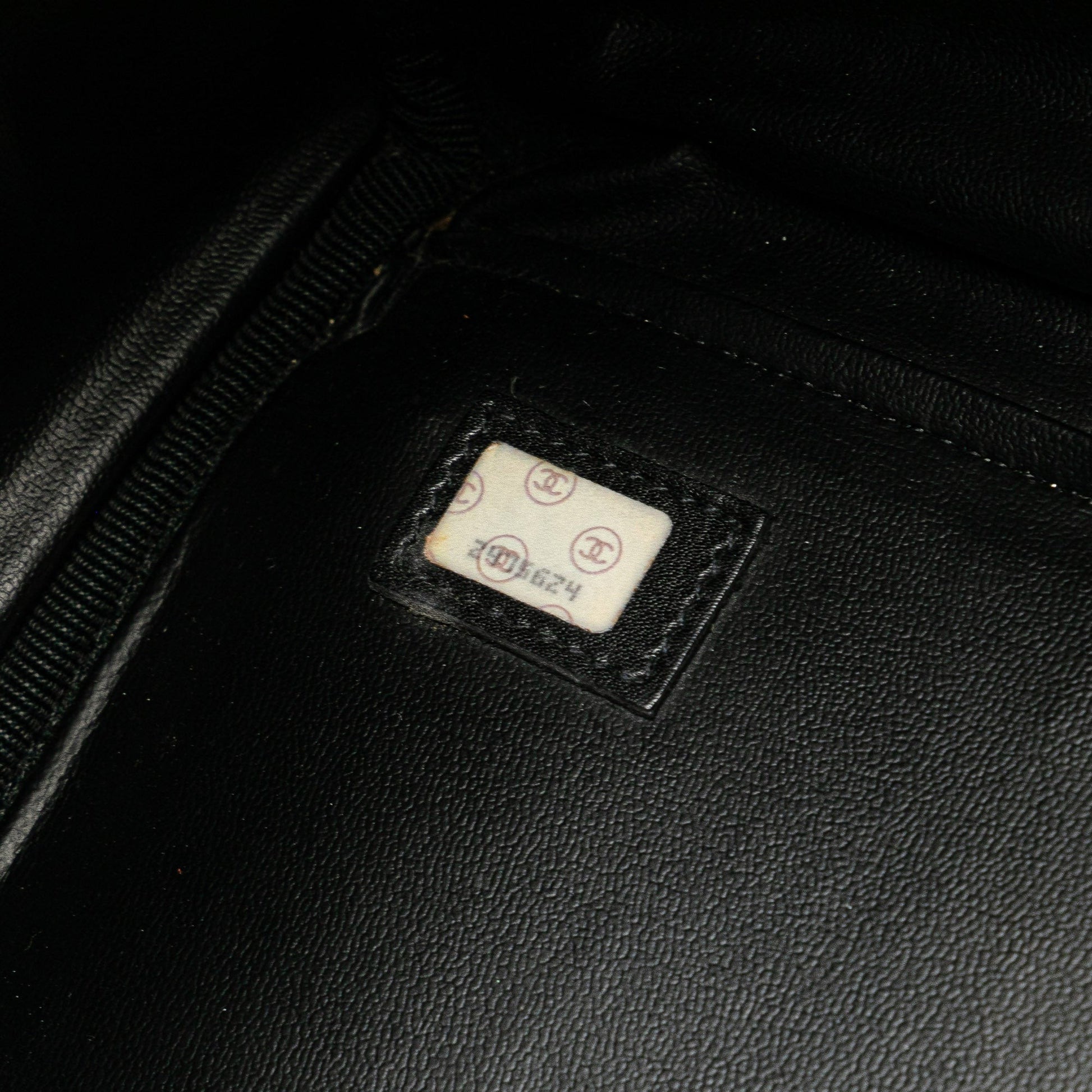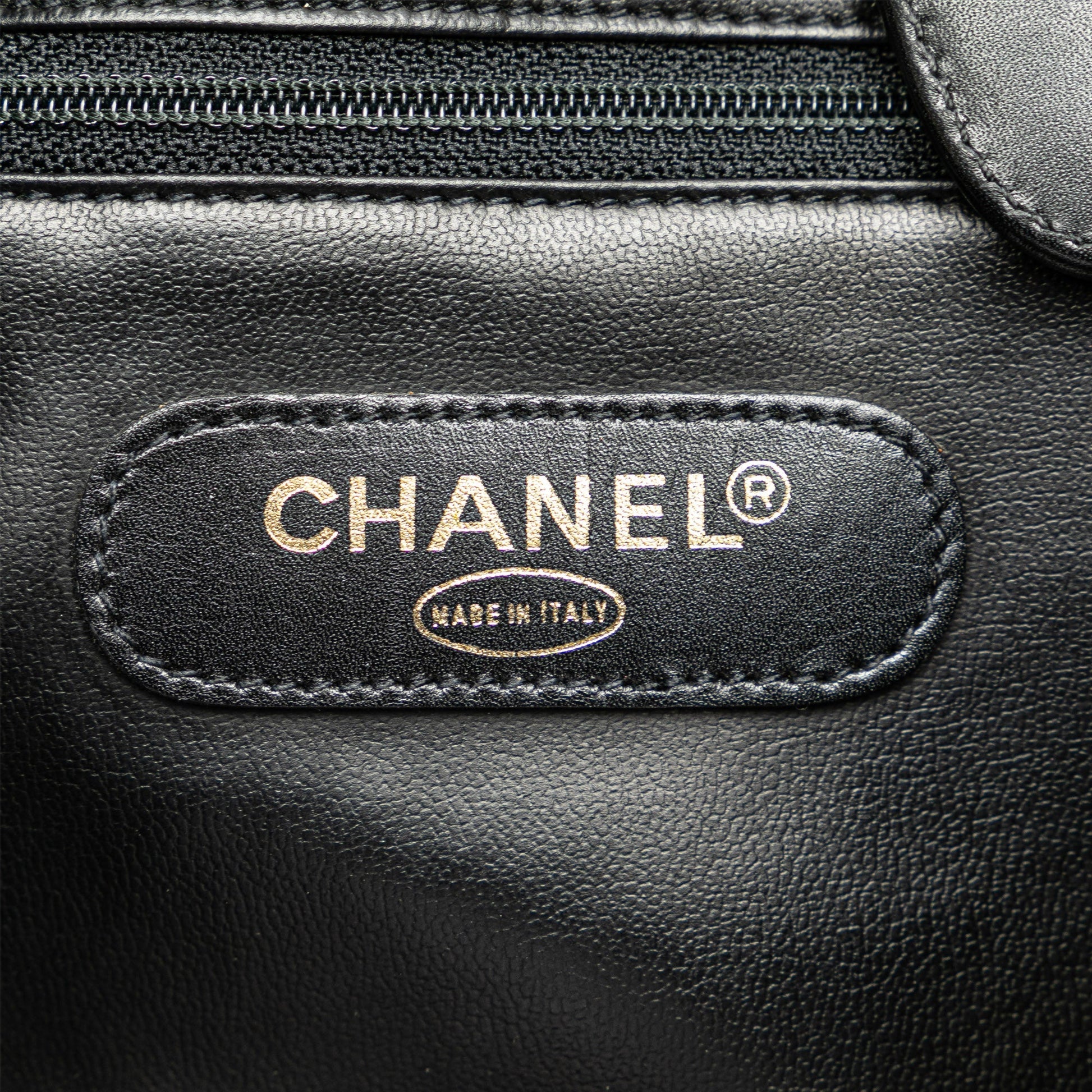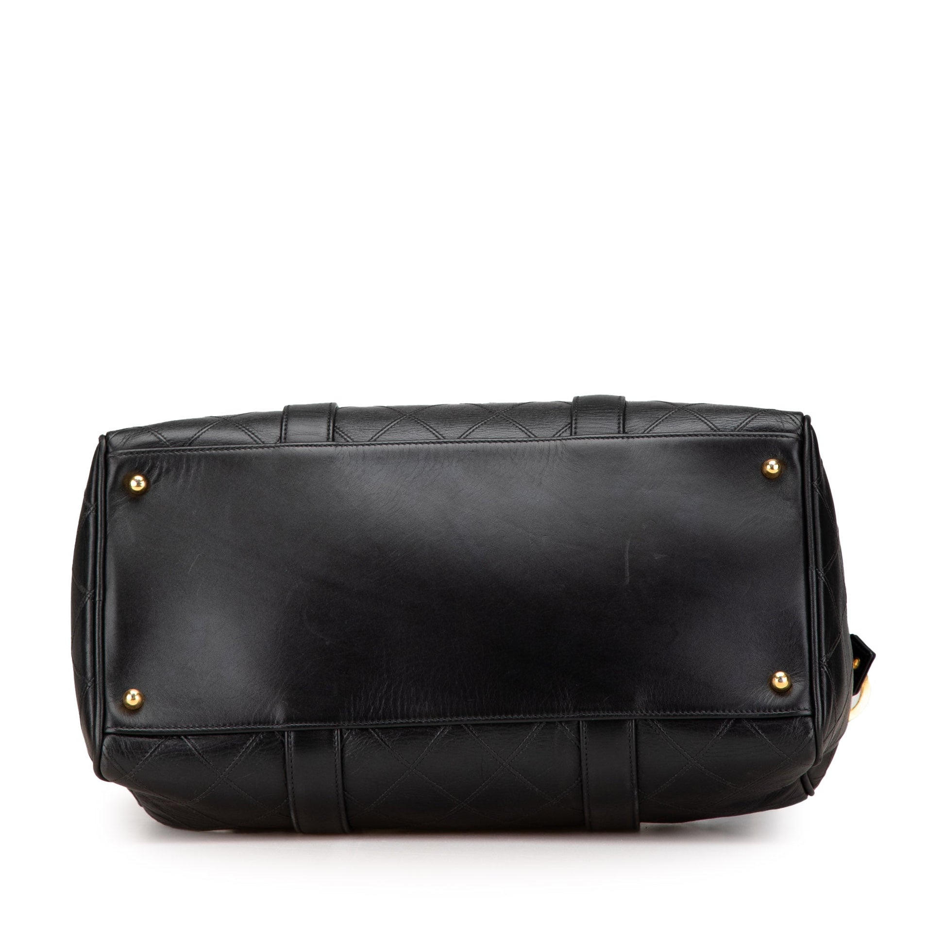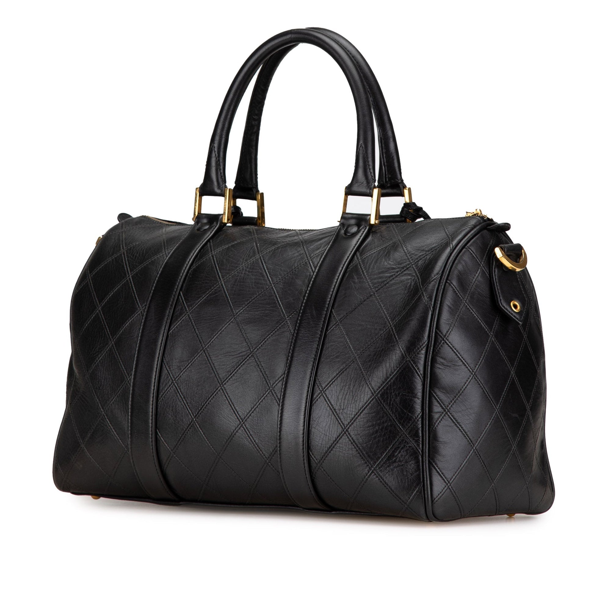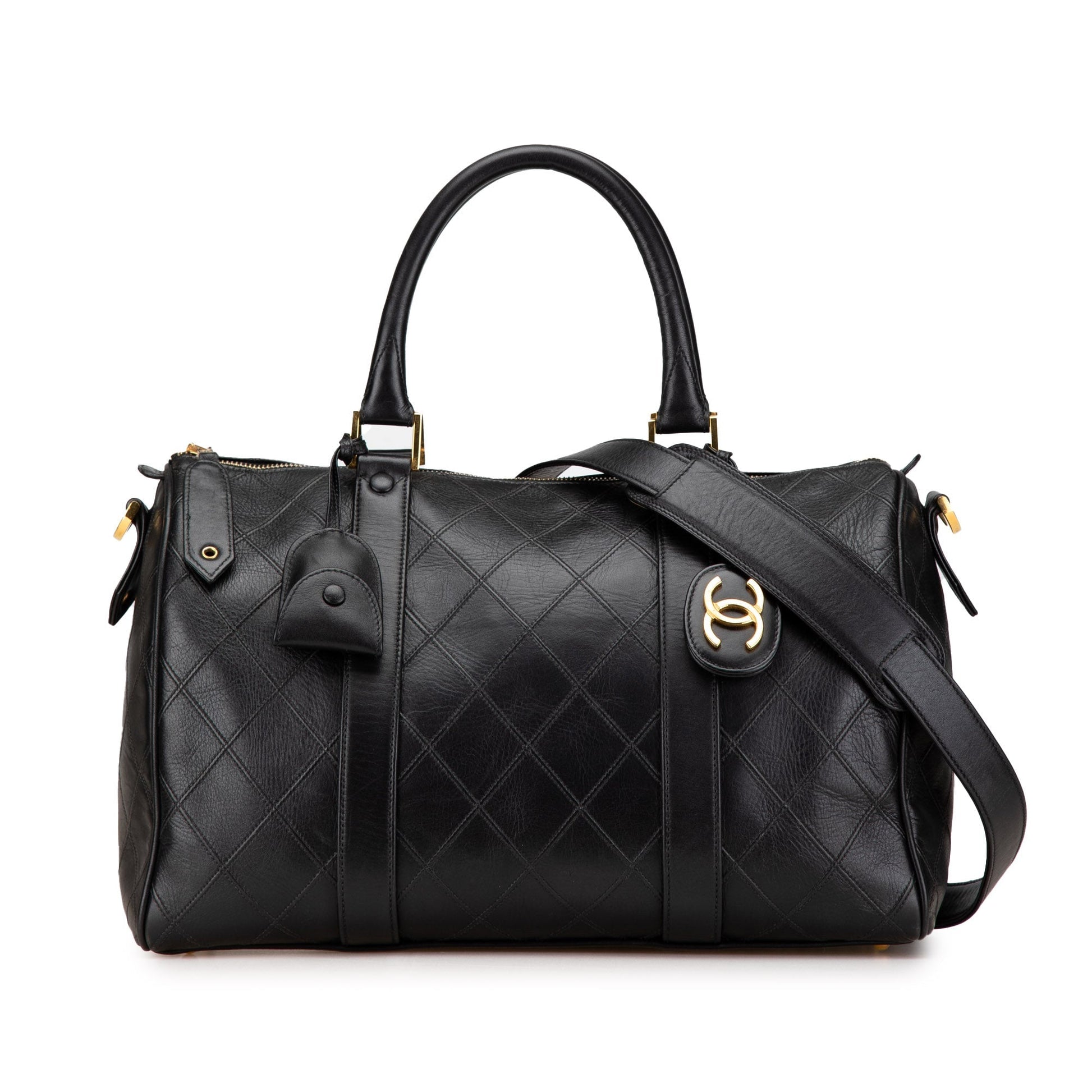 Product Details: Black Chanel Medium Diamond Stitch Lambskin Satchel. This satchel features a quilted lambskin leather body, rolled leather handles, a detachable flat leather strap, a top zip closure, interior zip and slip pockets. 7.9" L x 14" W x 6.7" D, 5.3" drop. Serial number 2905624.