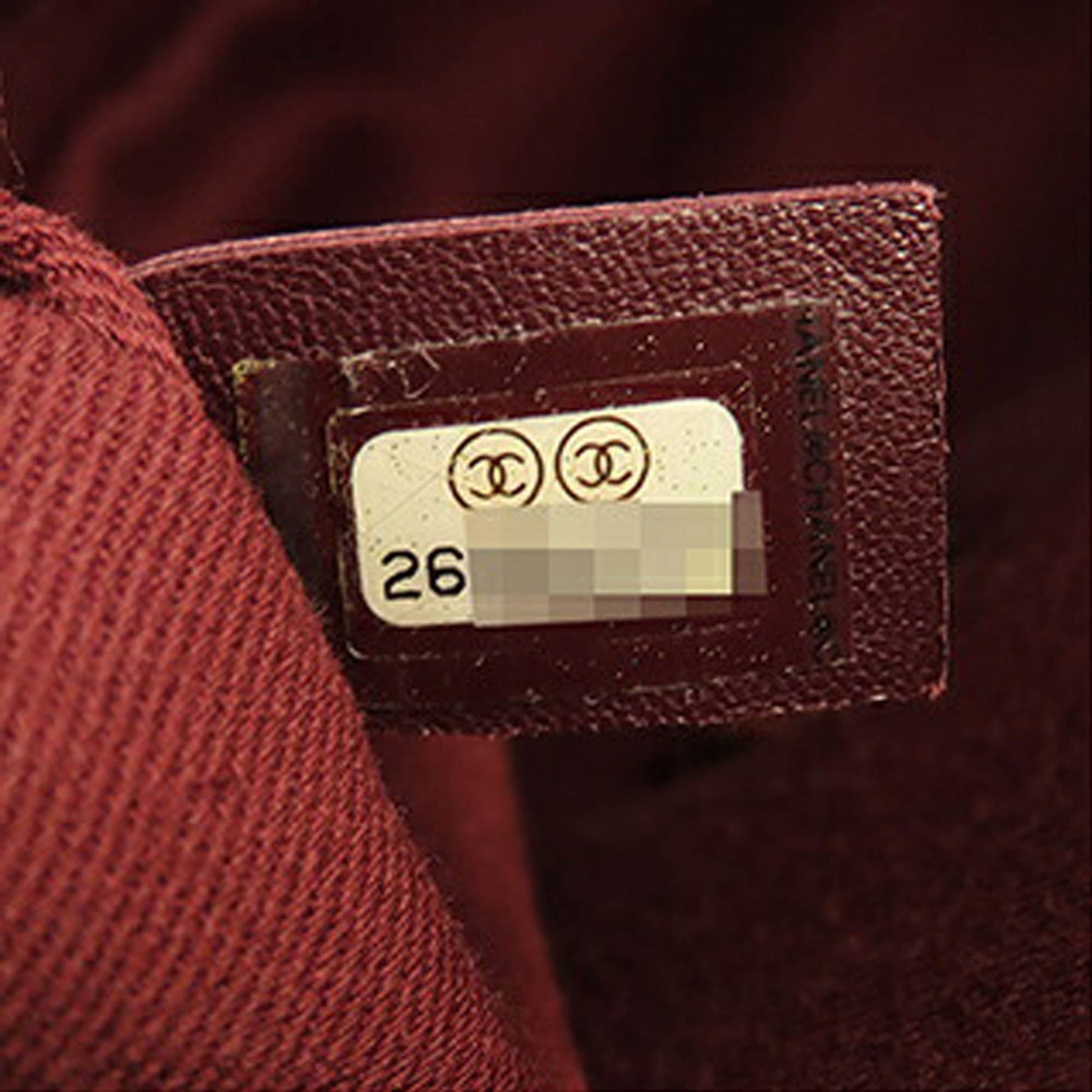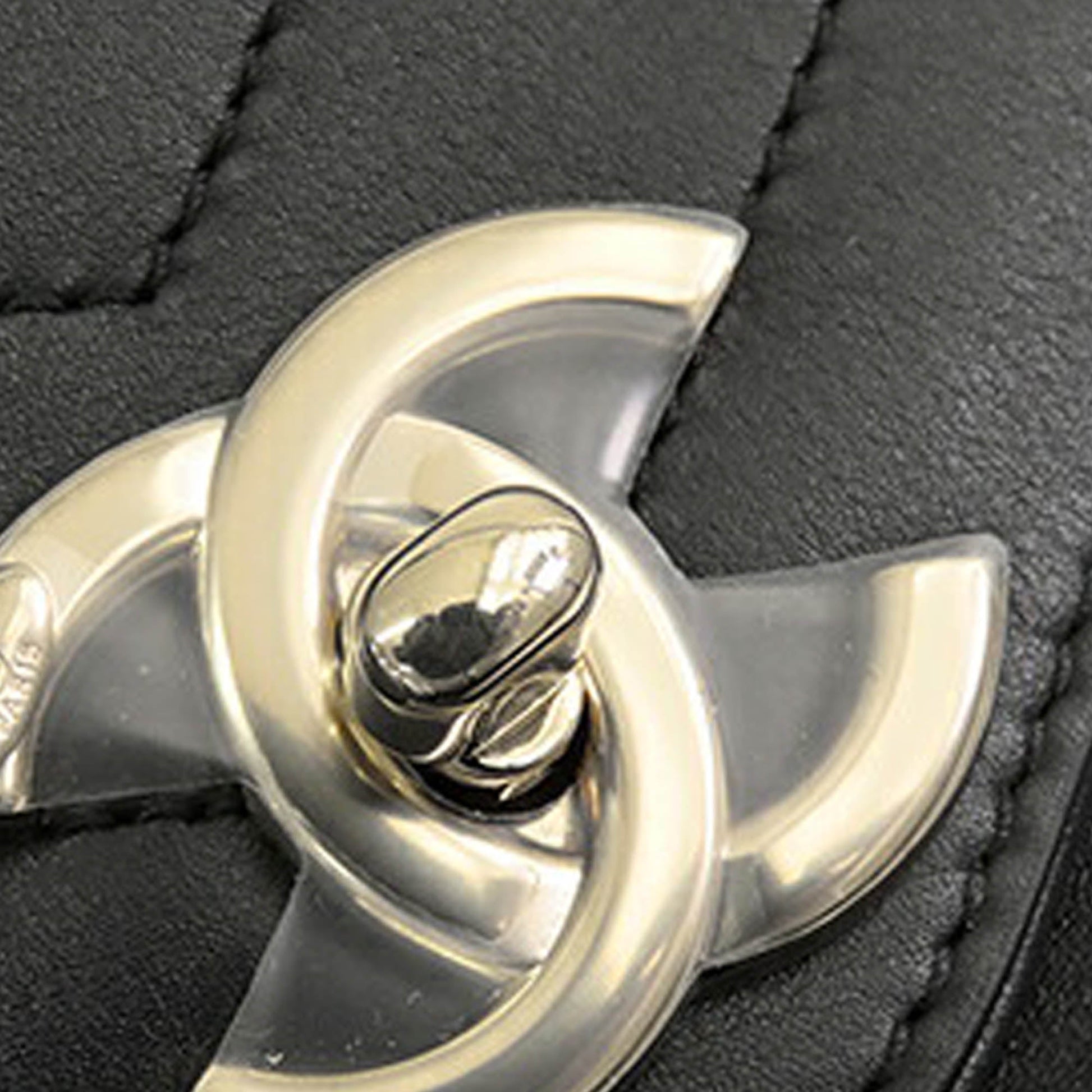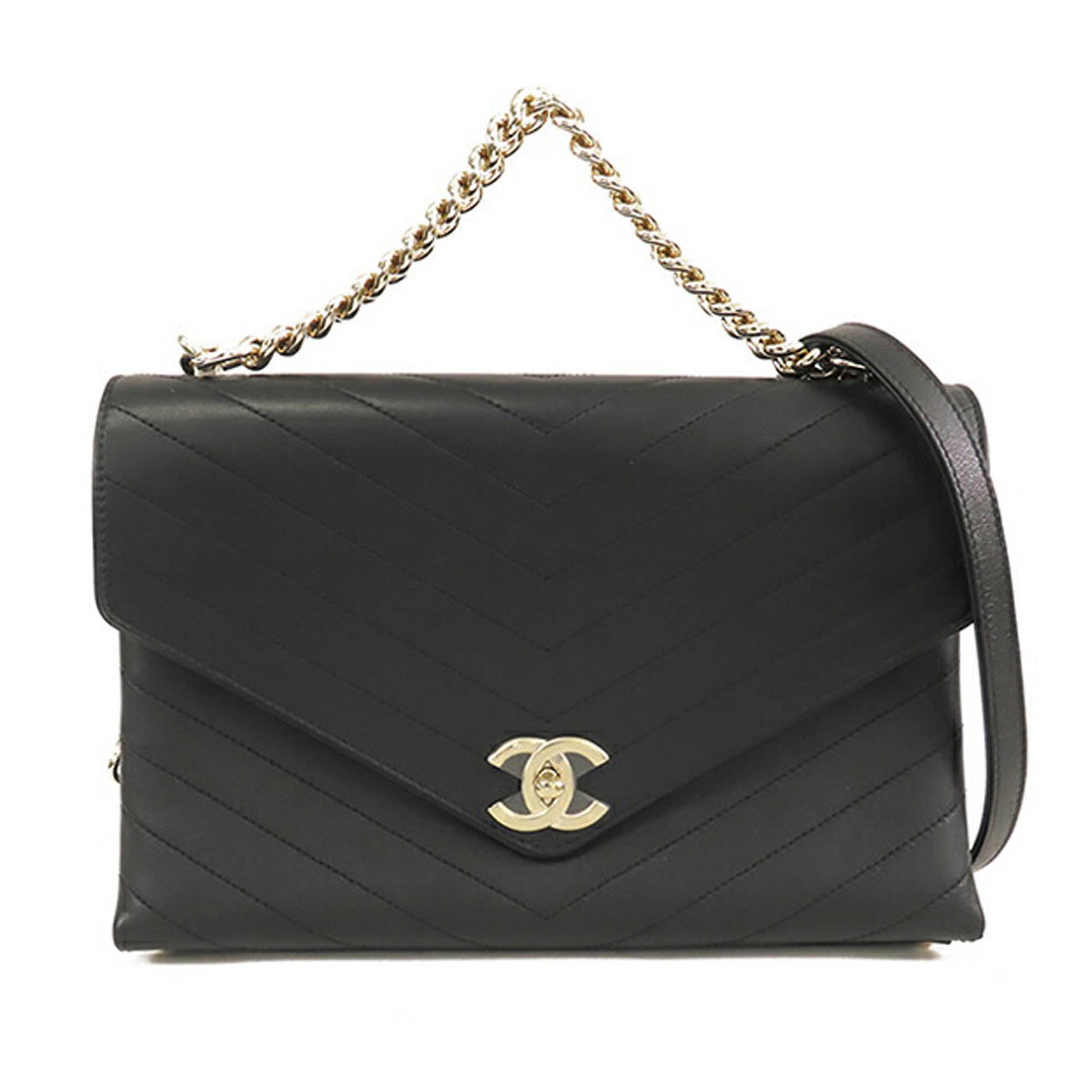 Product Details: Black Chanel Medium Lambskin Coco Chevron Envelope Flap Satchel. This satchel features a quilted leather body, a curb chain handle and strap, a front flap with twist lock closure, an exterior back slip pocket, and interior zip and slip compartments. 7.1" L x 11.2" W x 3.5" D, 5.5" drop. Serial number 26xxxxxx.