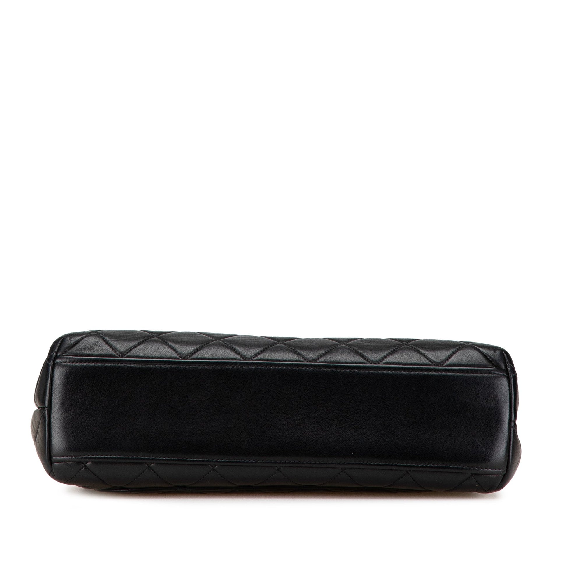 Product Details: Black Chanel Medium Lambskin Kelly Top Handle Bag. This handbag features a quilted lambskin leather body, a flat top handle, a top flap with CC turn-lock closure, an exterior back slip pocket, and interior zip and slip pockets. 7.1" L x 9.8" W x 2.2" D, 2.2" drop. Serial number 4385230.