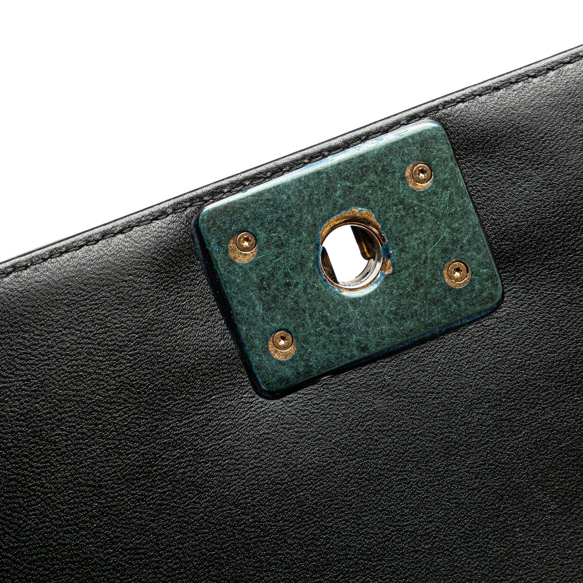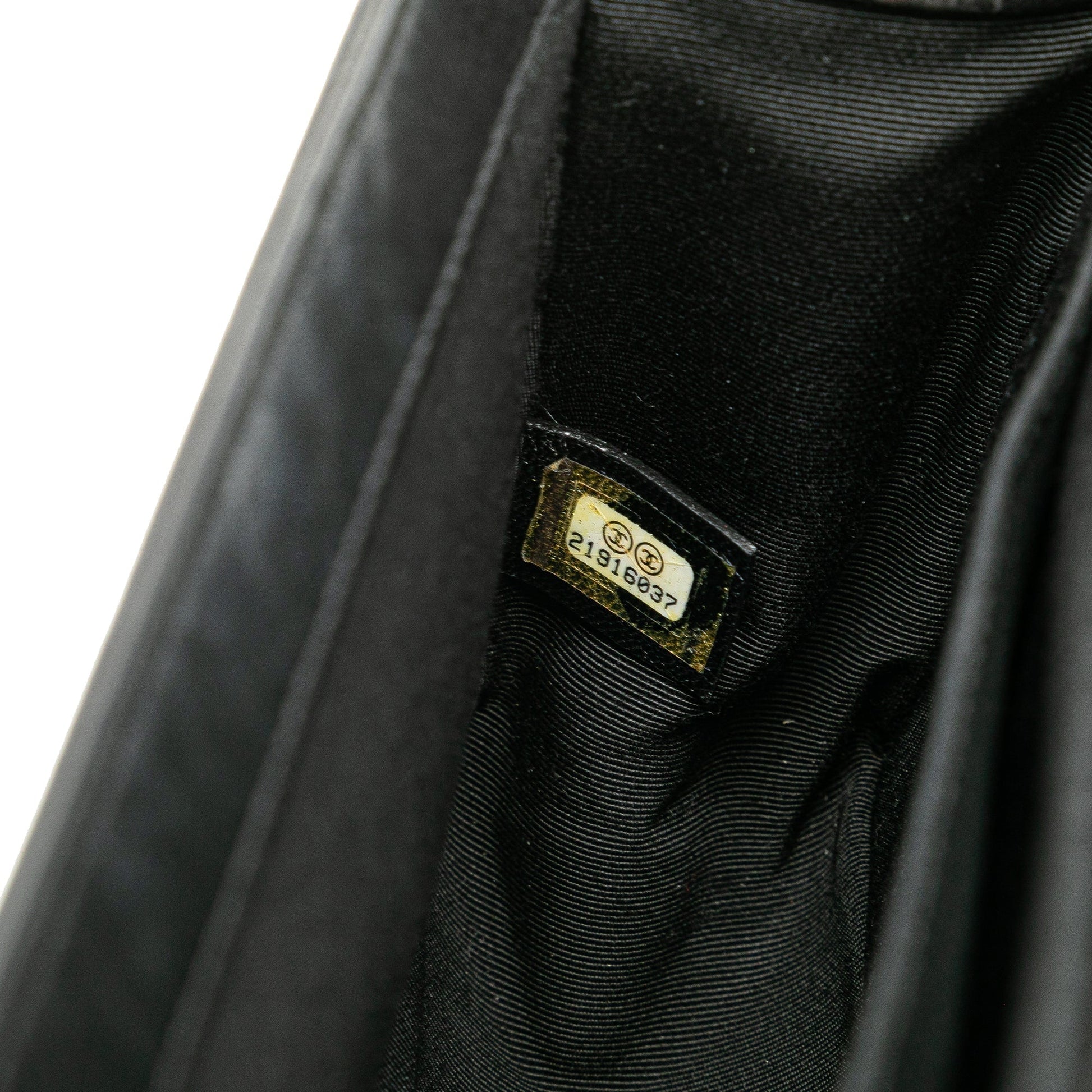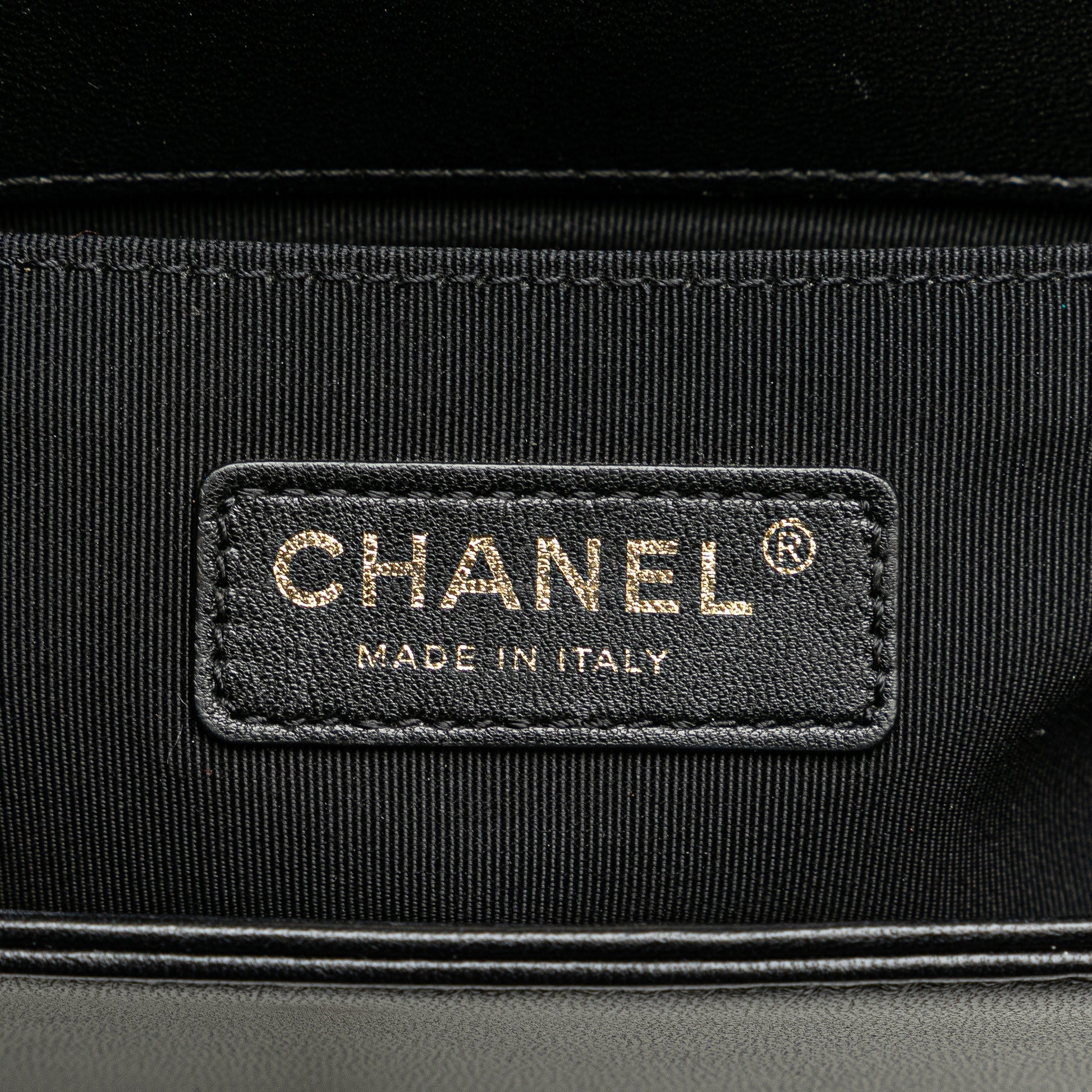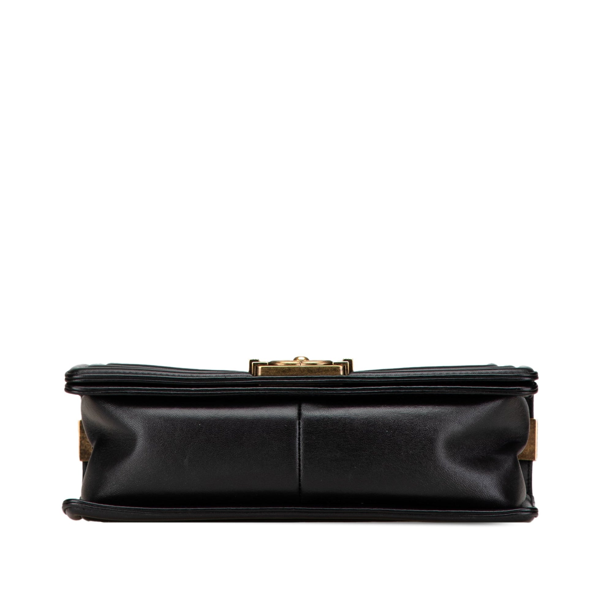 Product Details: Black Chanel Medium Multicolor Lambskin Crest Boy Flap Crossbody Bag. The Boy features a quilted lambskin leather body, a gold-tone chain strap, a top flap with turn lock closure, and interior slip pockets. 5.9" L x 9.8" W x 2.8" D. Serial number 21916037.