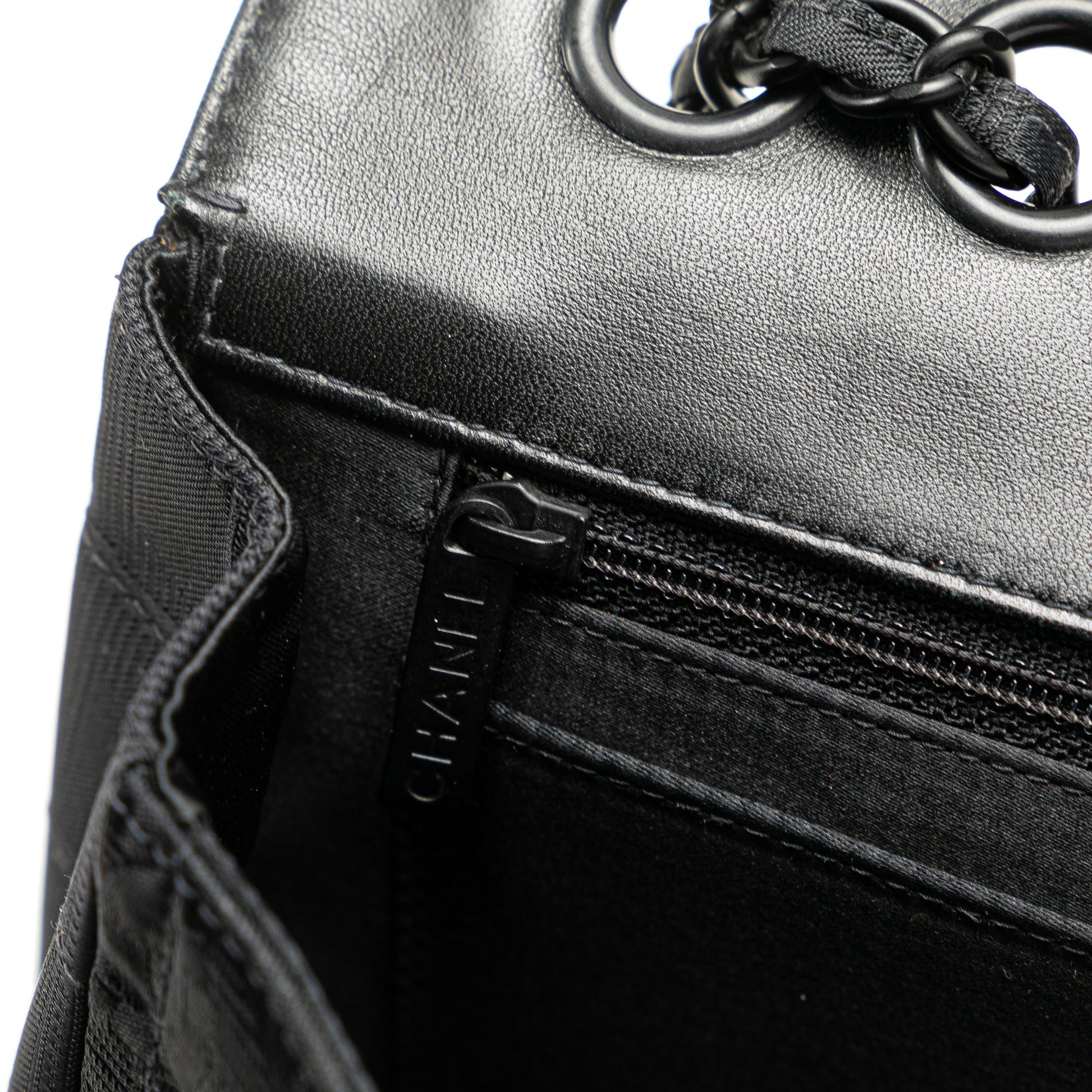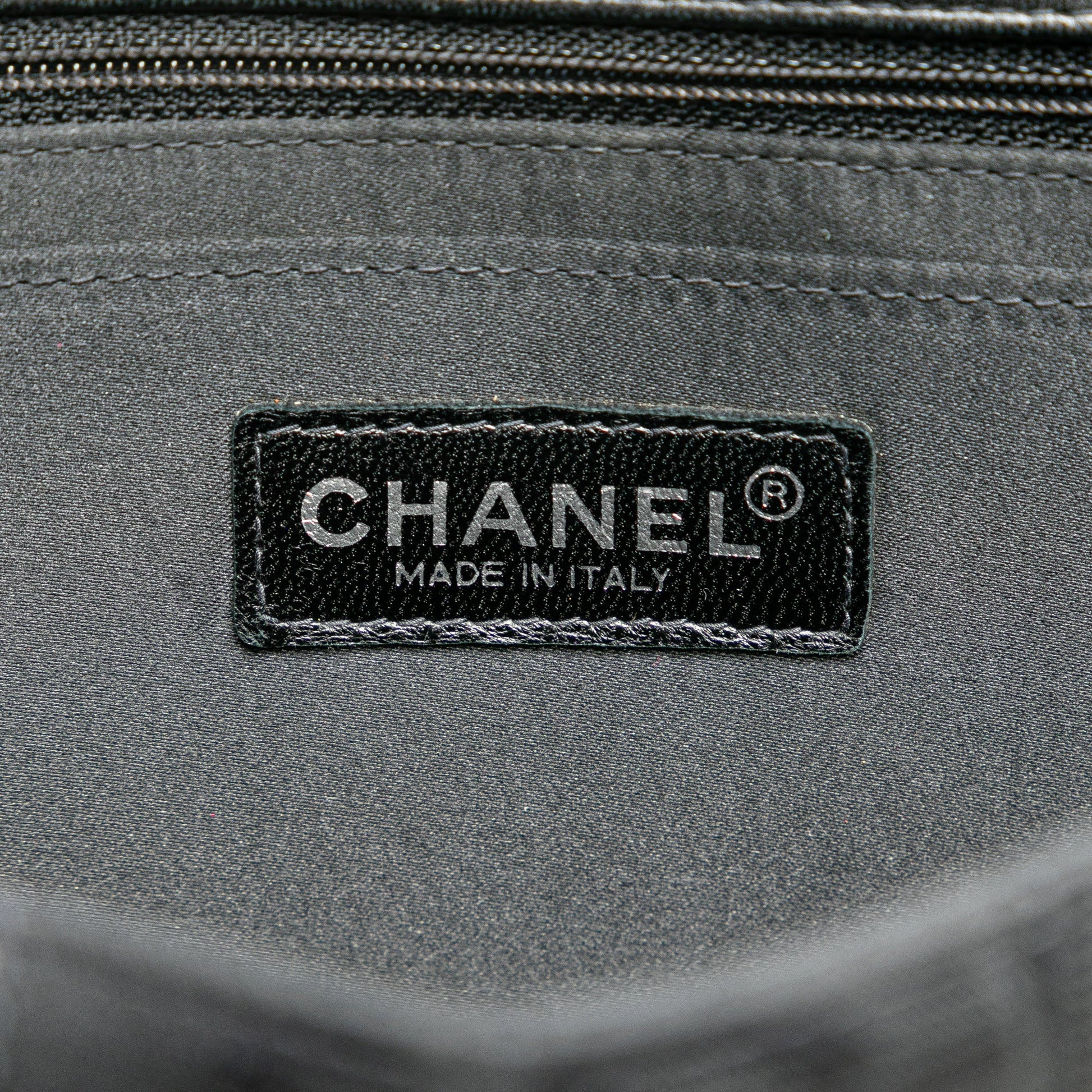 Product Details: Black Chanel Medium New Travel Line Single Flap Shoulder Bag. This shoulder bag features a nylon body, nylon wove chain straps, a front flap with interlocking Cs and a twist lock closure, a back exterior slip pocket, and interior slip and zip pockets. The strap is repaired. 5.9" L x 10" W x 2.4" D. Serial number 7501437.