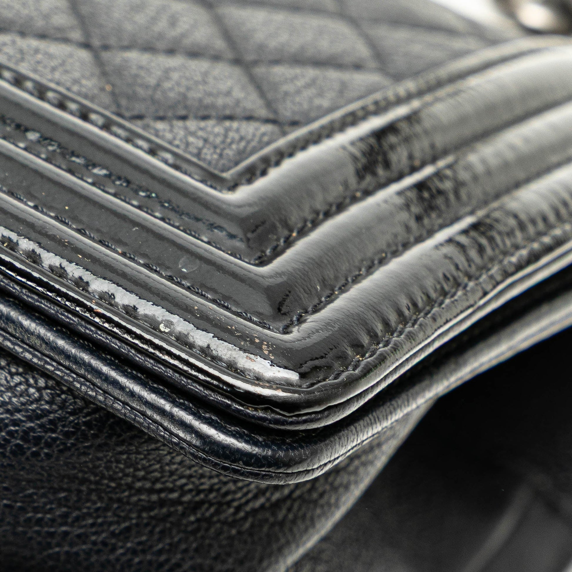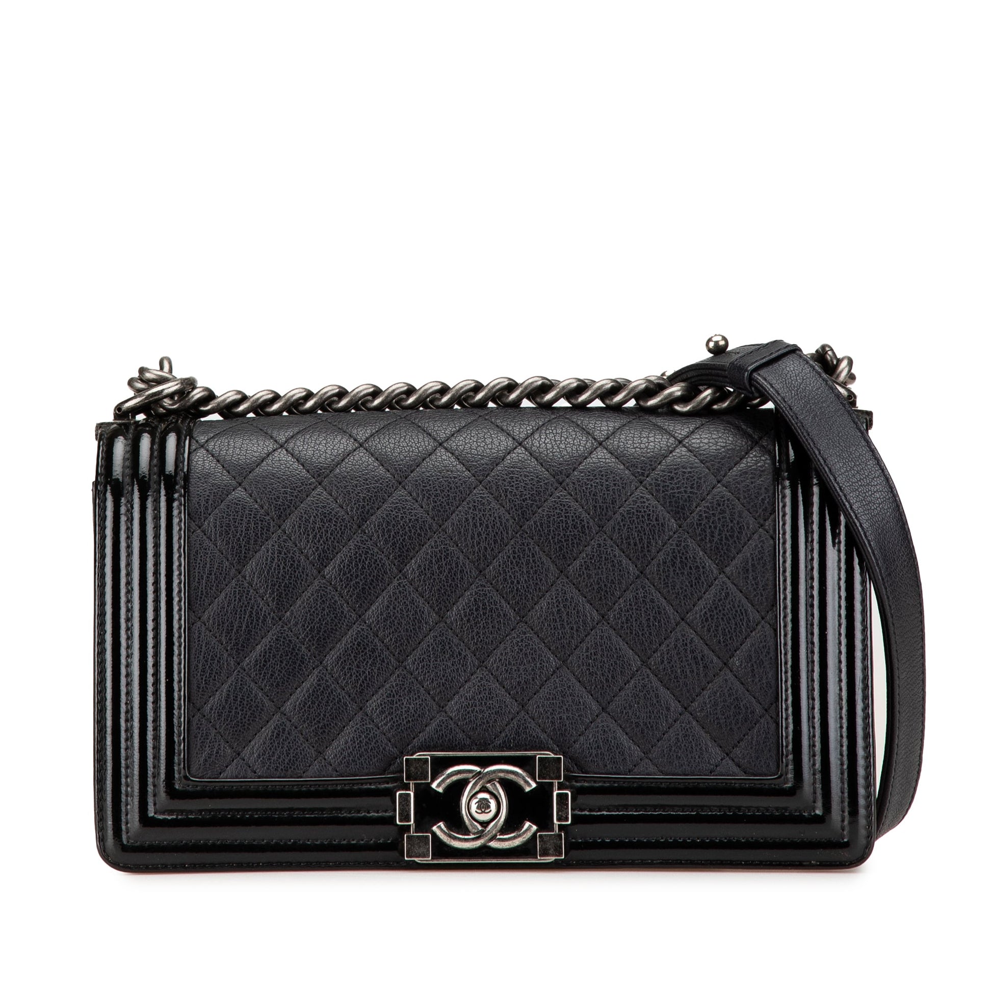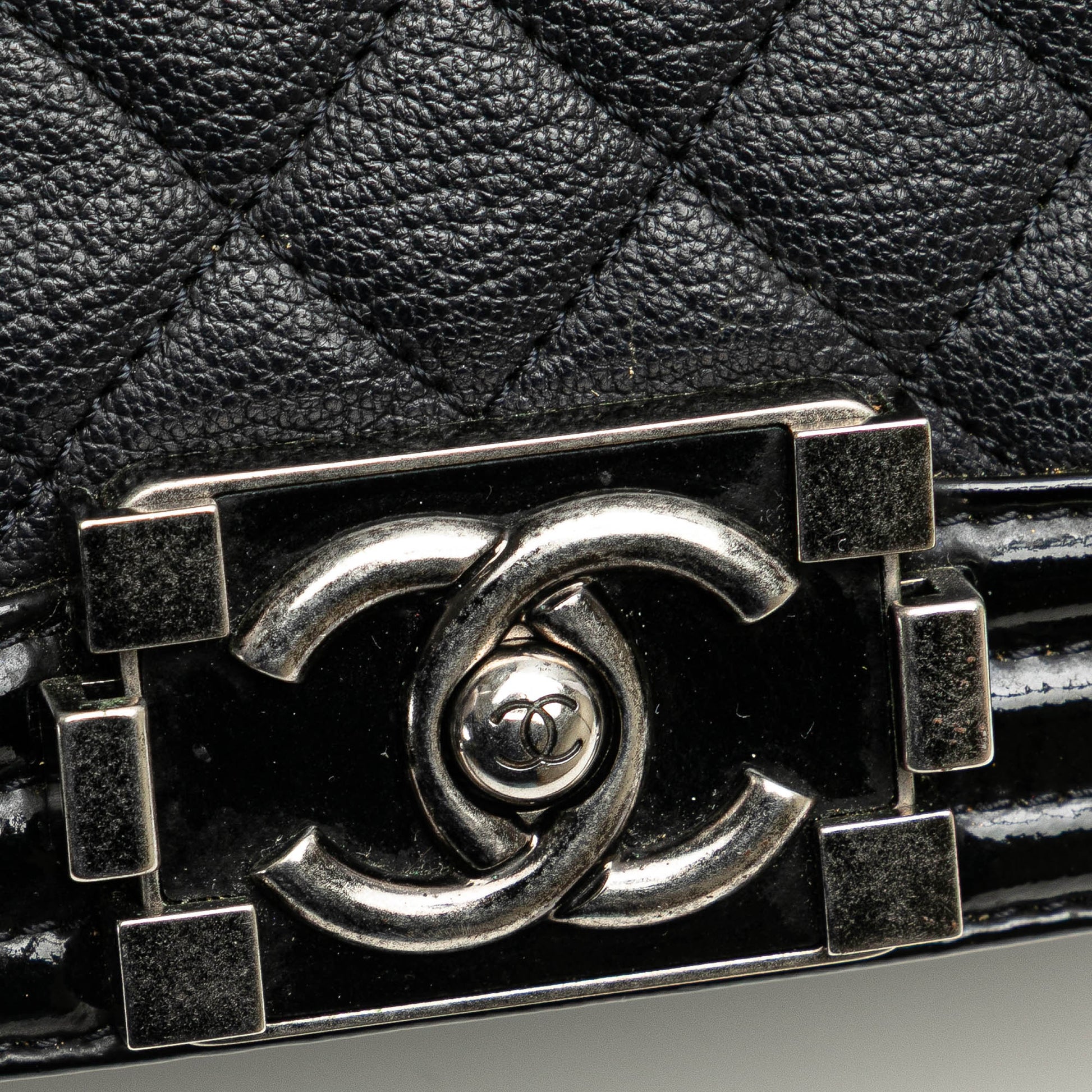 Product Details: Black Chanel Medium Quilted Goatskin and Patent Boy Flap Crossbody Bag. The Boy flap bag features a quilted goatskin body with patent leather trim, a chain and leather shoulder strap, a front flap with an interlocking CC push-lock closure, and an interior slip pocket. 6.3" L x 9.8" W x 2.8" D, 10.6" drop. Serial number 21421395.