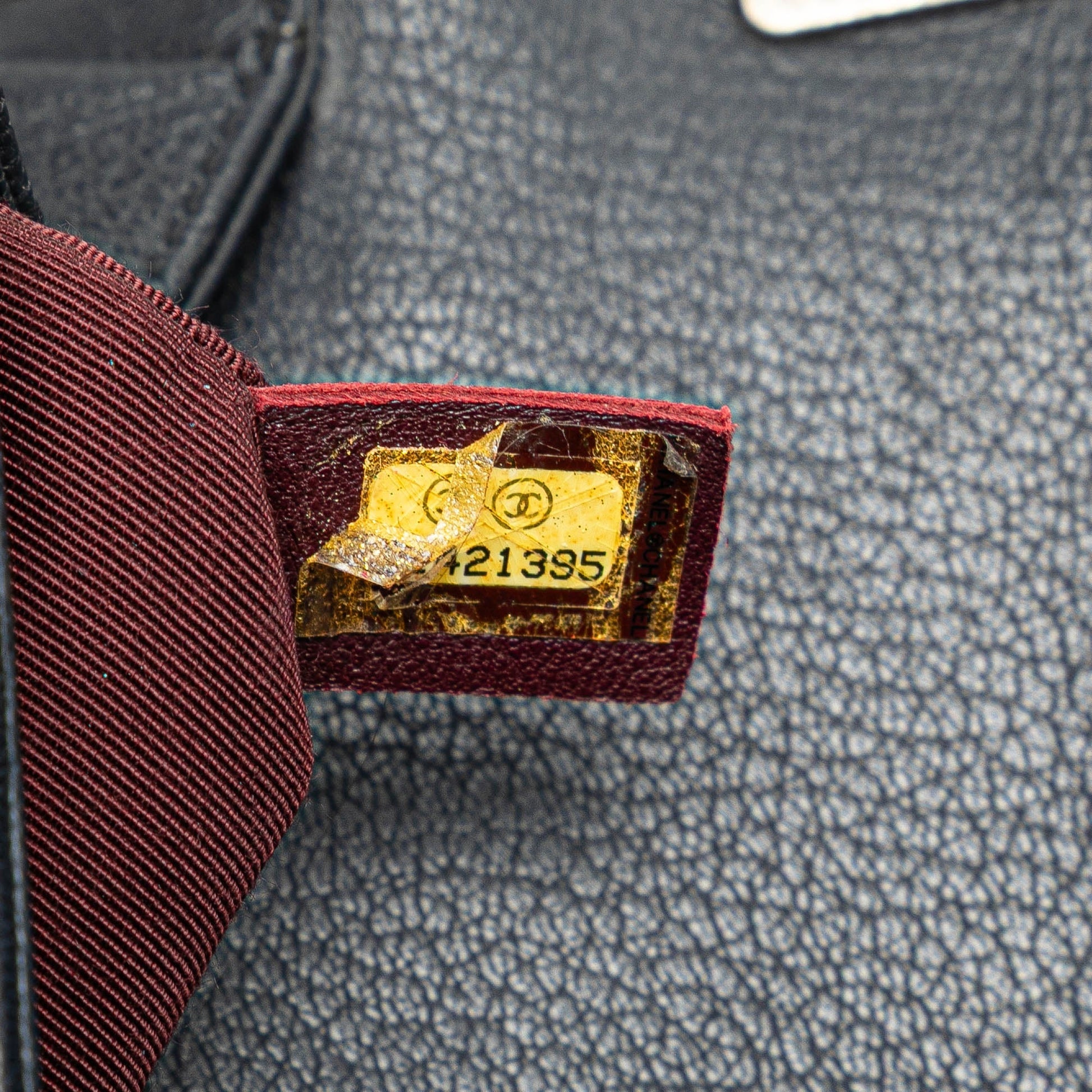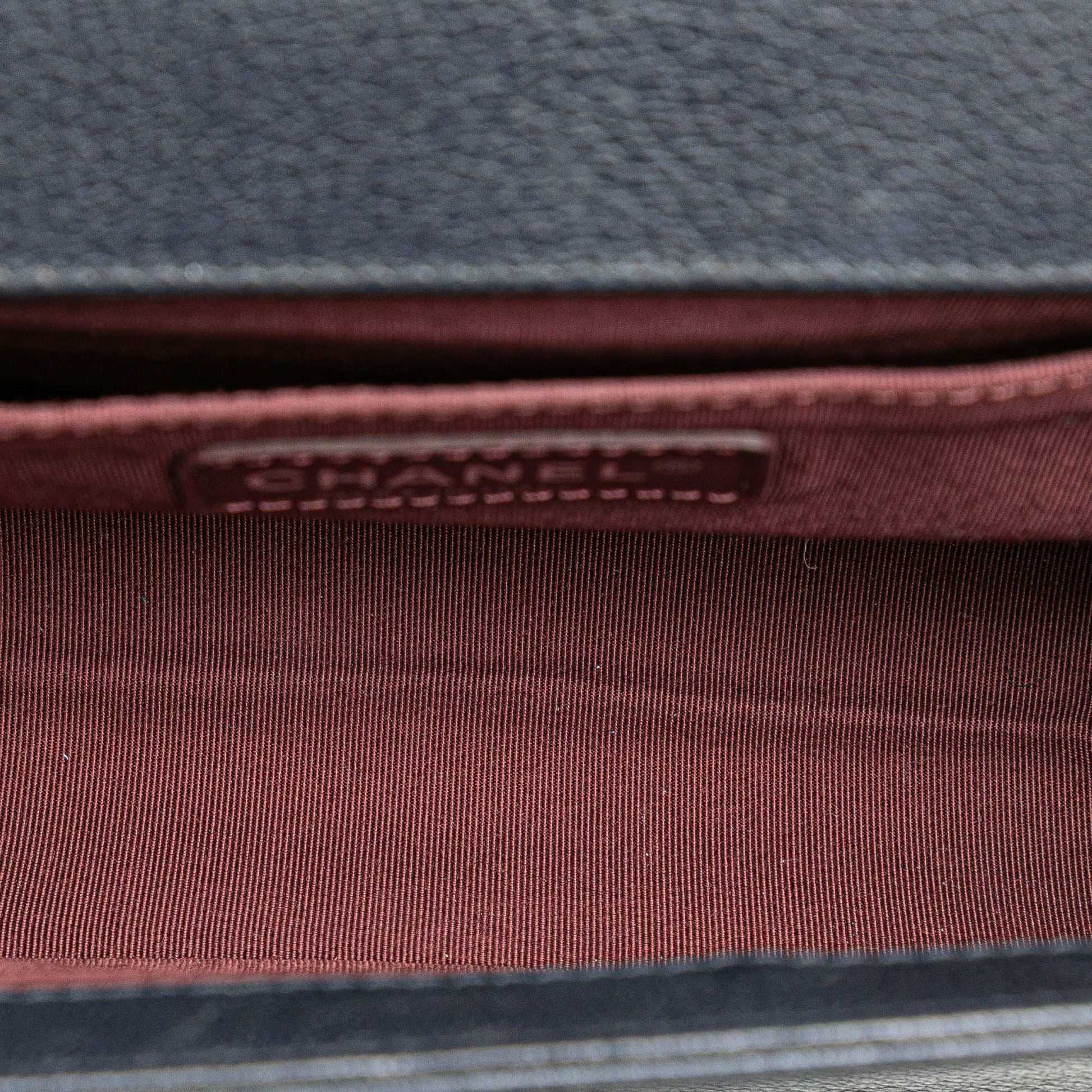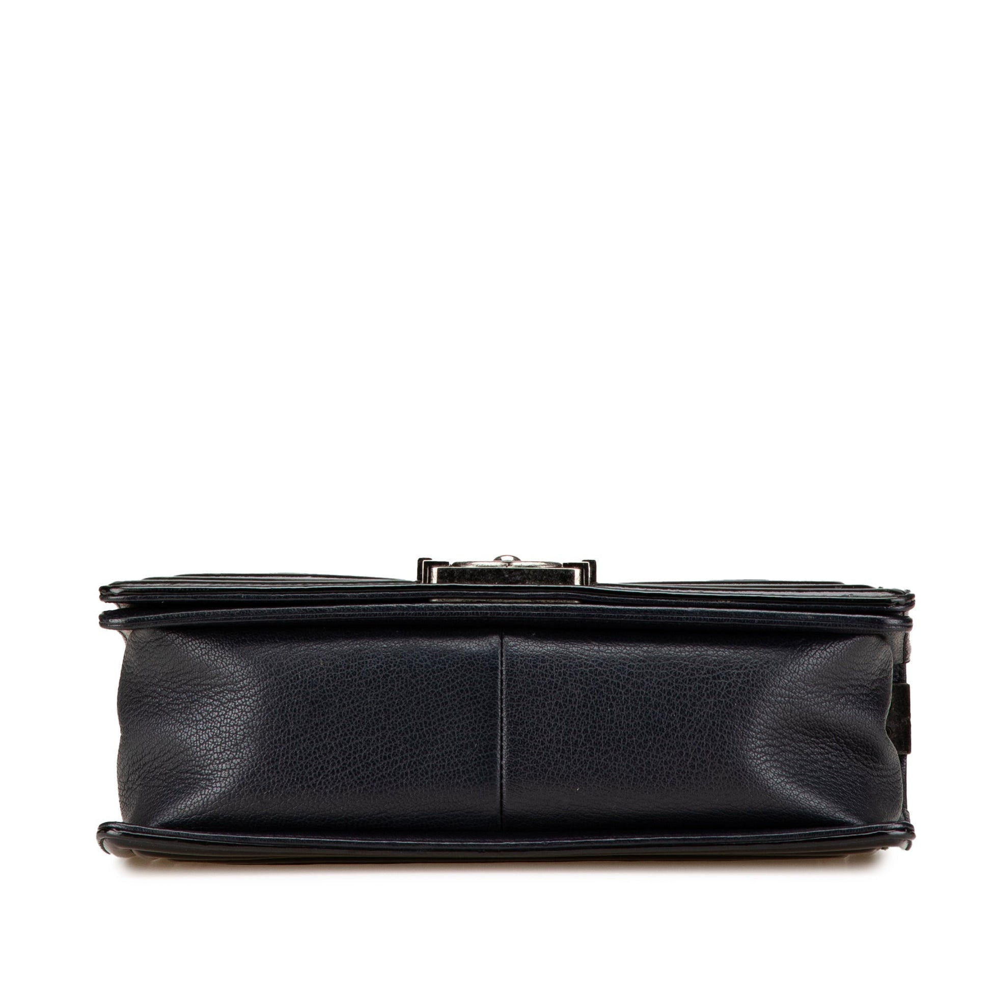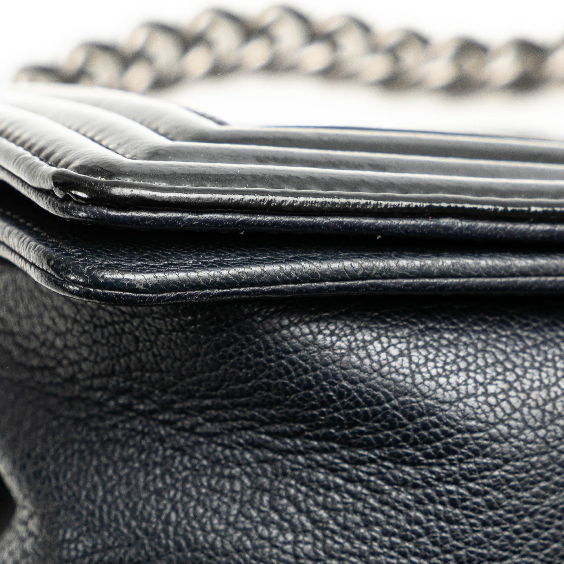 Product Details: Black Chanel Medium Quilted Goatskin and Patent Boy Flap Crossbody Bag. The Boy flap bag features a quilted goatskin body with patent leather trim, a chain and leather shoulder strap, a front flap with an interlocking CC push-lock closure, and an interior slip pocket. 6.3" L x 9.8" W x 2.8" D, 10.6" drop. Serial number 21421395.