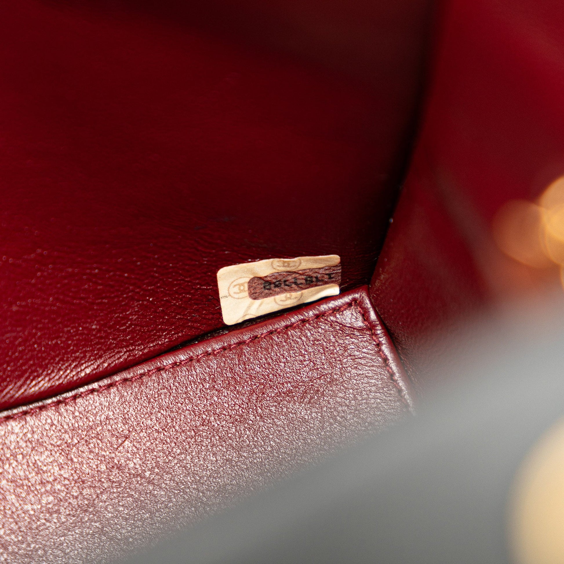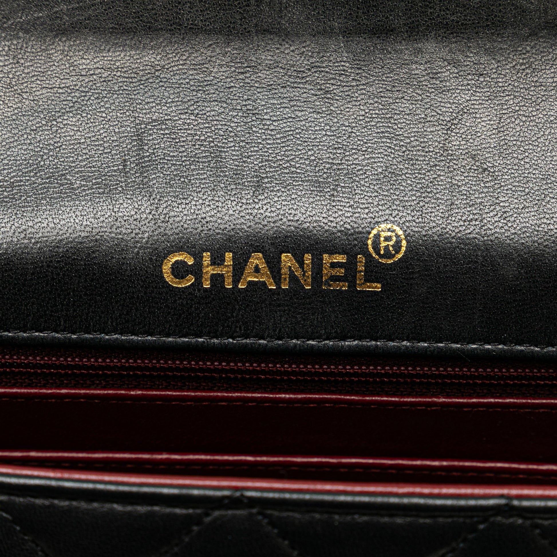 Product Details: Black Chanel Medium Reissue 2.55 Quilted Lambskin Single Flap Shoulder Bag. This flap features a quilted lambskin body, leather woven chain straps, a front flap with turn lock closure, an exterior back slip pocket, and interior zip and slip pockets. Strap is repaired. 7.1" L x 10.2" W x 3.1" D. Serial number 1787798.