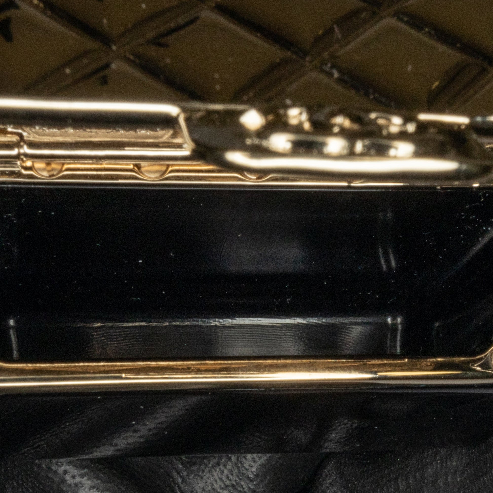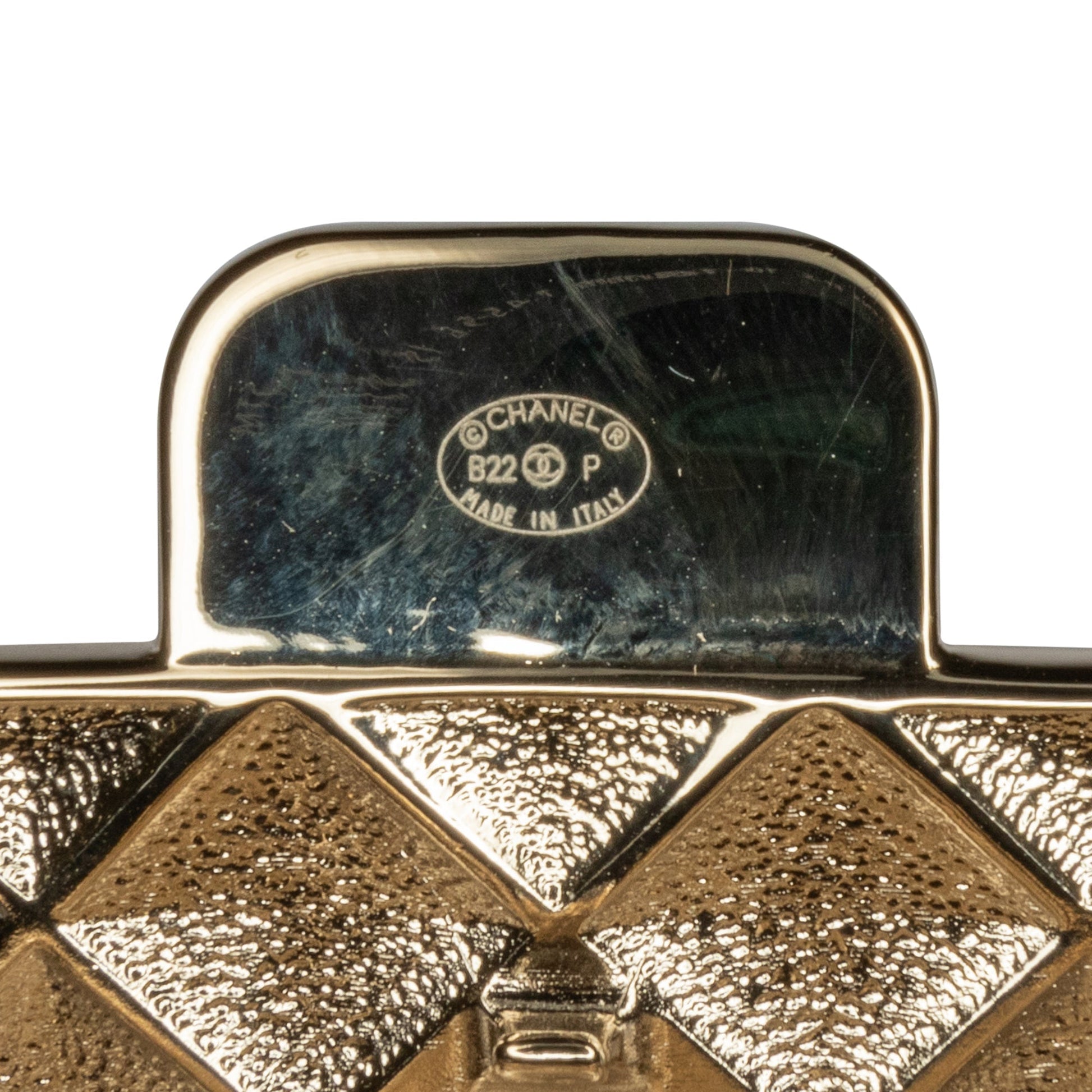 Product Details: Black Chanel Metal And Resin Chain Flap Pendant Necklace. This necklace features a gold-plated metal and resin body, a leather-woven chain shoulder strap, and a top flap closure. 2" L x 2.4" W x 1.2" D. Serial number B22 P.