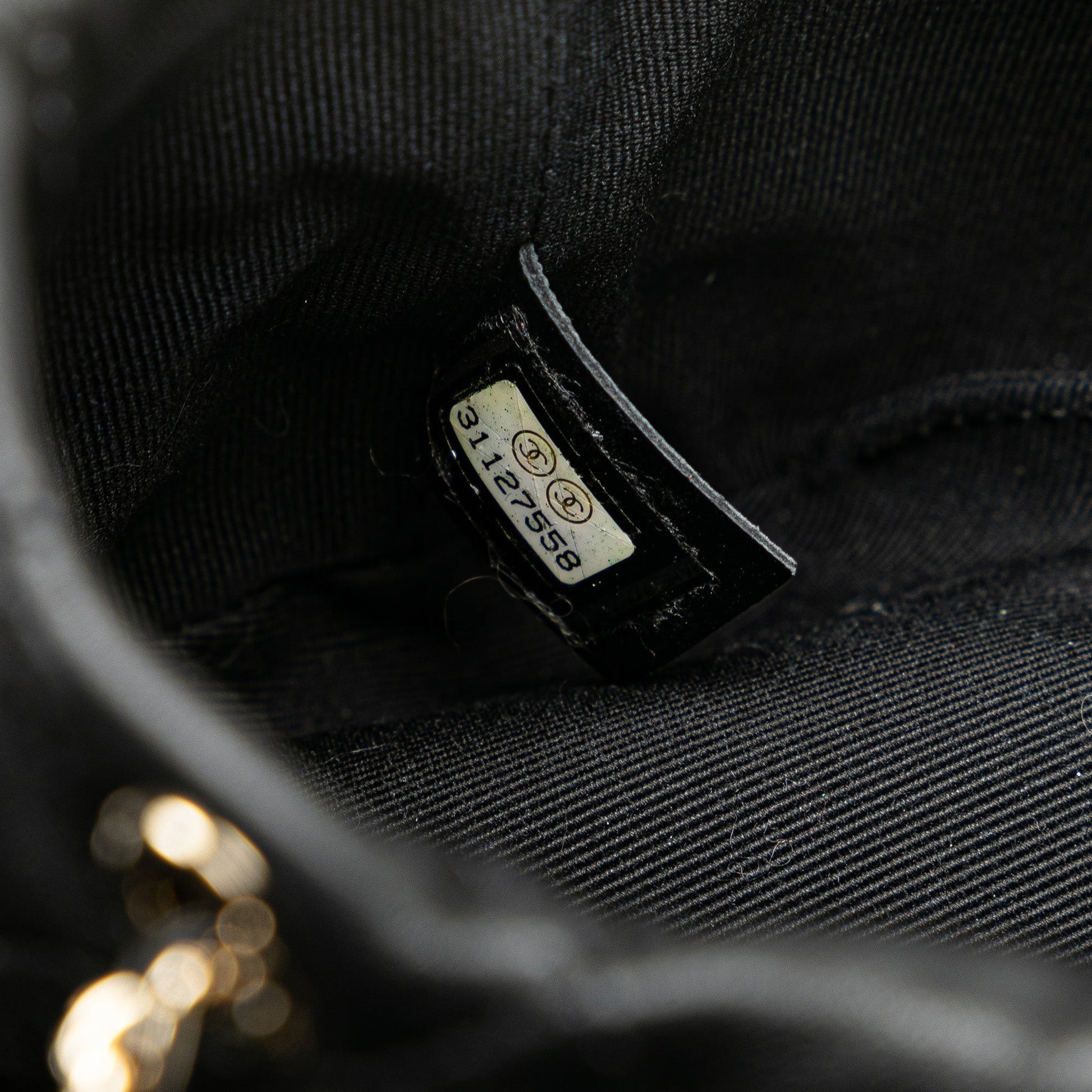 Product Details: Black Chanel Mini Calfaskin About Pearls Drawstring Bucket Bag. This bucket bag features calfskin leather with faux pearls embellishments, a leather woven chain link shoulder strap, and a drawstring closure at top. 4.3" L x 4.3" W x 4.3" D. Serial number 31127558.