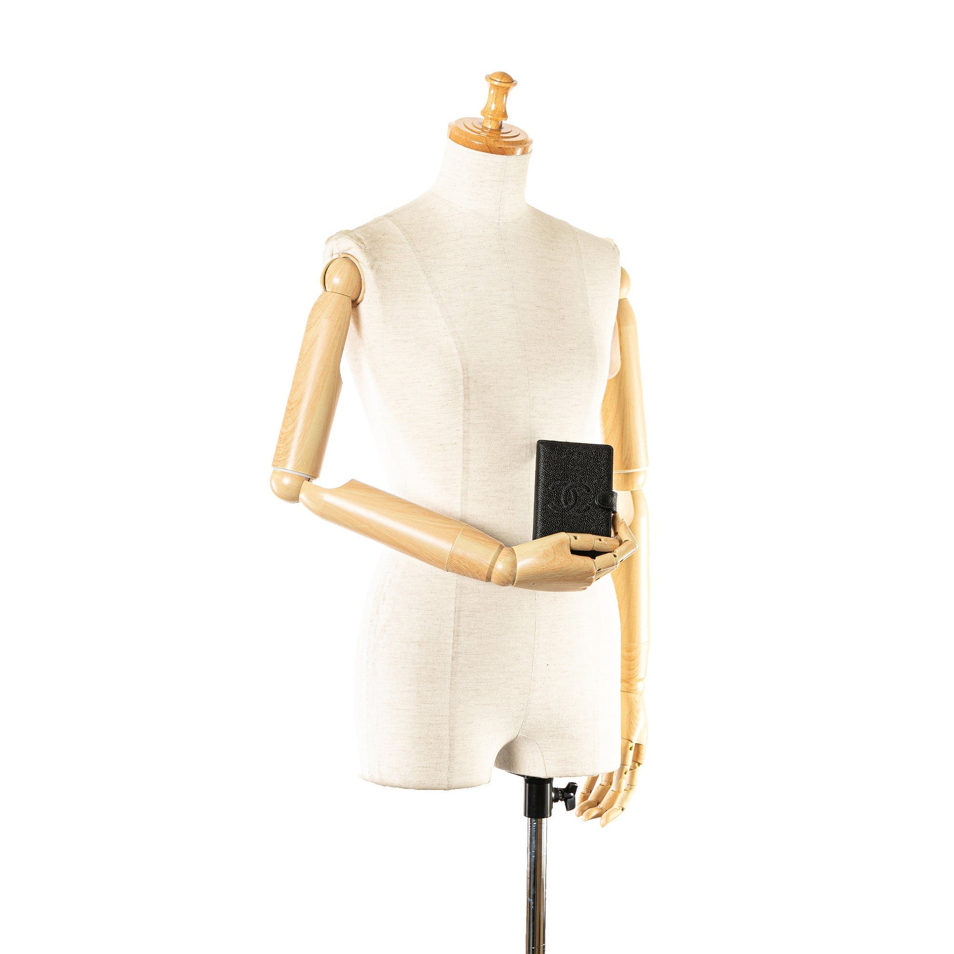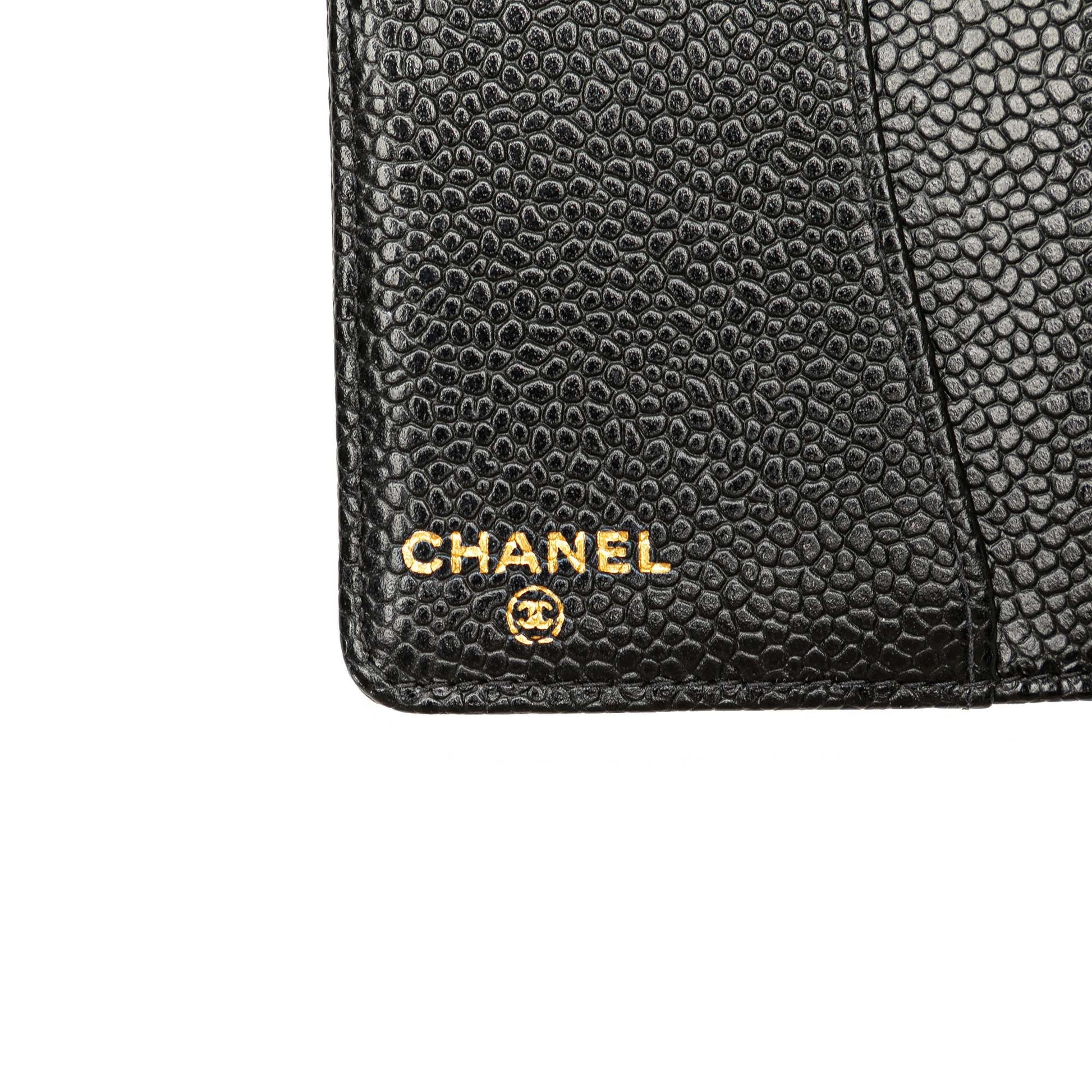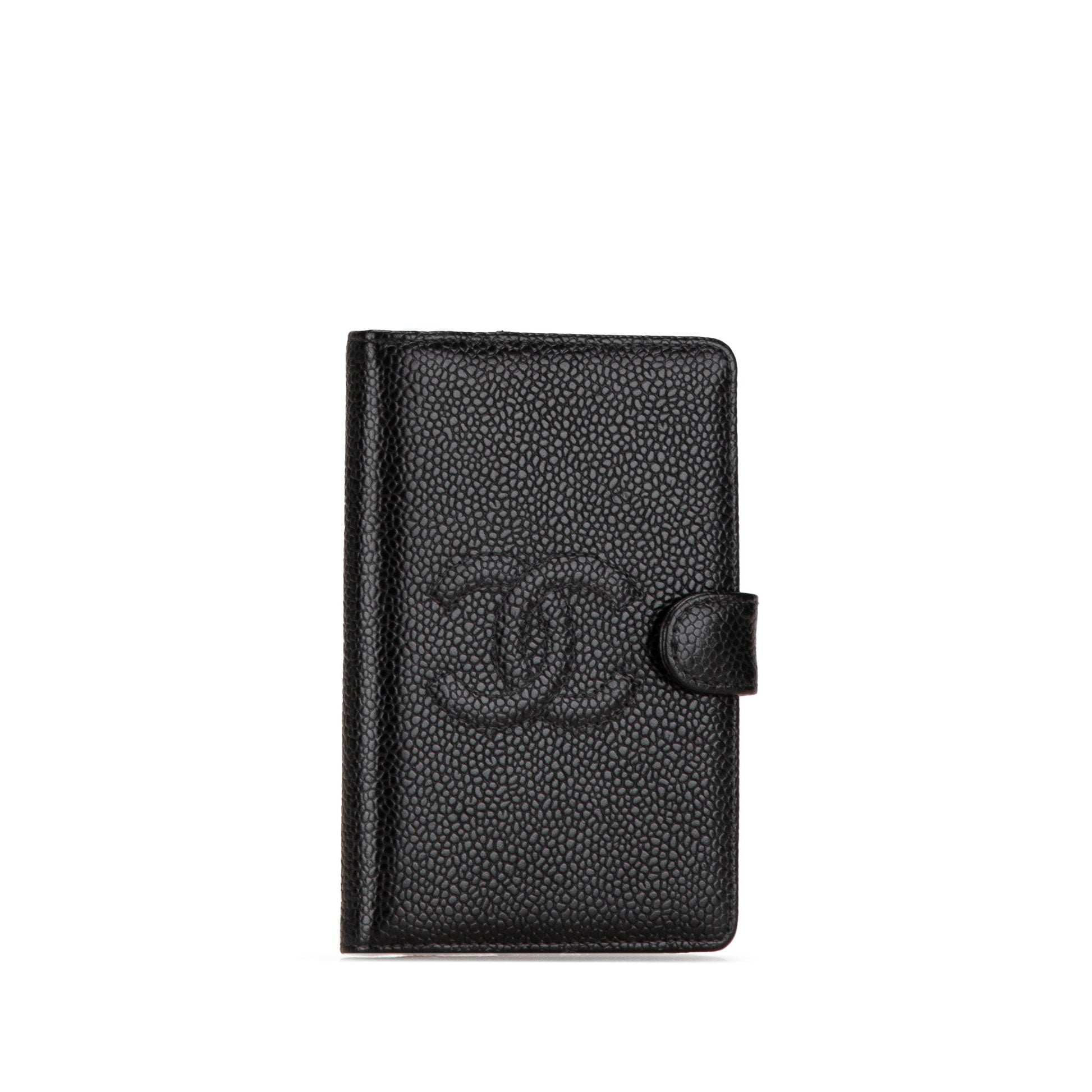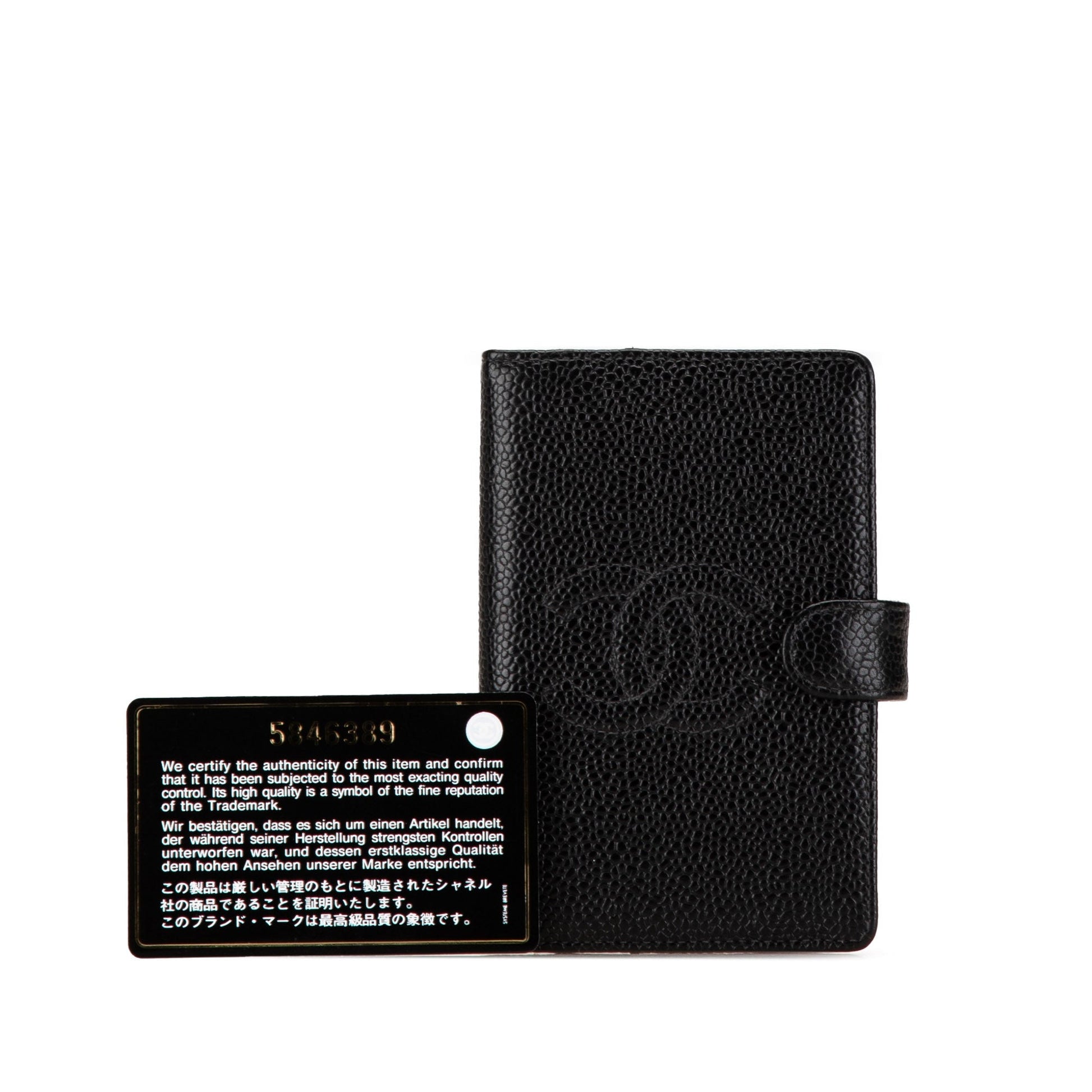 Product Details: Black Chanel Mini Caviar CC Notebook Cover. This notebook cover features a caviar leather body, a flat strap with snap button closure, and interior slip pockets. 4.9" L x 3.3" W x 0.6" D. Serial number 5846389.