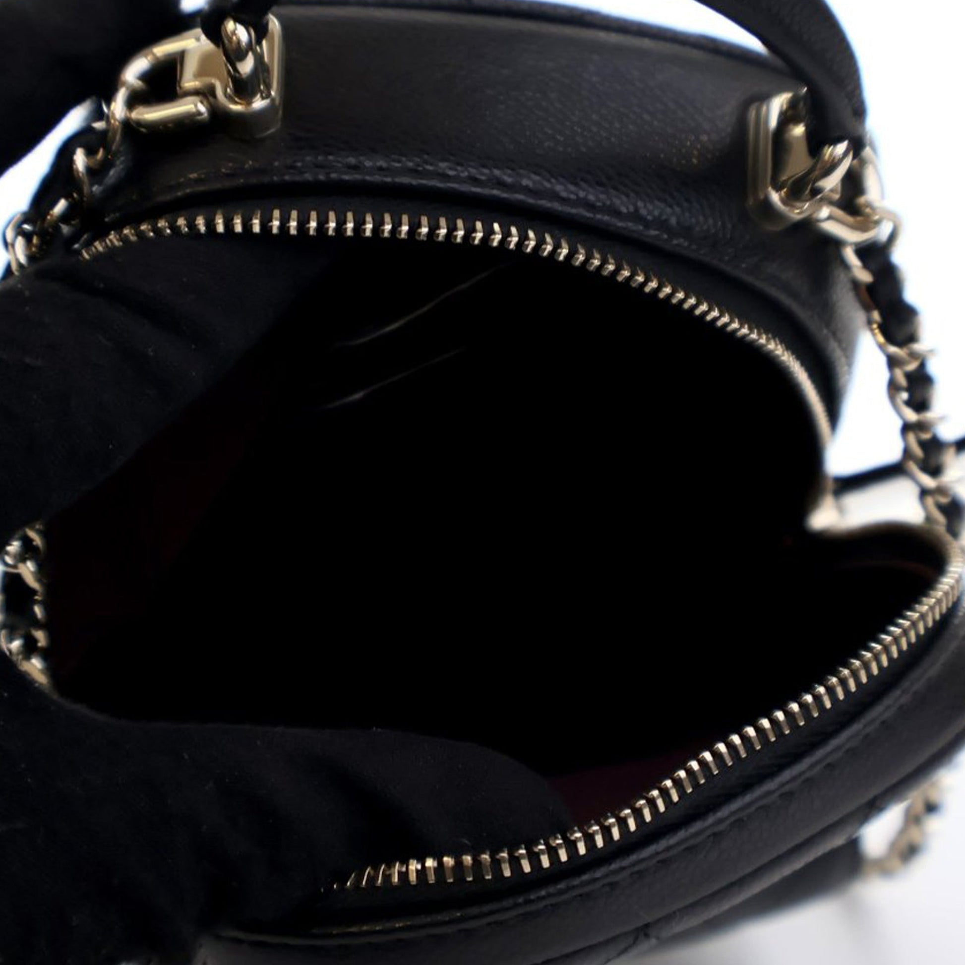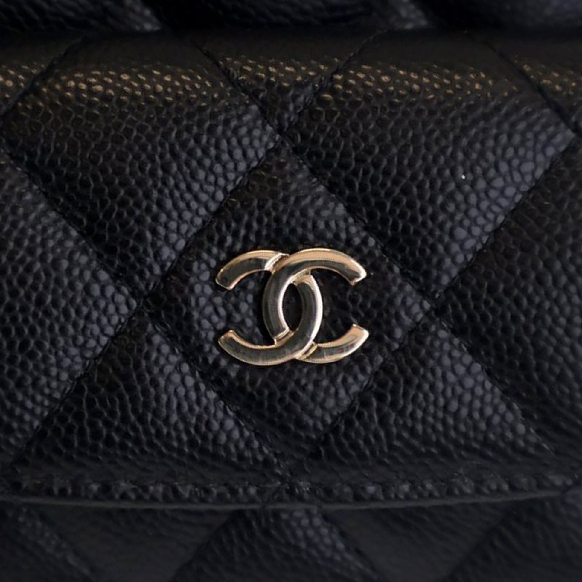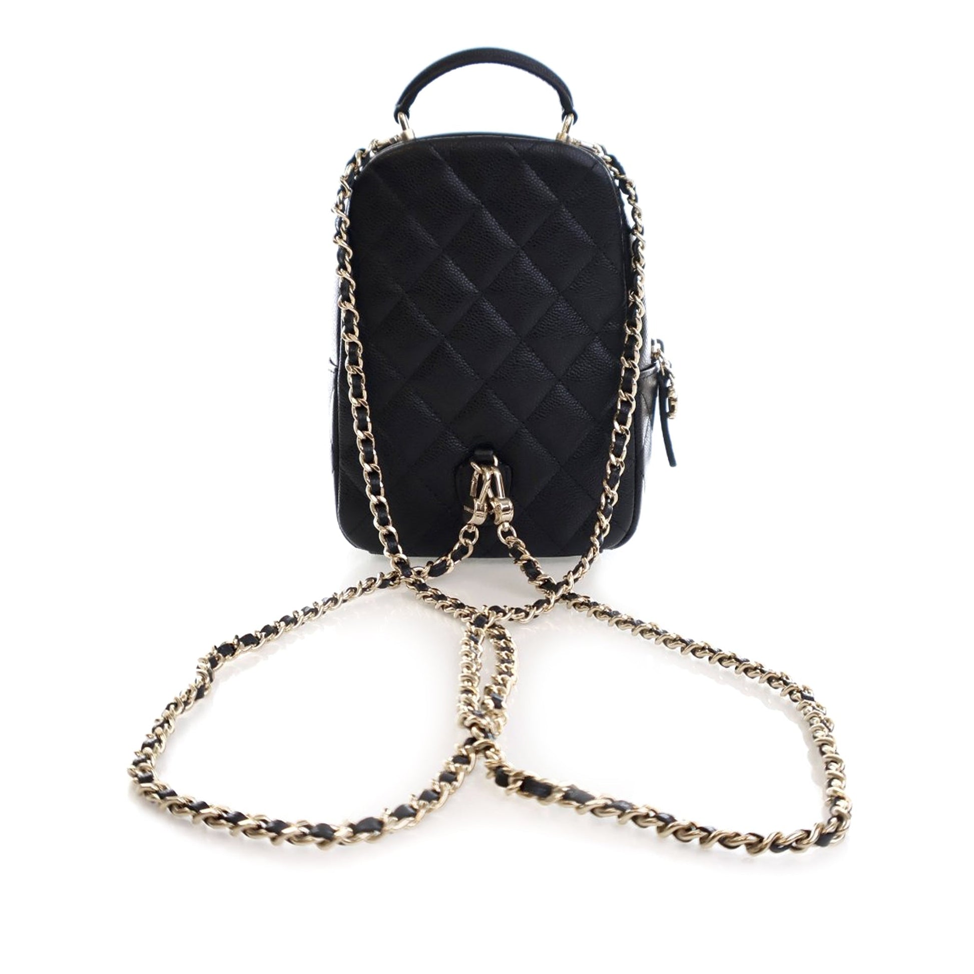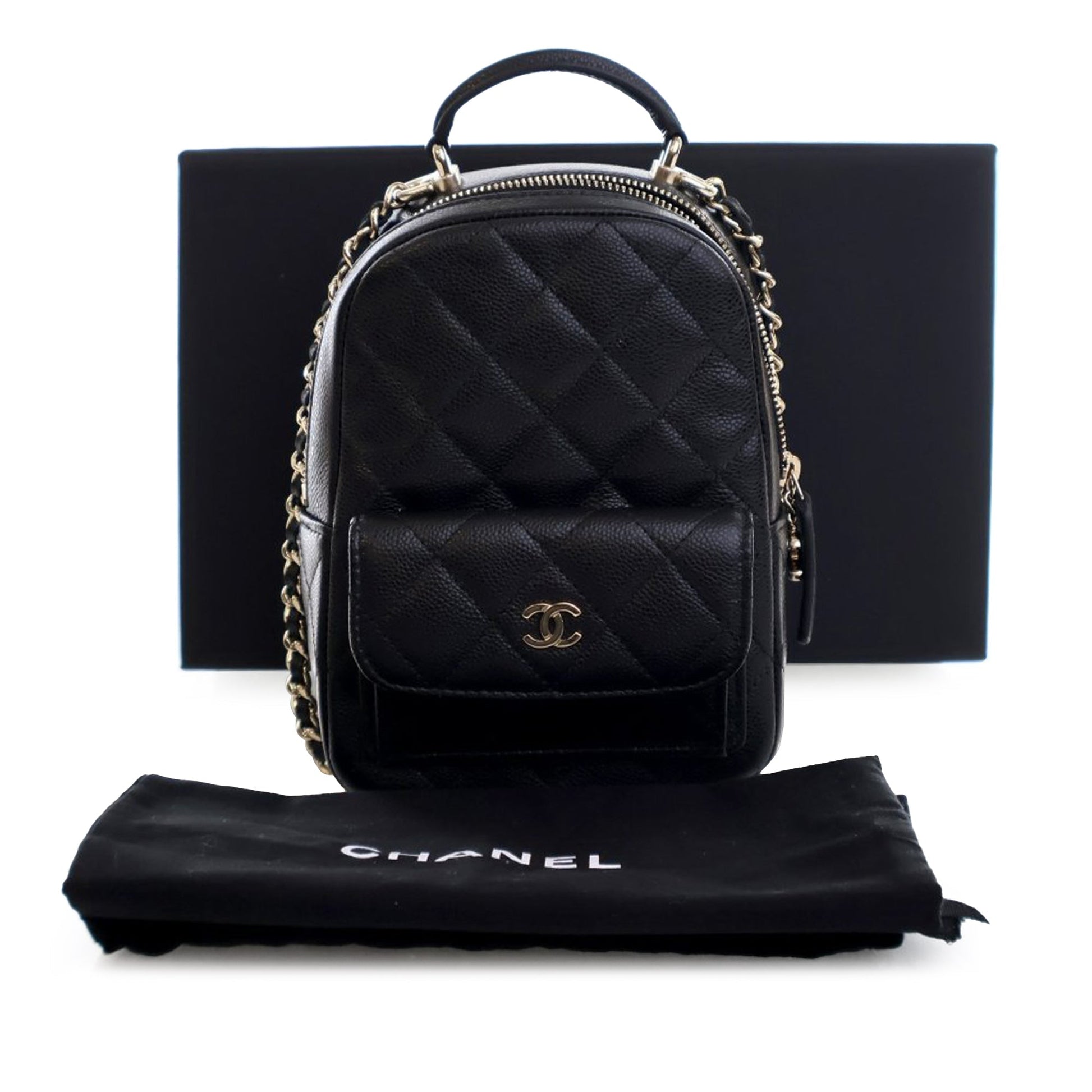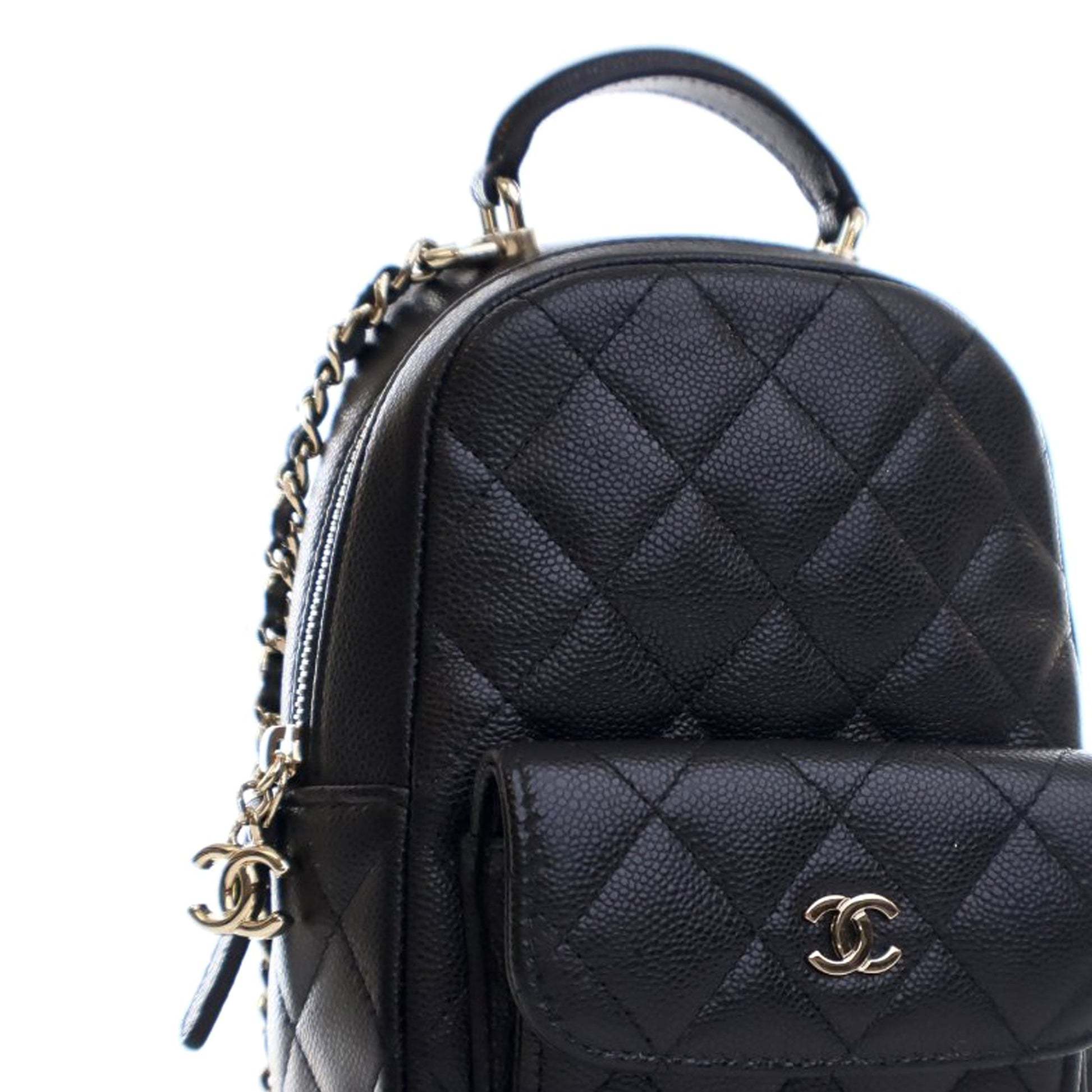Product Details: Black Chanel Mini CC Quilted Caviar Leather Backpack. This backpack features a quilted caviar leather body, a rolled top handle, detachable leather woven chain straps, a top zip closure, an exterior flap pocket with magnetic snap closure, and interior slip pockets. 7.1" L x 5.1" W x 2.5" D, 2.4" drop. Serial number KTCCXXXX.
