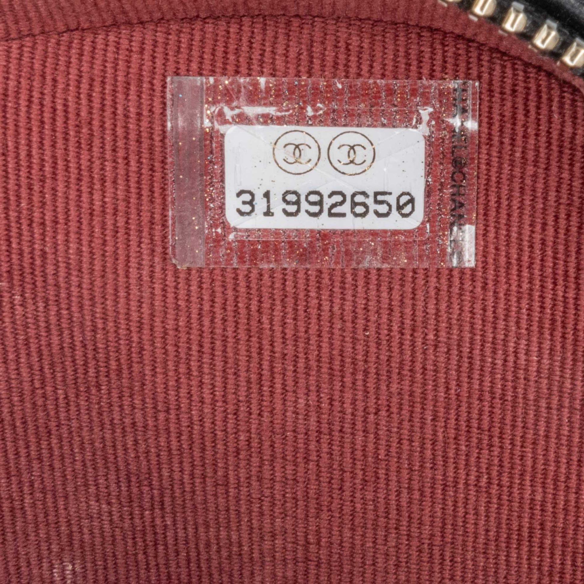 Product Details: Black Chanel Mini Lambskin CC in Love Heart Crossbody. This crossbody bag features a quilted lambskin leather body, a leather woven chain link shoulder strap, a zip-around closure, an exterior front flap pocket with CC turn-lock closure, and an exterior back slip pocket. 4.7" L x 5.1" W x 1.6" D. Serial number 31992650.