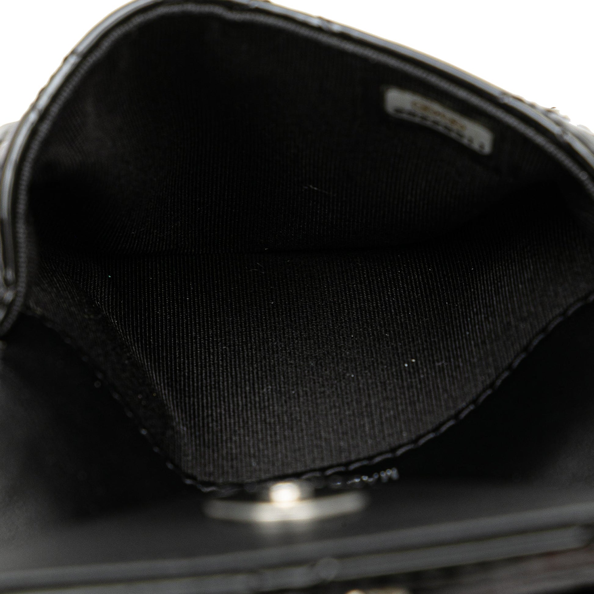Product Details: Black Chanel Mini Patent Belt in Love Double Flap Belt Bag. This belt bag features a patent leather body, an adjustable flat waist strap, and a flap with magnetic snap closure. 3.9" L x 3.9" W x 0.6" D. Serial number 29228911.