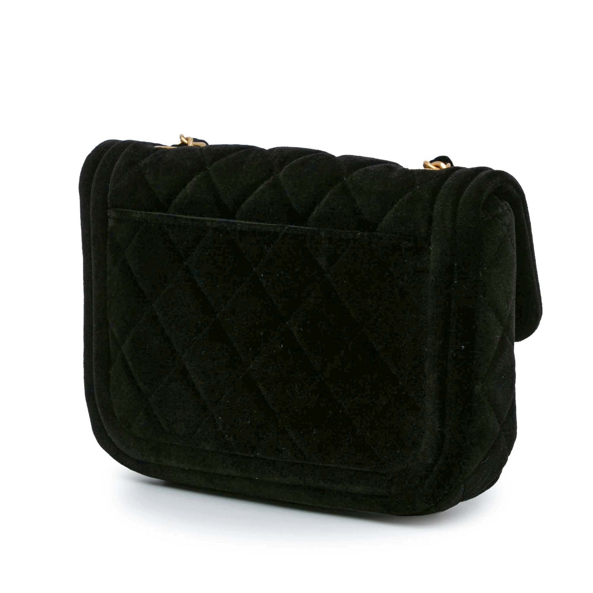 Product Details: Black Chanel Mini Quilted Velvet Double Frame Flap Crossbody Bag. This flap features a quilted velvet body, a velvet-woven chain strap with velvet guard, a front flap with twist lock closure, exterior front and back slip pockets, and interior zip and slip pockets. 5.1" L x 7.5" W x 2.4" D. Serial number P5199H06.