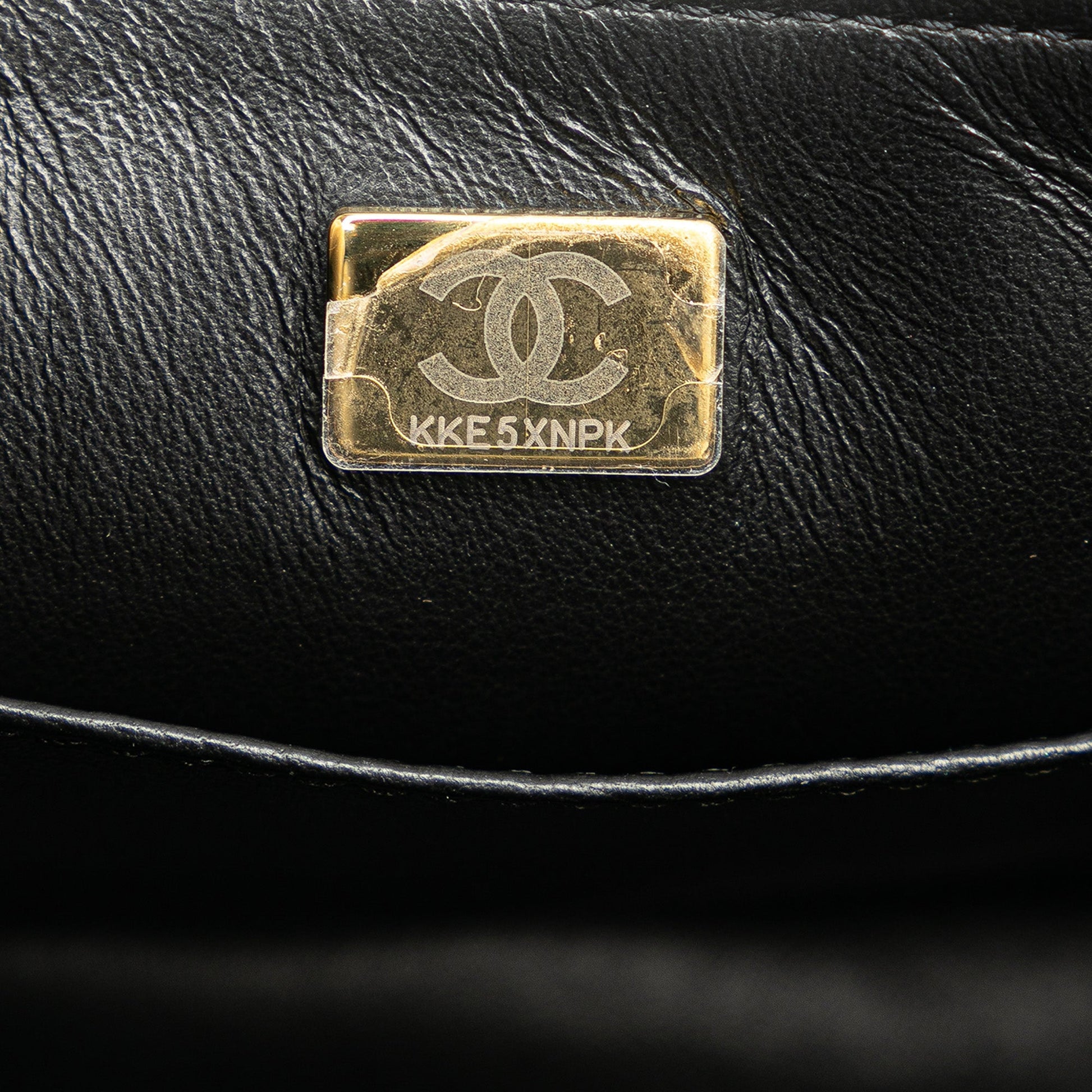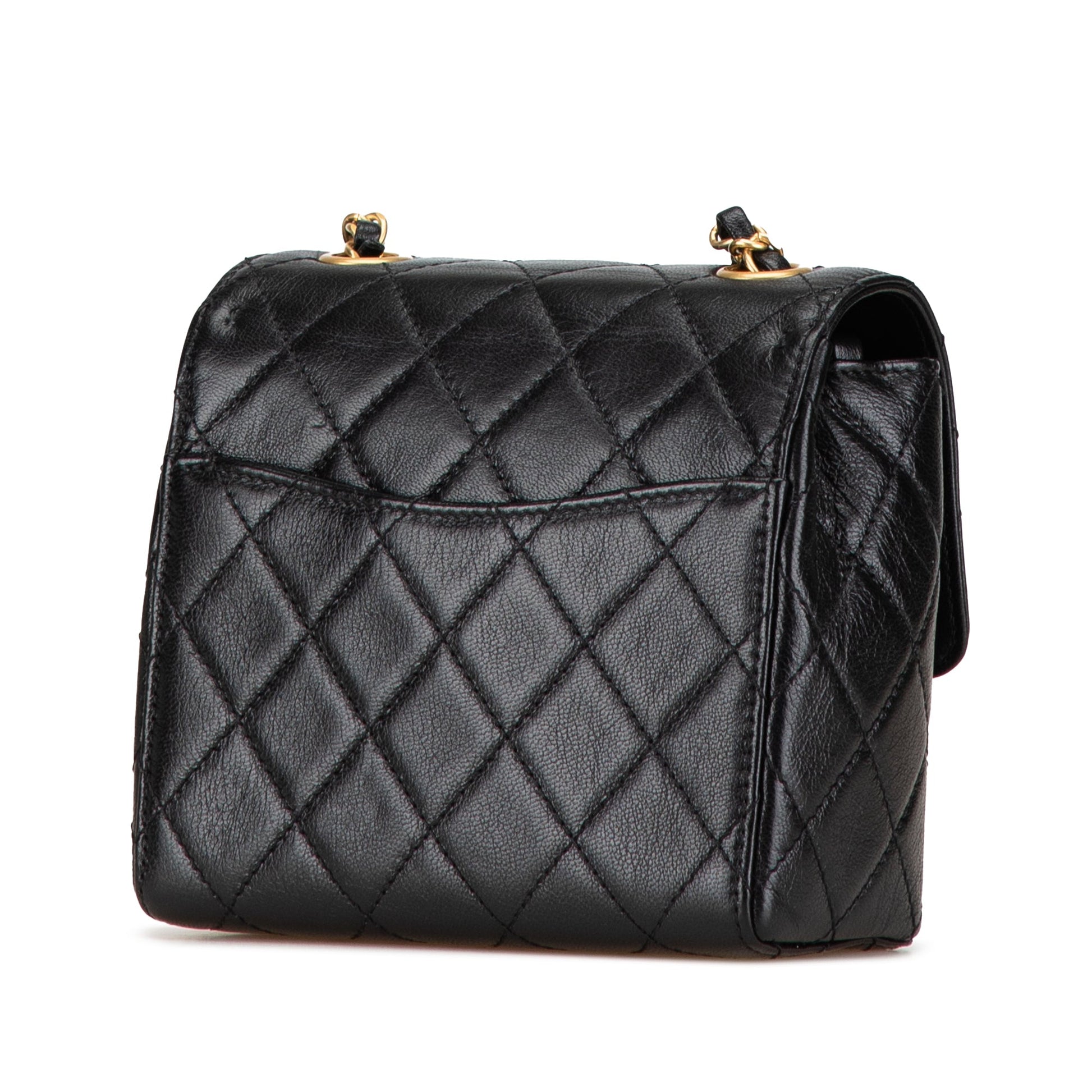 Product Details: Black Chanel Mini Square Classic Goatskin Retro Flap Crossbody Bag. This crossbody features a quilted goatskin leather body, leather woven chain straps, a front flap with twist lock closure, and interior slip pockets. 5.5" L x 6.3" W x 3" D. Serial number KKE5XNPK.