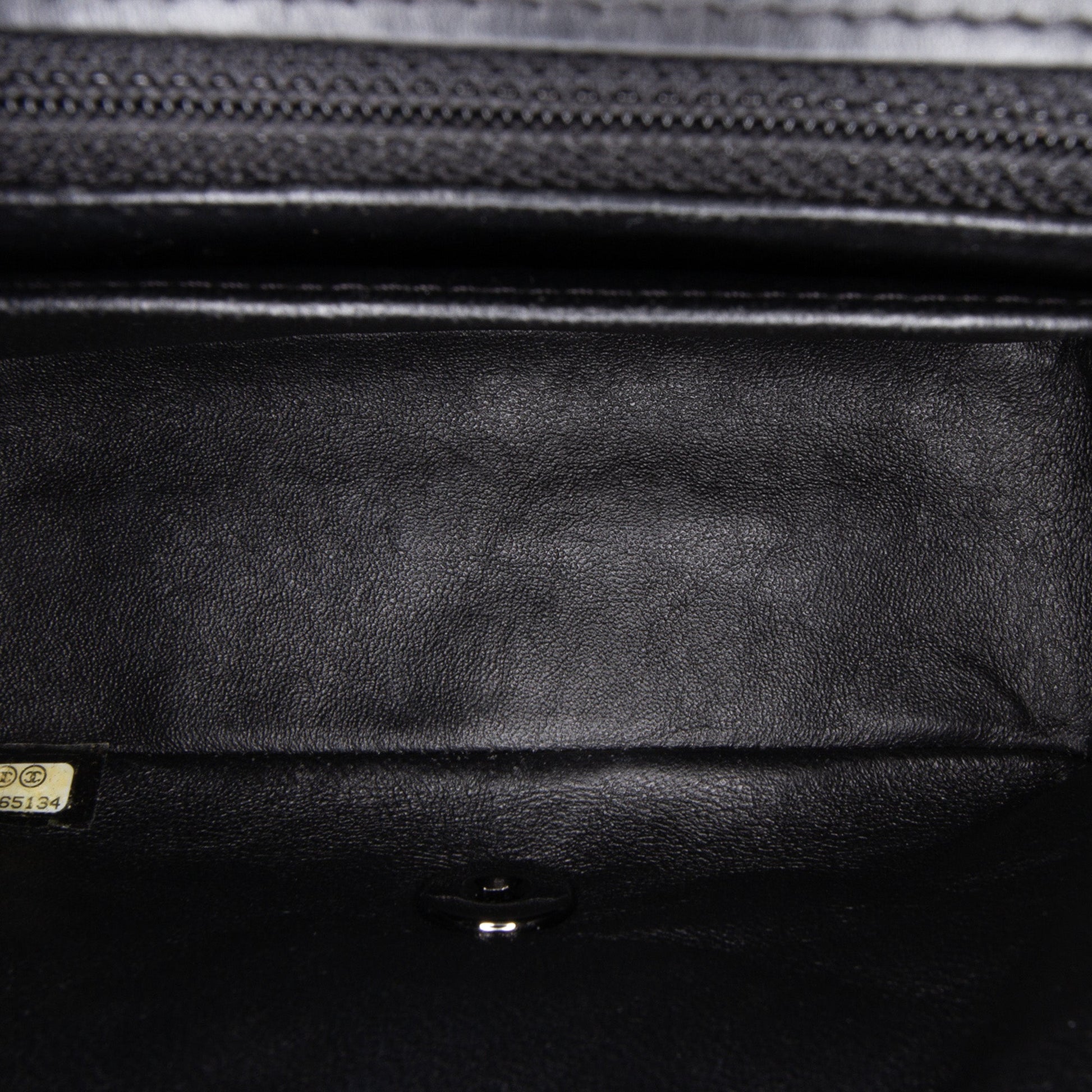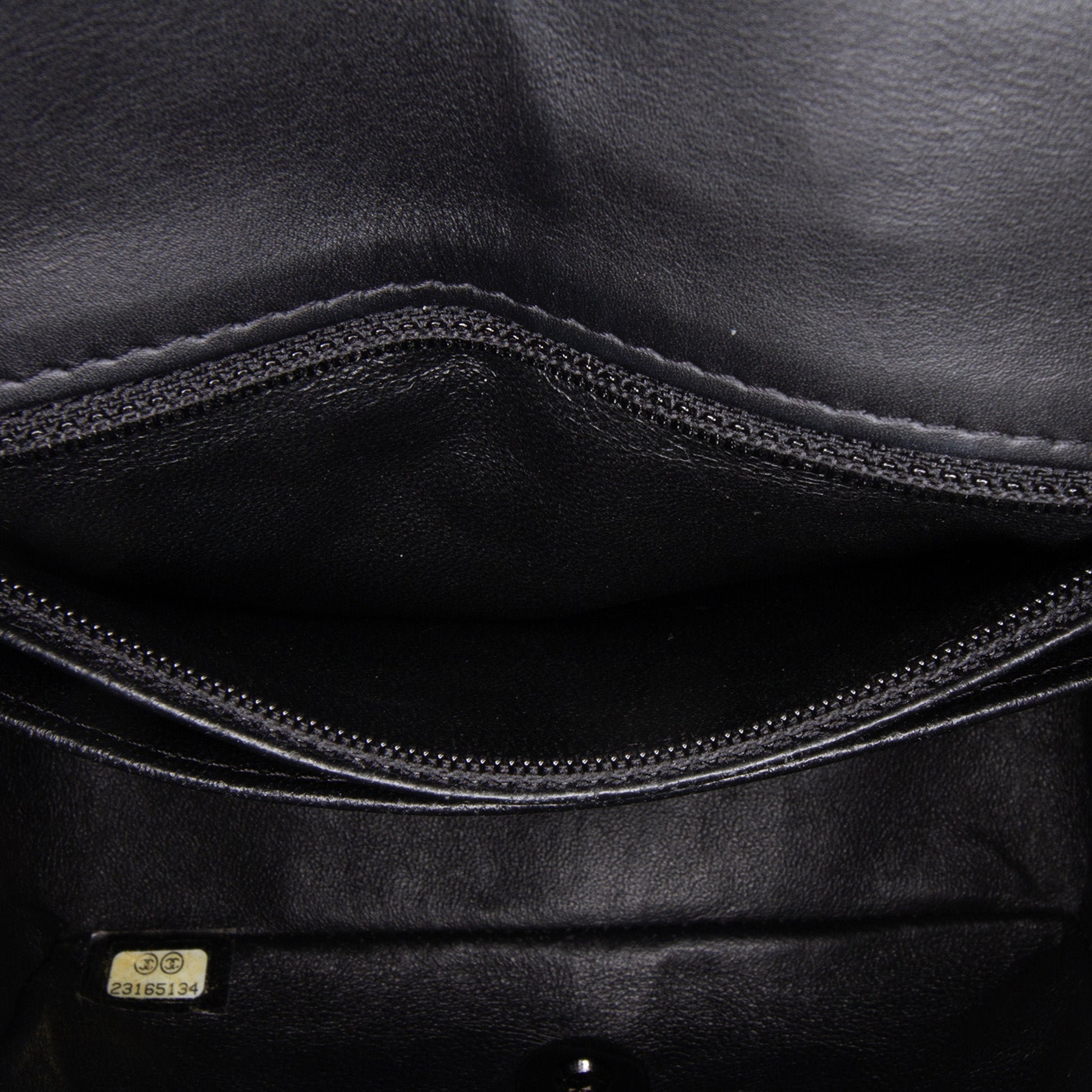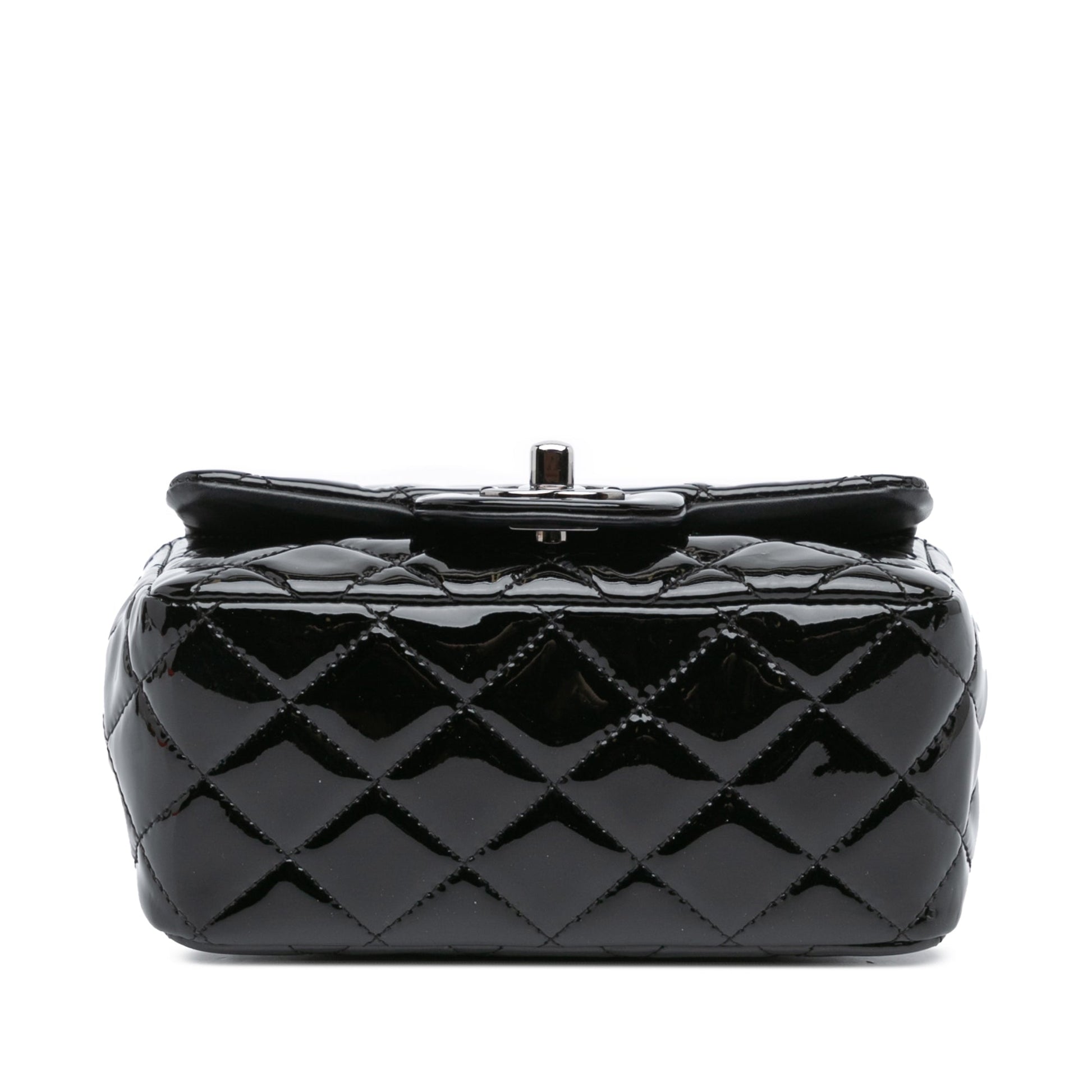 Product Details: Black Chanel Mini Square Classic Patent Single Flap Crossbody Bag. This flap features a quilted patent leather body, a leather woven chain shoulder strap, a front flap with interlocking Cs and a twist lock closure, an exterior back slip pocket, and interior zip and slip pockets. 6.9" L x 6.3" W x 2.8" D. Serial number 23165134.