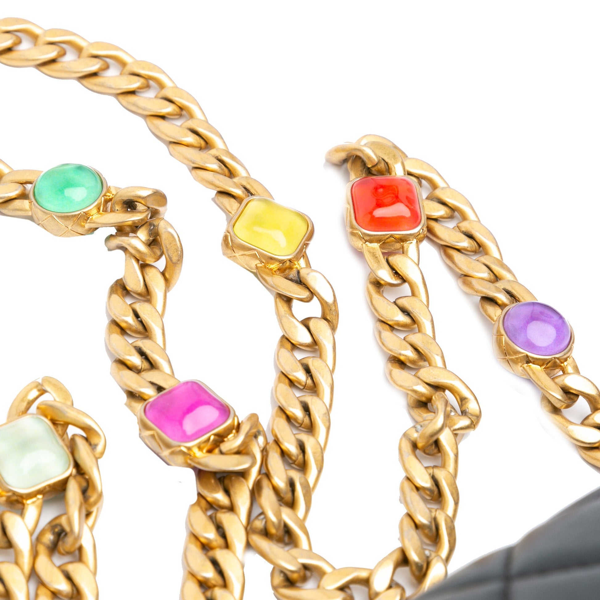 Product Details: Black Chanel Mini Square Lambskin Pearl Samba Flap Crossbody Bag. This crossbody bag features a quilted lambskin leather body, a curb chain strap with resin details, a flap with CC turn lock closure, an exterior slip pocket, and interior zip and slip pockets. 4.7" L x 6.3" W x 2.8" D. Serial number 31127009.