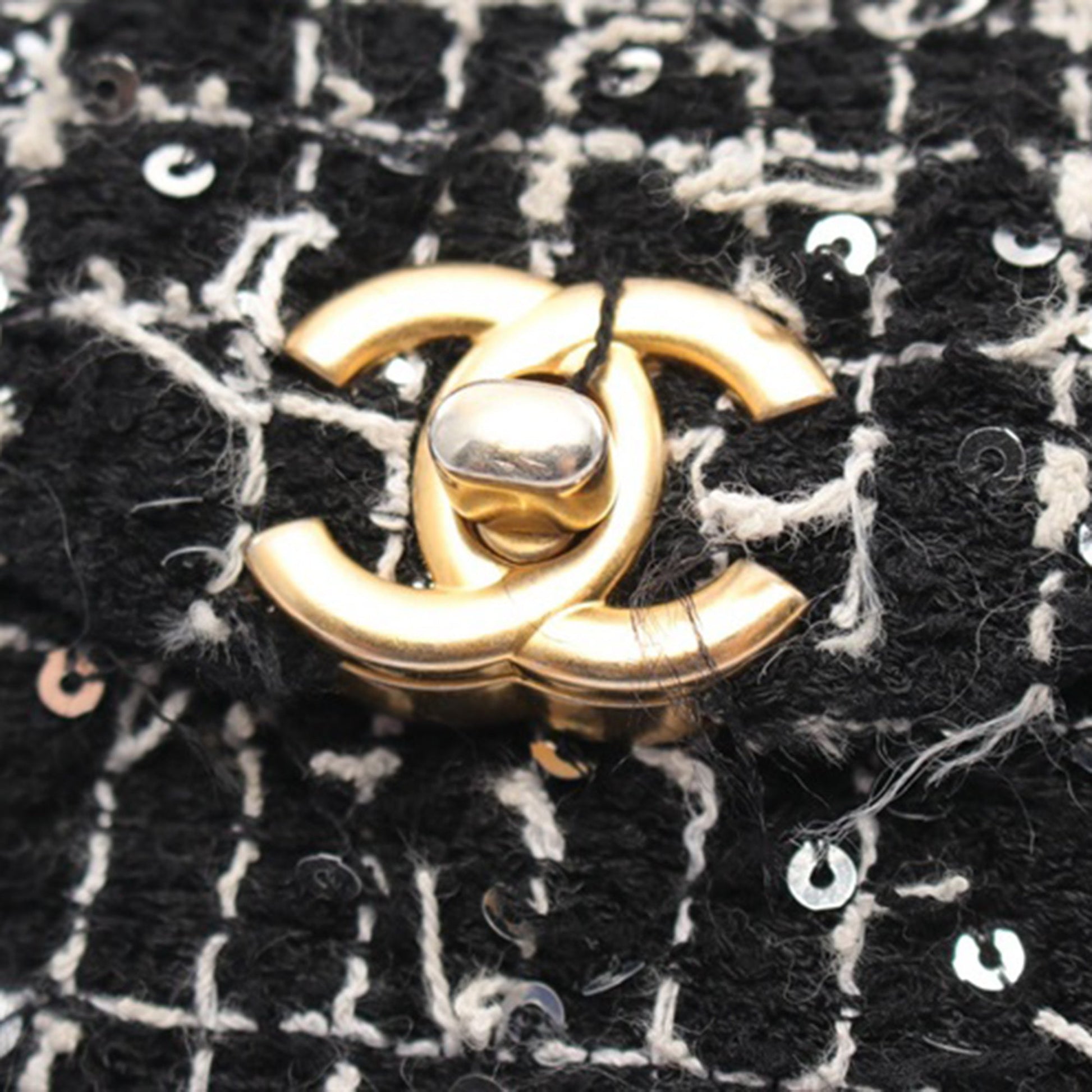 Product Details: Black Chanel Nano Tweed Kelly Clutch on Chain Satchel. This satchel features a tweed body with sequin embellishments, rolled handles, a leather woven chain link shoulder strap, a top flap with turn lock closure, and an interior slip pocket. 3.7" L x 5.1" W x 1.6" D, 1.2" drop. Serial number X357E33A.