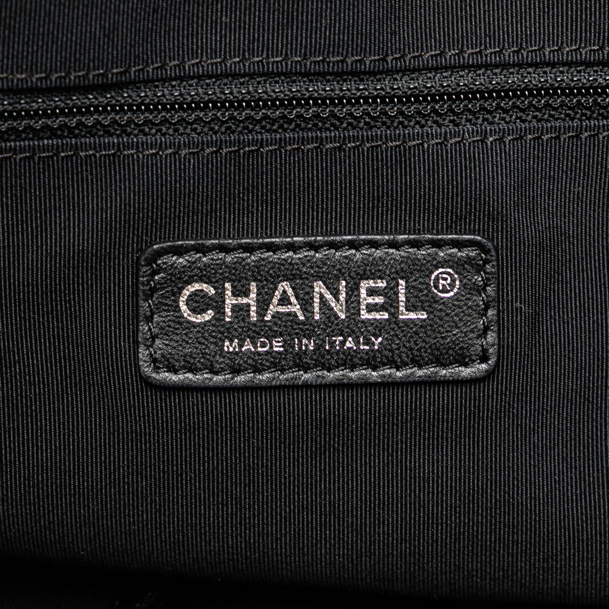 Product Details: Black Chanel Paris-Venice Canvas Bon Bon Tote. This tote bag features a canvas body, a leather woven strap, an open top, and interior zip and slip pockets. 15.7" L x 20.5" W x 0.8" D, 9.8" drop. Serial number 1319423.