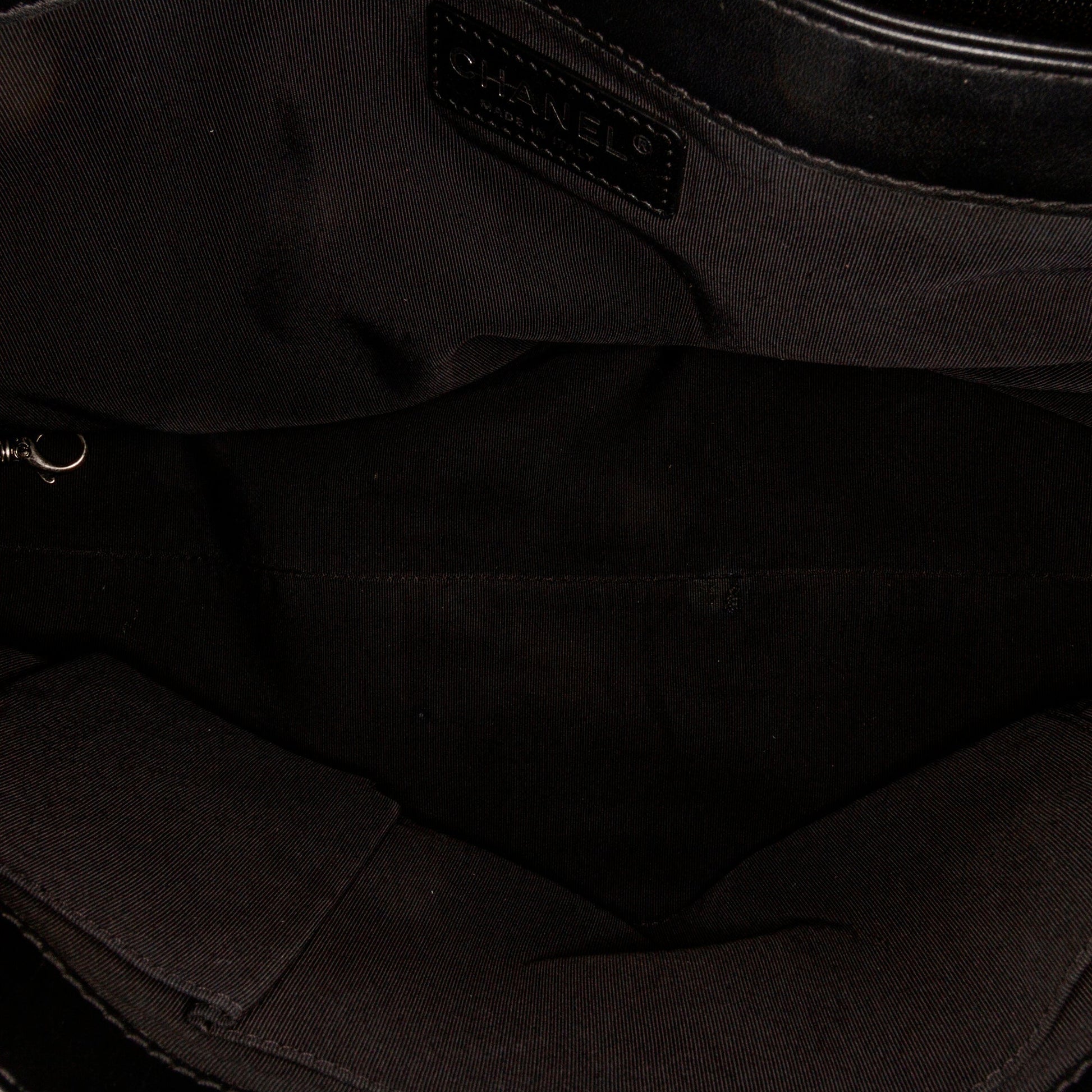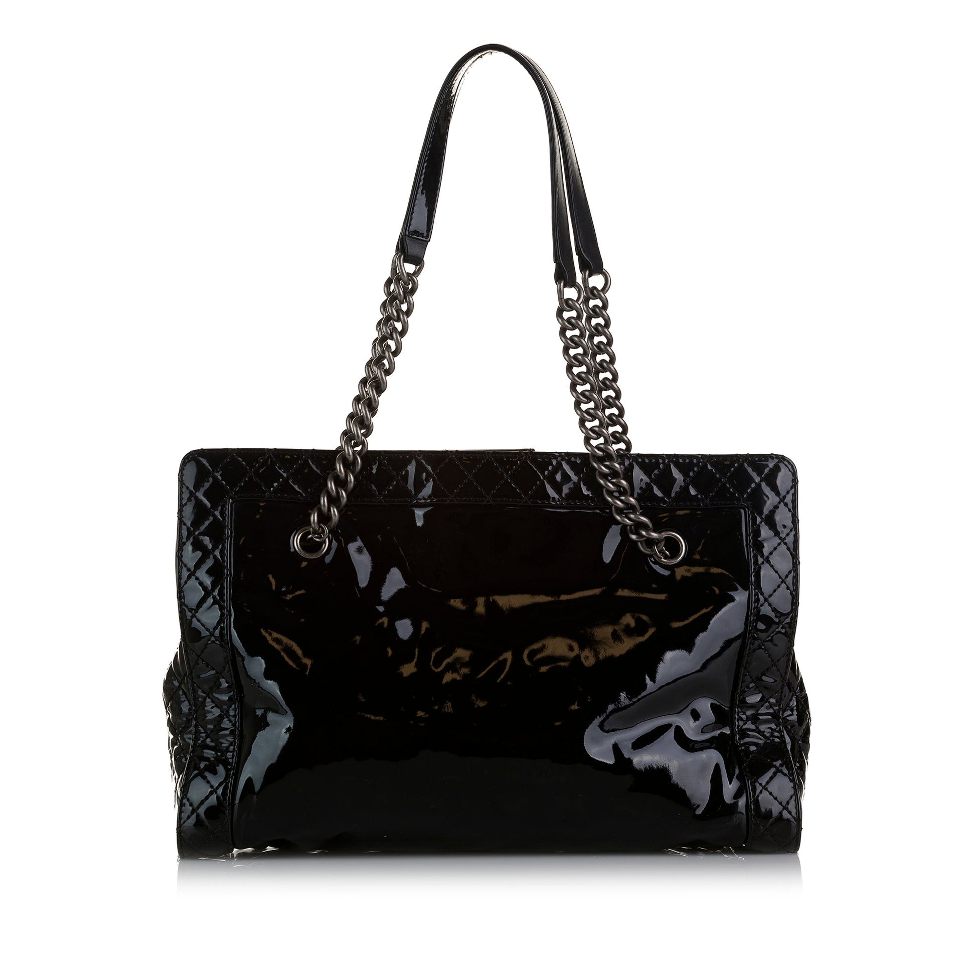Product Details: Black Chanel Patent Boy Reverso Shopping Tote. This tote bag features a patent leather body, curb chain shoulder straps, an open top with push lock closure, and interior zip and slip pockets. 9.8" L x 15" W x 5.9" D, 9.8" drop. Serial number 18650604.