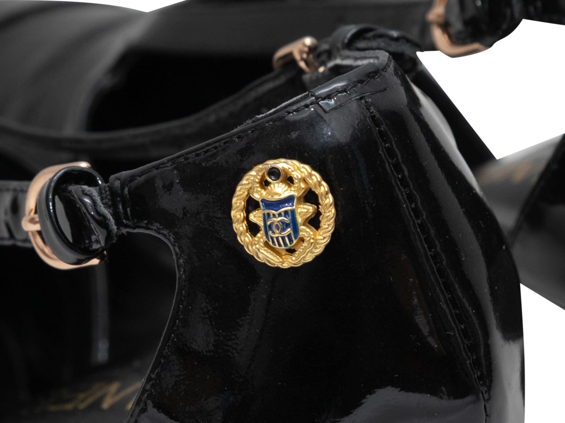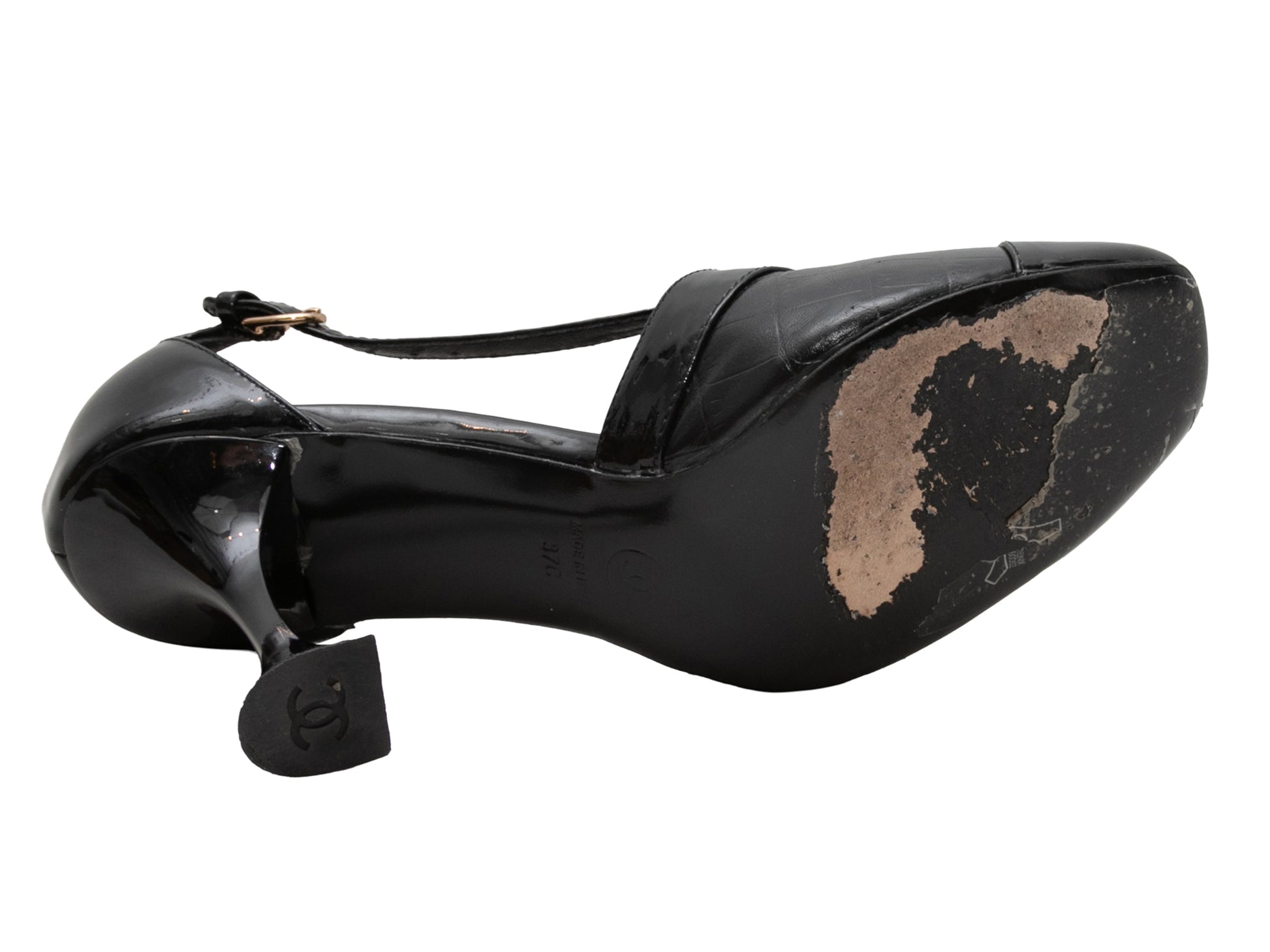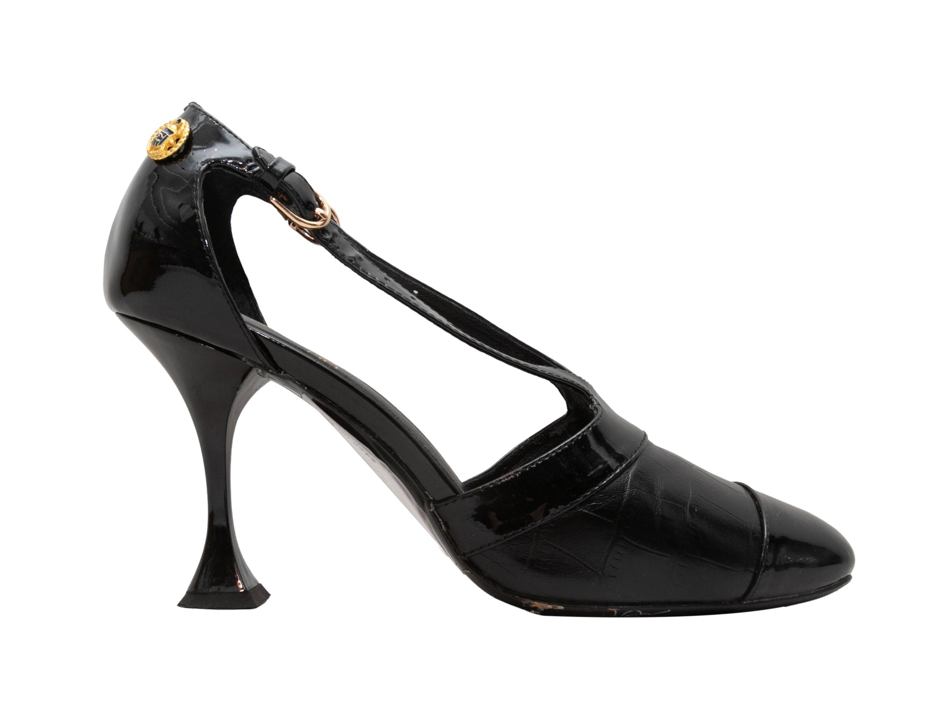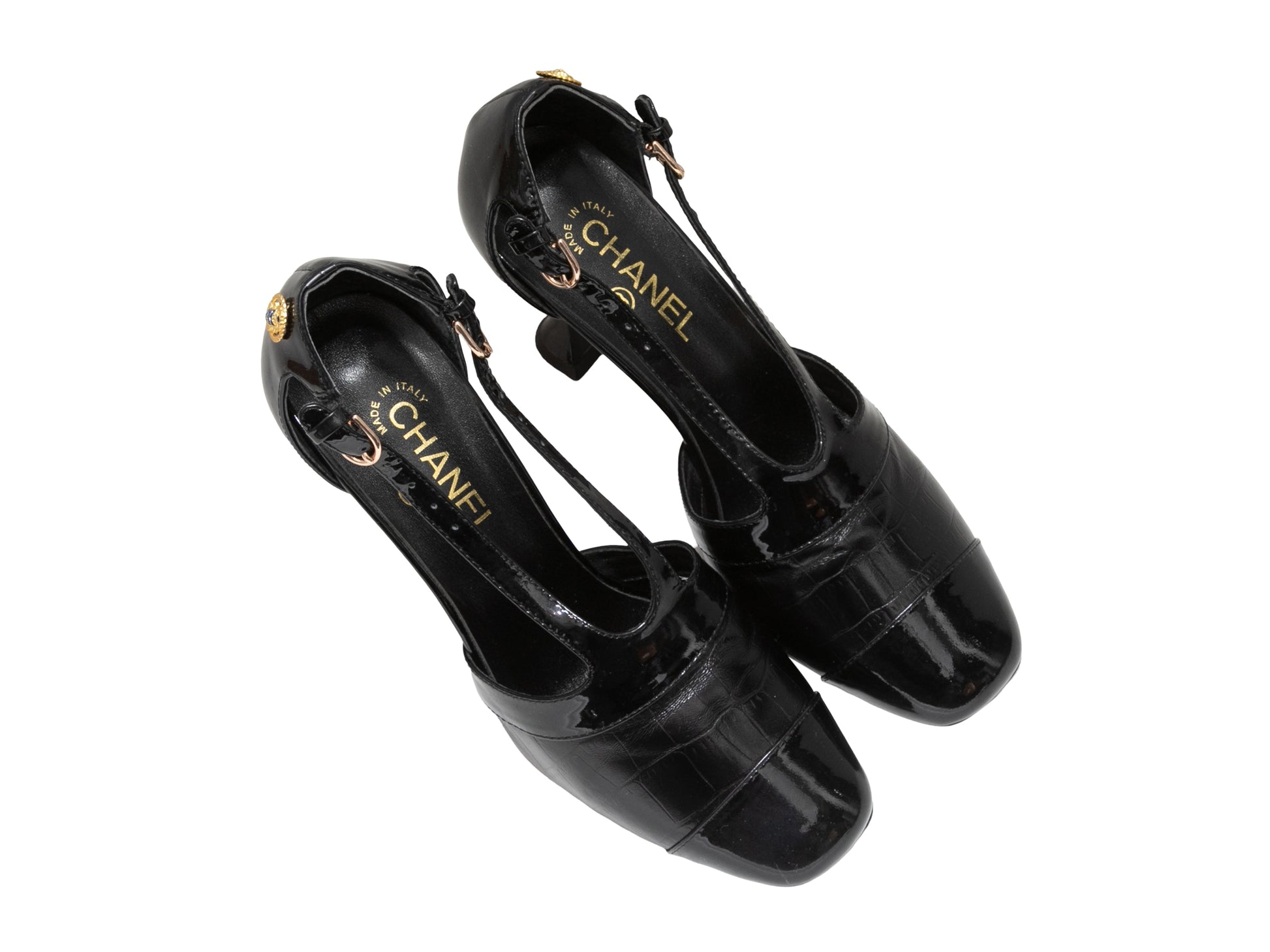 Product Details: Black patent and embossed leather cutout pumps by Chanel. Circa 2019. Gold-tone hardware. Buckle closures at ankle straps. 3.5" heel height.