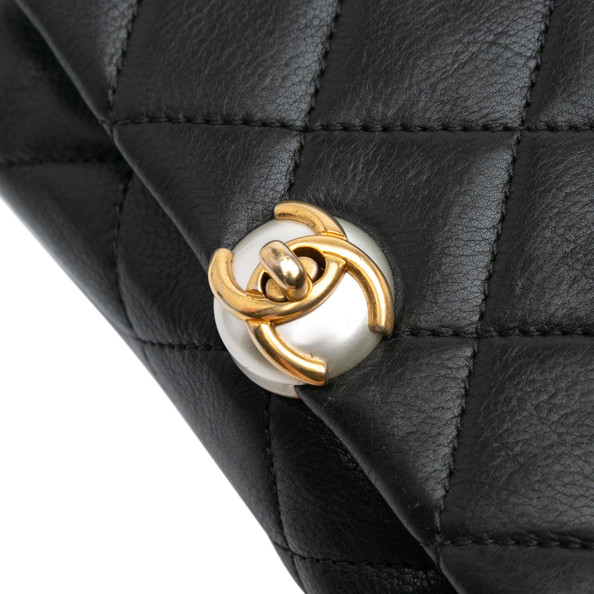 Product Details: Black Chanel Quilted Calfskin Pearl CC Accordion Flap Crossbody Bag. This flap bag features a quilted leather body, a chain link strap with leather shoulder guard, a front flap with CC turn lock closure, an exterior slip pocket, and an interior slip pocket. 4.7" L x 6.7" W x 2.4" D. Serial number 28732958.