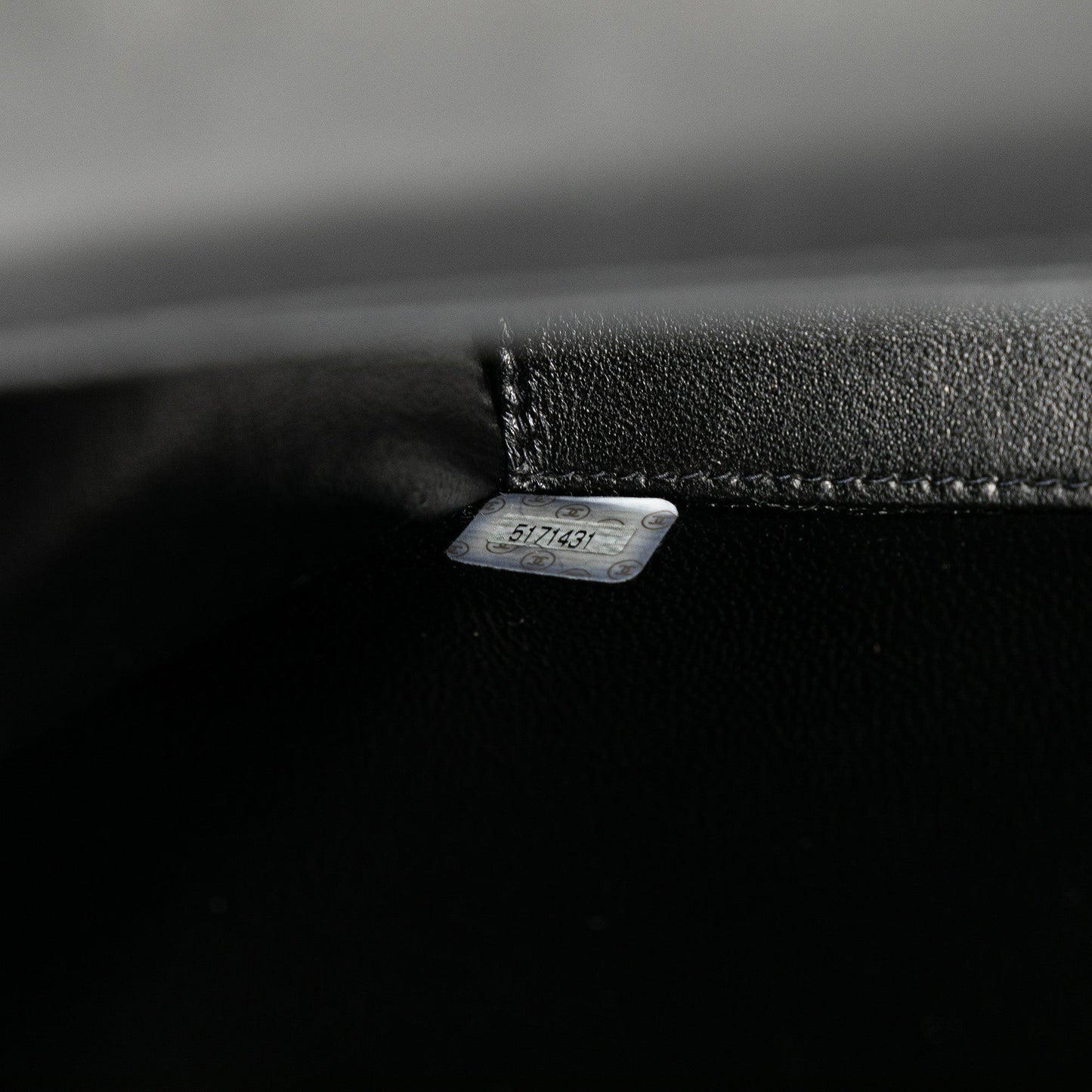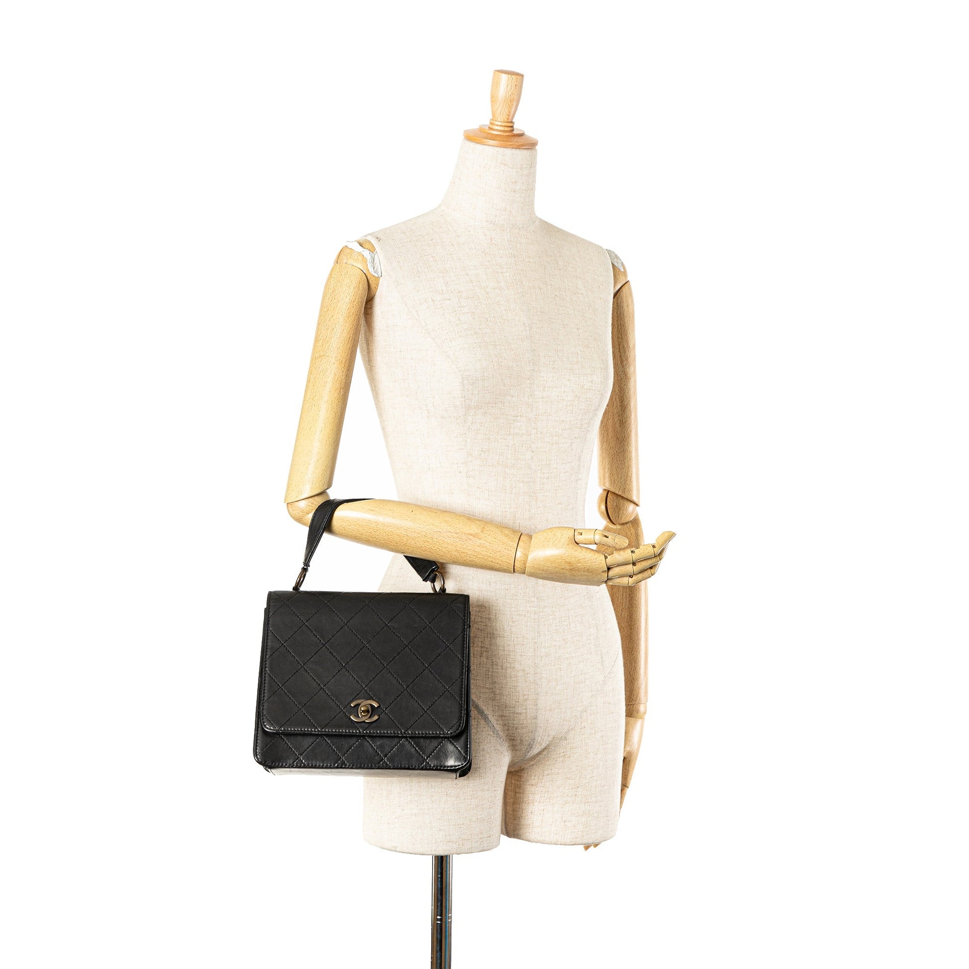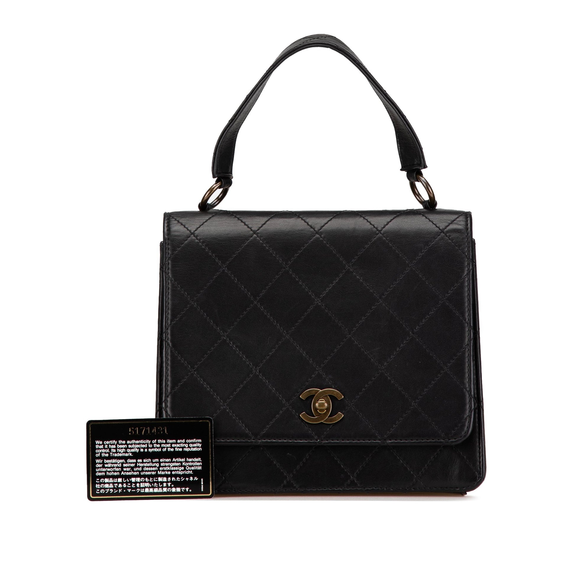 Product Details: Black Chanel Quilted Lambskin Top Handle Square Flap Handbag. This handbag features a quilted lambskin leather body, a flat leather strap, a front flap with cc turn lock closure, an exterior back slip pocket, and an interior slip pocket. 7.5" L x 8.7" W x 3.5" D, 4.3" drop. Serial number 5171431.