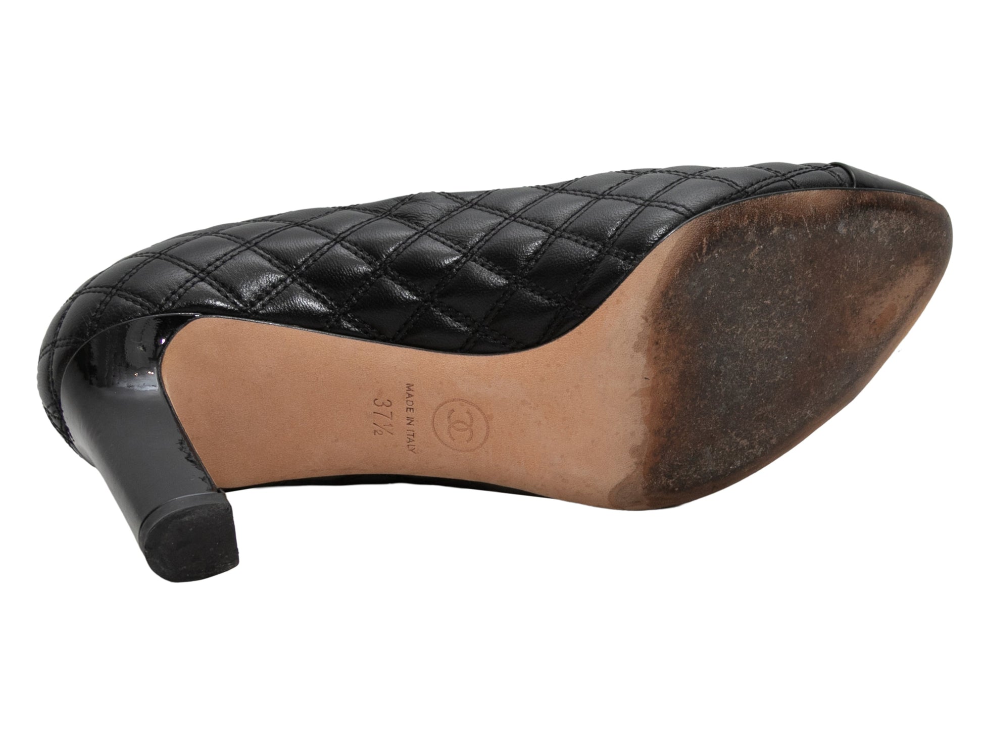 Product Details: Black quilted lambskin and patent leather pointed cap-toe pumps by Chanel. 3"heel height.