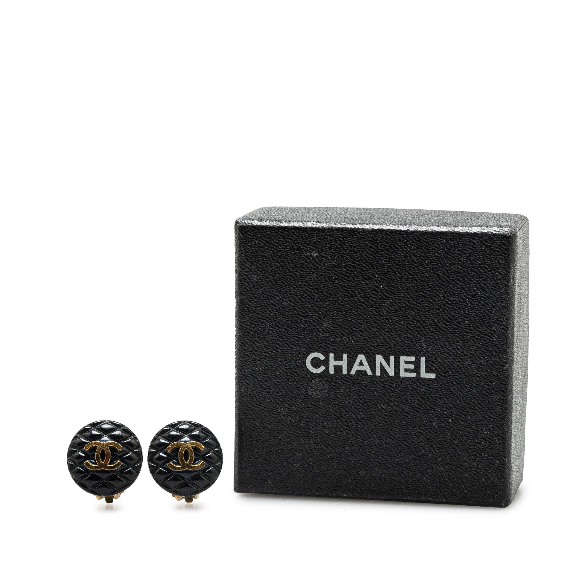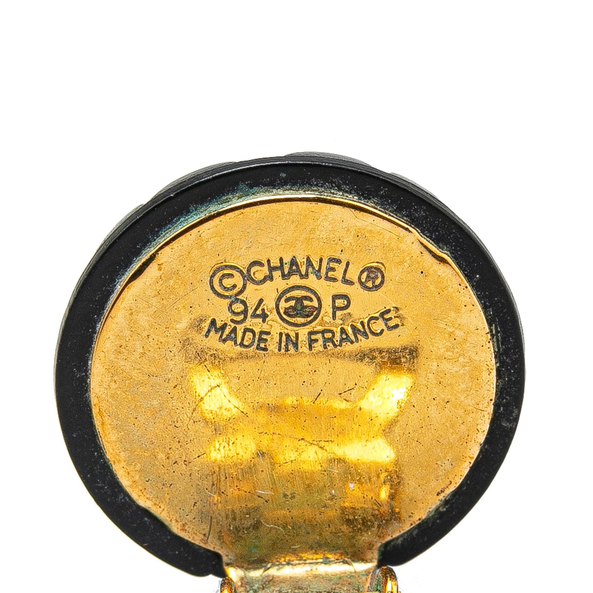 Product Details: Black Chanel Resin Quilted CC Button Clip On Earrings. These earrings feature a quilted resin and gold-plated body, and a clip-on closure. 0.7" L x 0.7" W x 0" D. Serial number 94P.