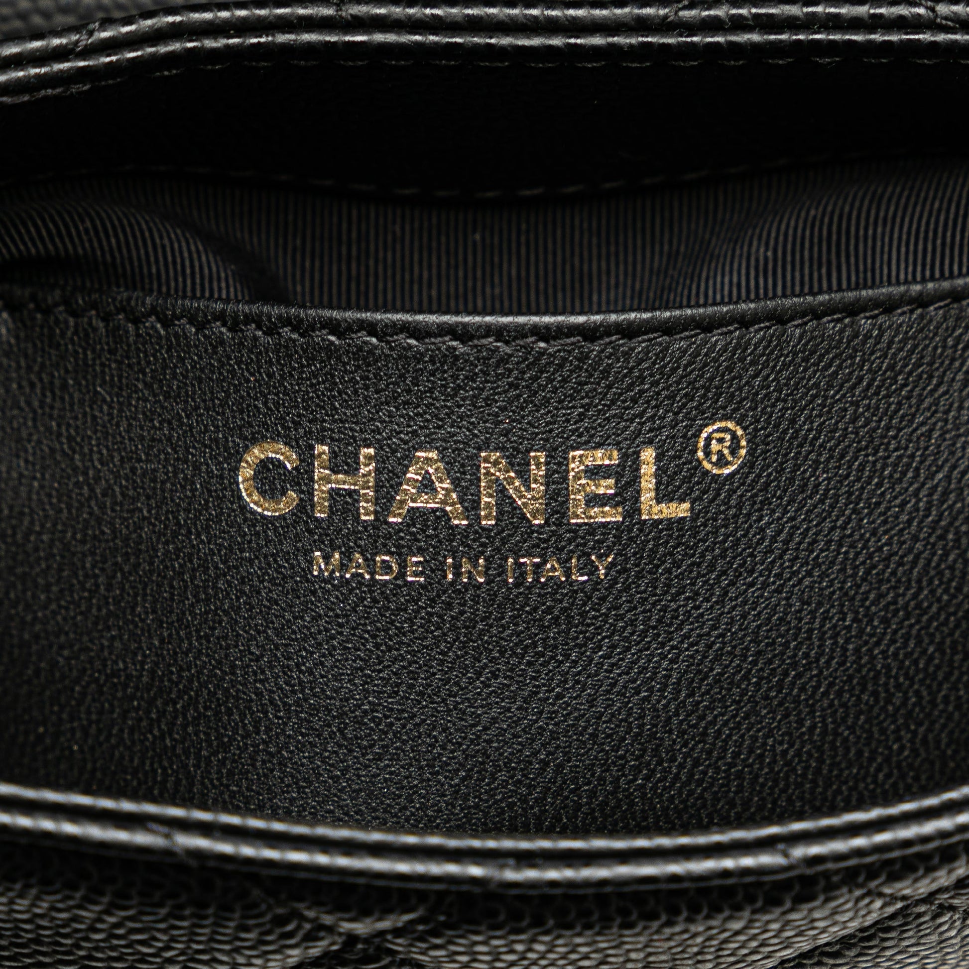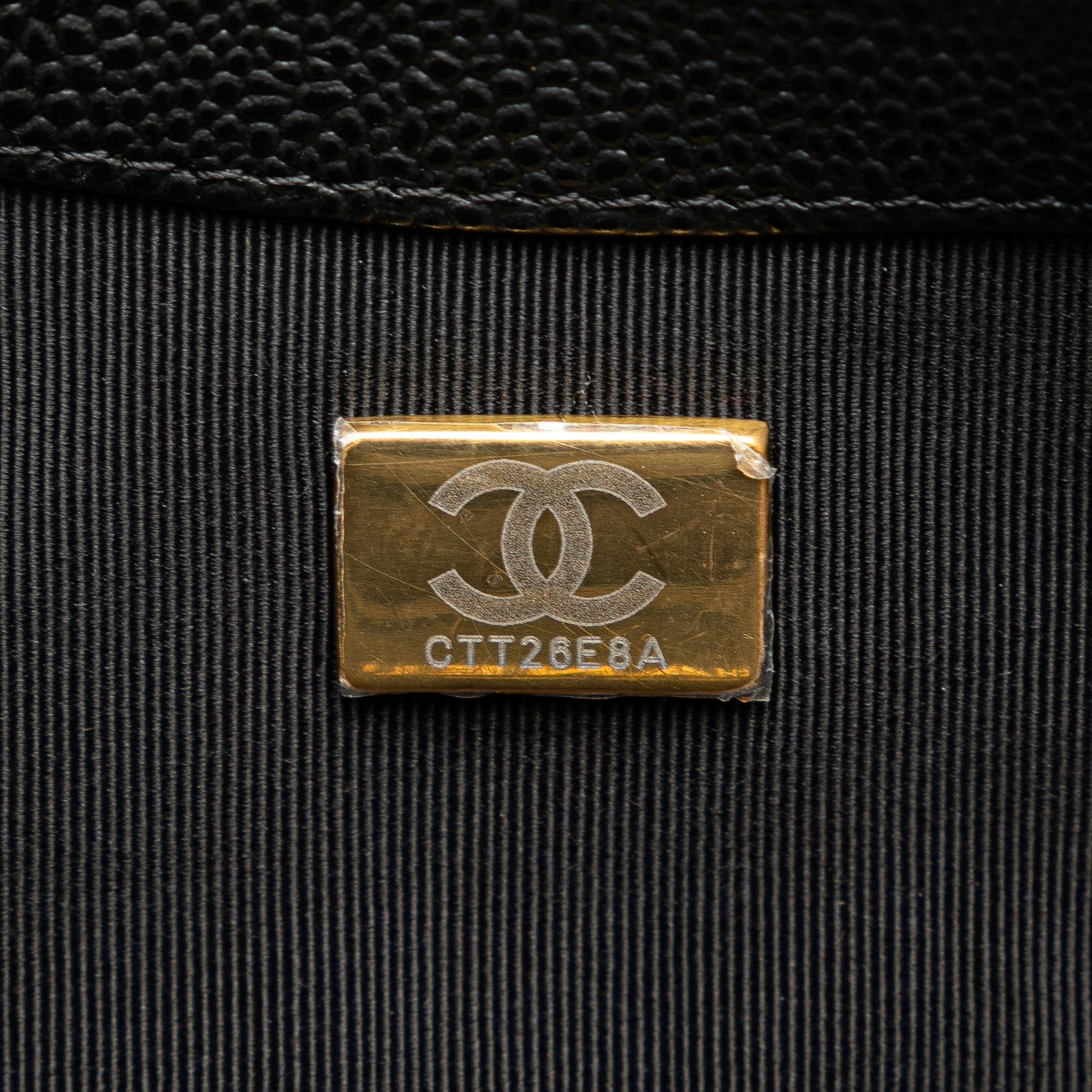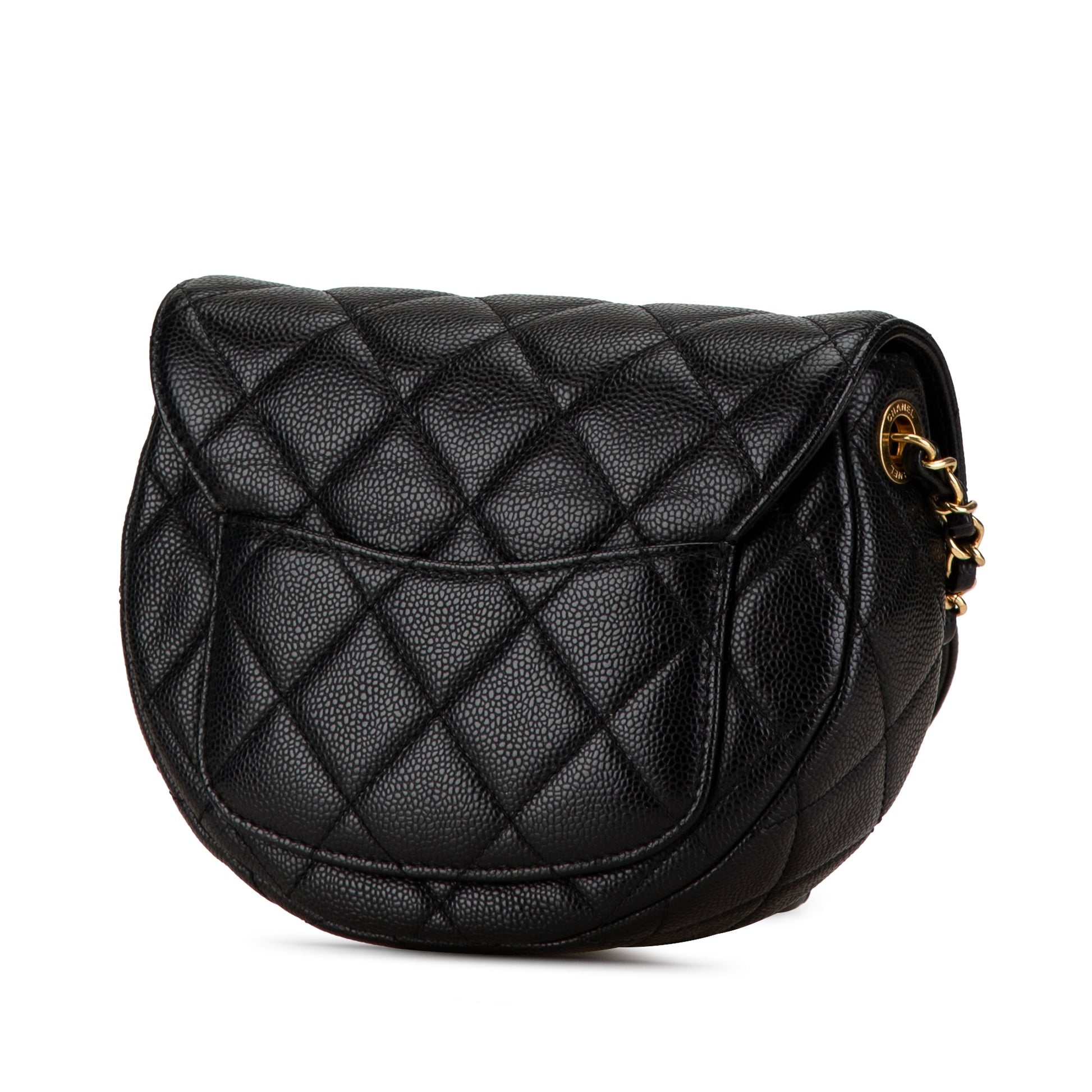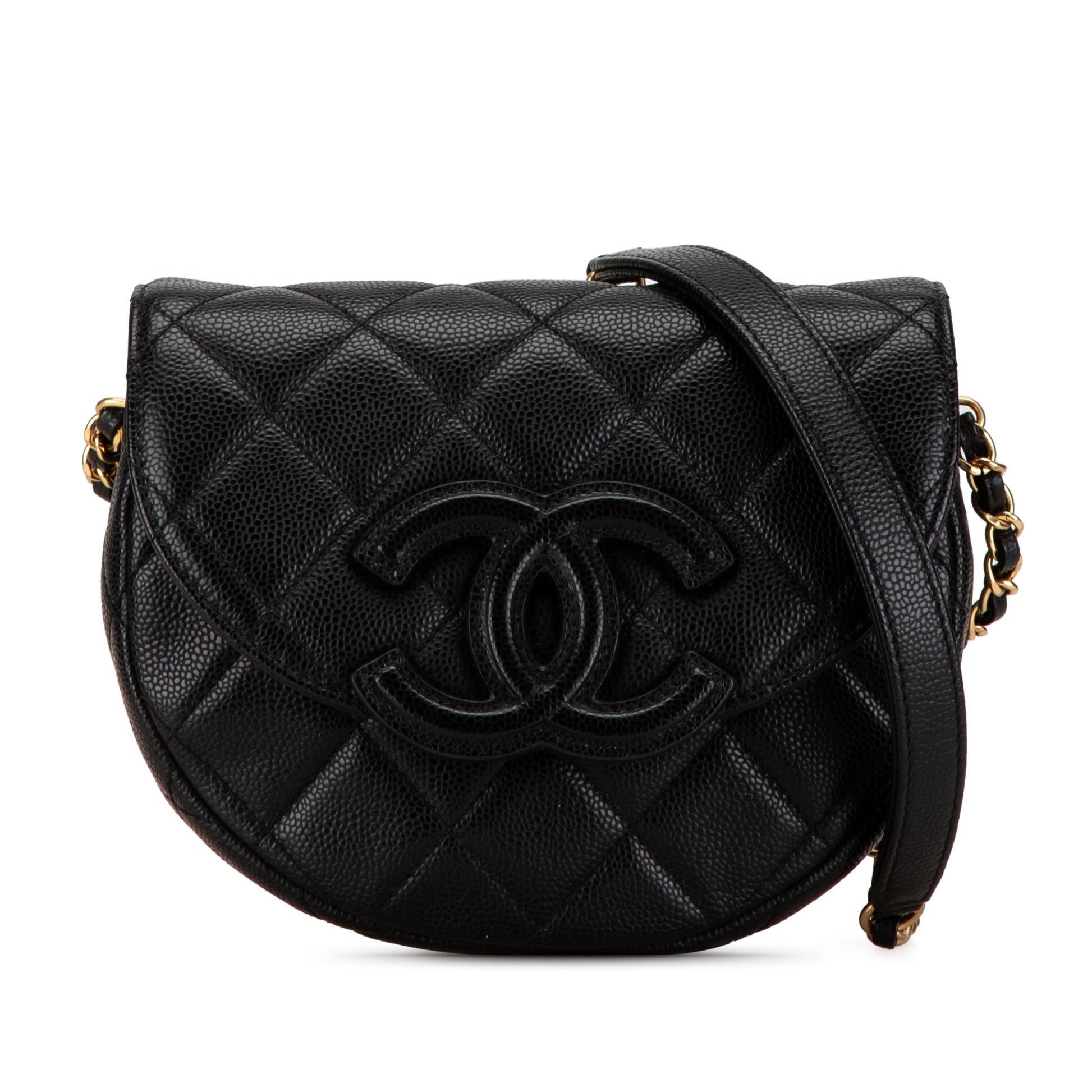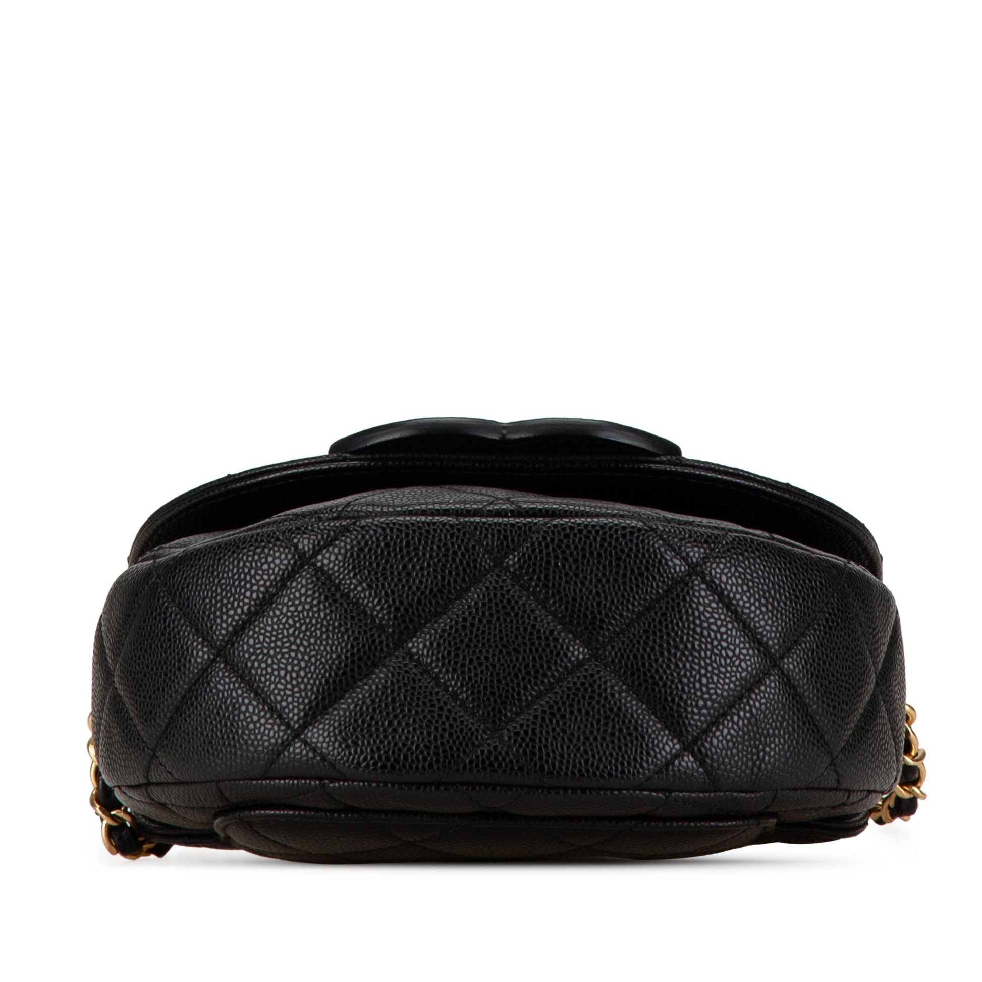 Product Details: Black Chanel Small CC Quilted Caviar Chain Flap Crossbody Bag. This crossbody bag features a quilted caviar leather body, a leather-woven chain strap, a flap with magnetic snap closure, an exterior back slip pocket, and an interior slip pocket. 6.3" L x 7.1" W x 2.4" D. Serial number CTT26E8A.