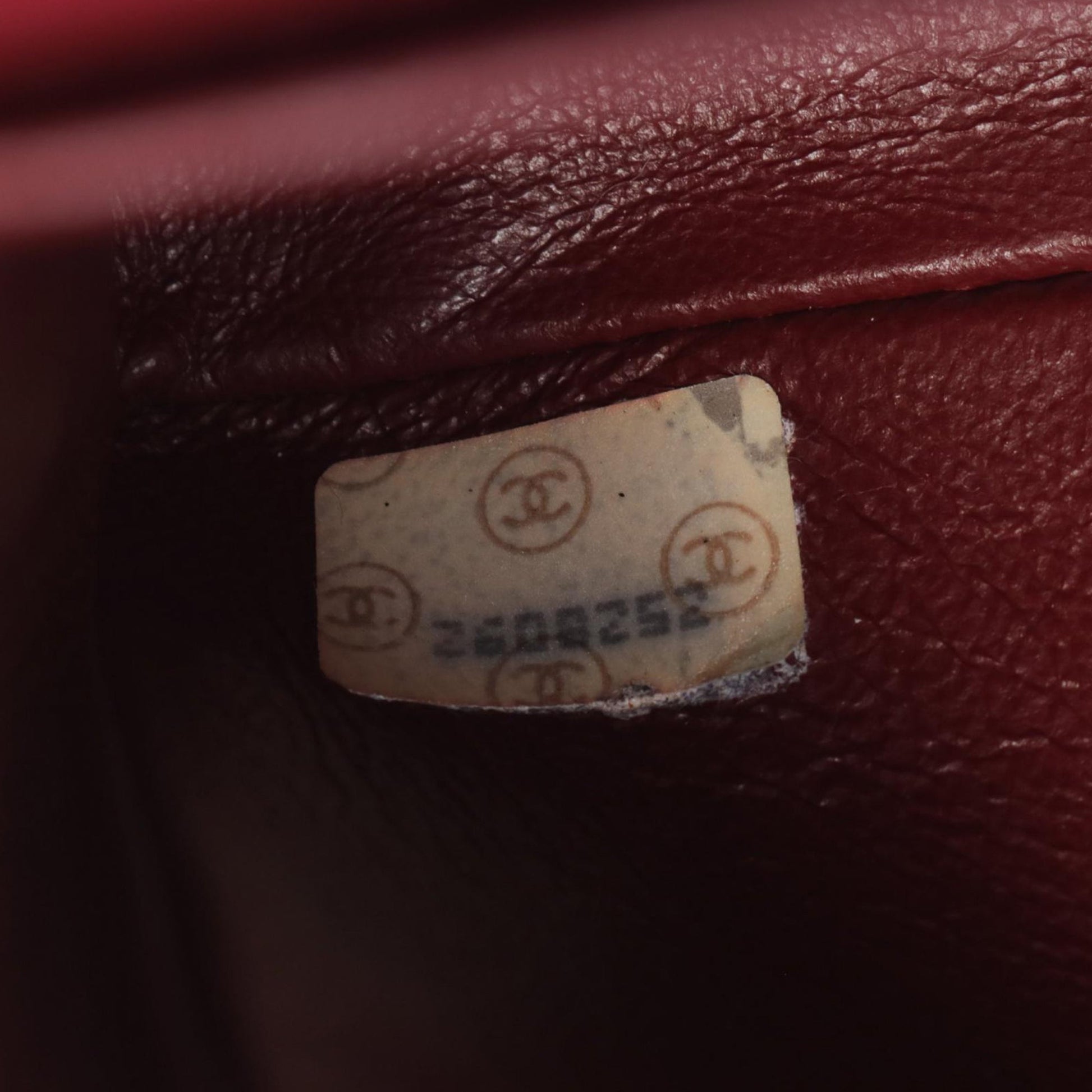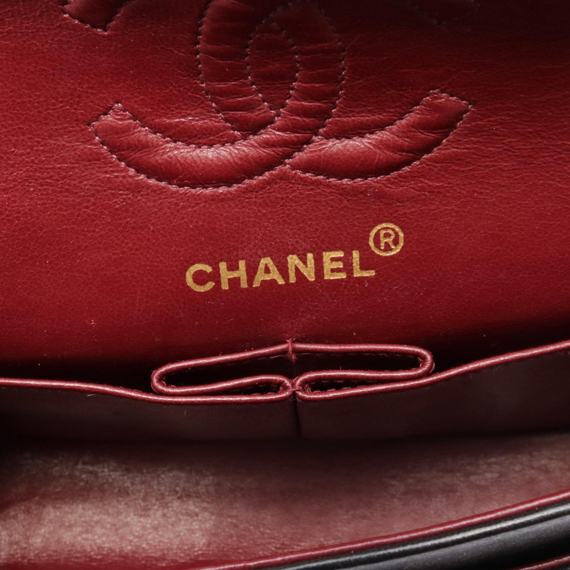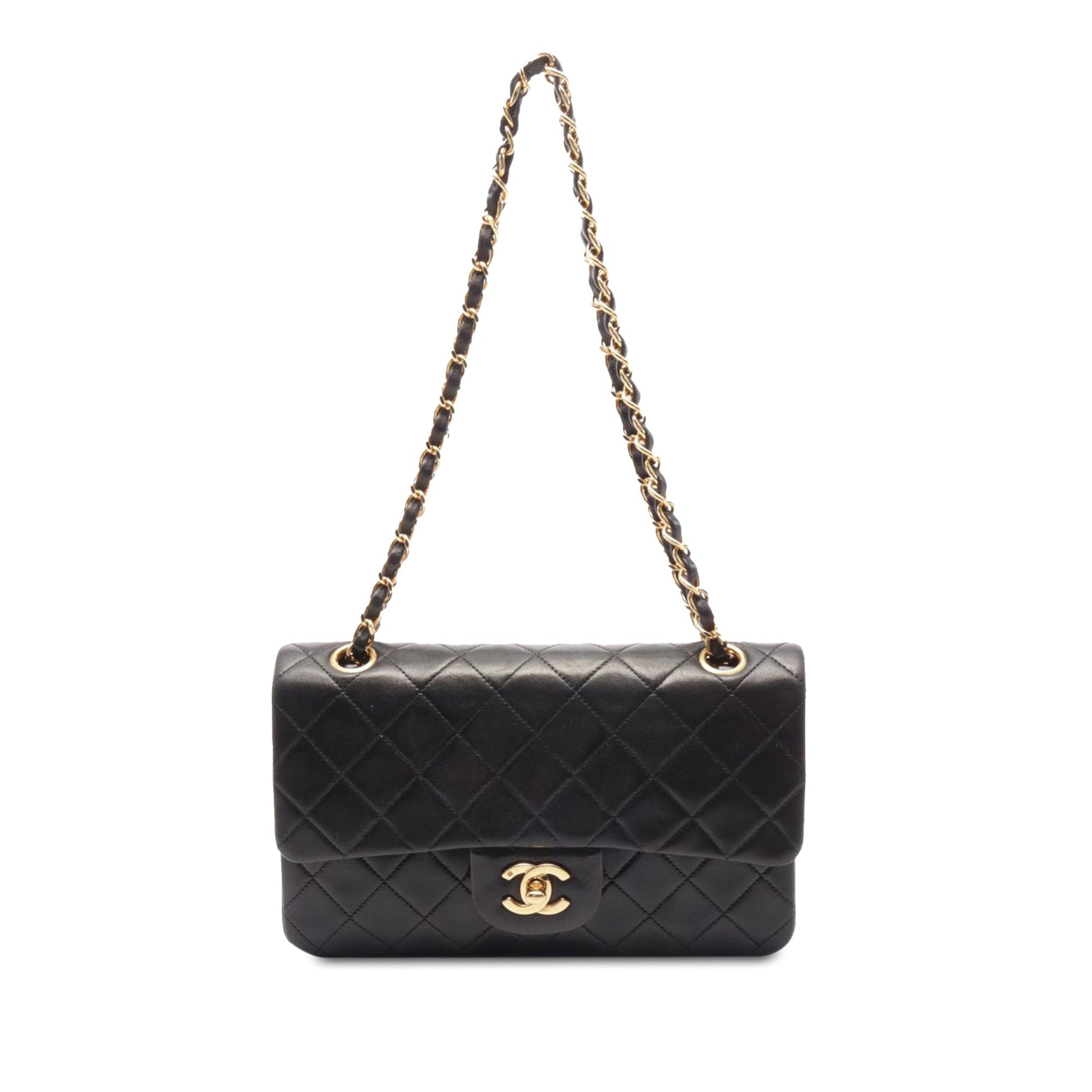 Product Details: Black Chanel Small Classic Lambskin Double Flap Shoulder Bag. This shoulder bag features a quilted lambskin body, leather woven chain shoulder straps, double front flaps with interlocking Cs and a twist lock closure, an exterior back slip pocket, and interior zip and slip pockets. 5.5" L x 9.1" W x 2.4" D. Serial number 2608252.