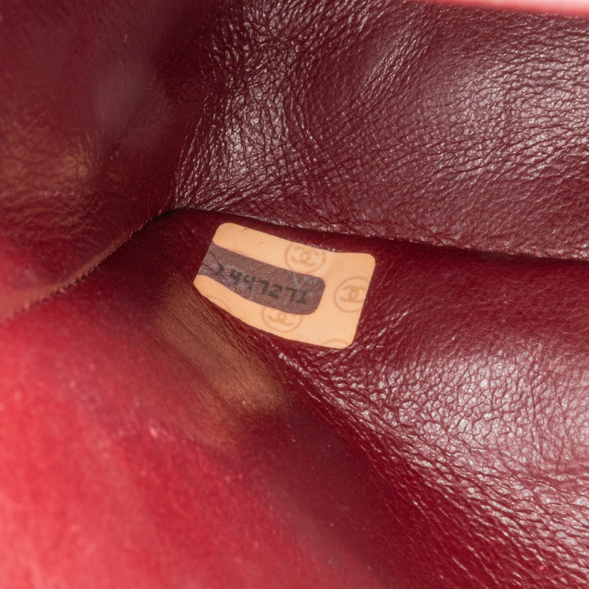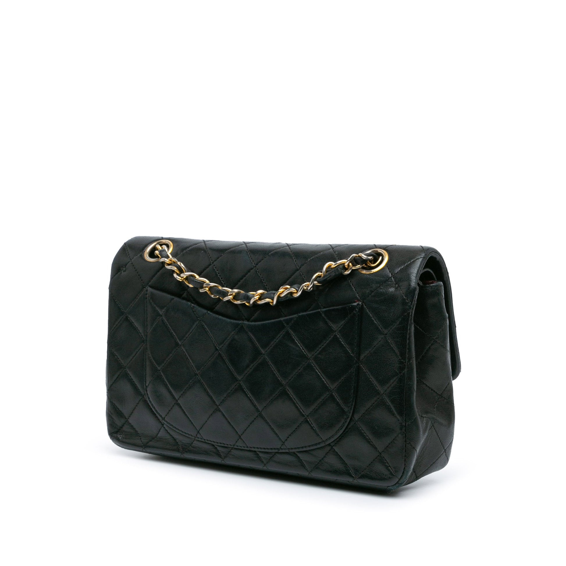 Product Details: Black Chanel Small Classic Lambskin Double Flap Shoulder Bag. This shoulder bag features a quilted lambskin body, leather woven chain shoulder straps, double front flaps with interlocking Cs and a twist lock closure, an exterior back slip pocket, and interior slip pockets. The lining has been reglued. 5.5" L x 9.1" W x 2.4" D, 9.4" drop. Serial number 1447271.