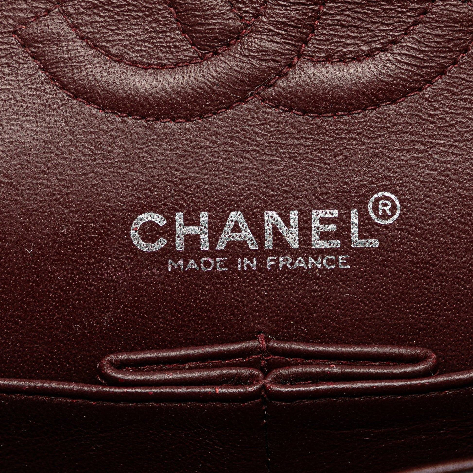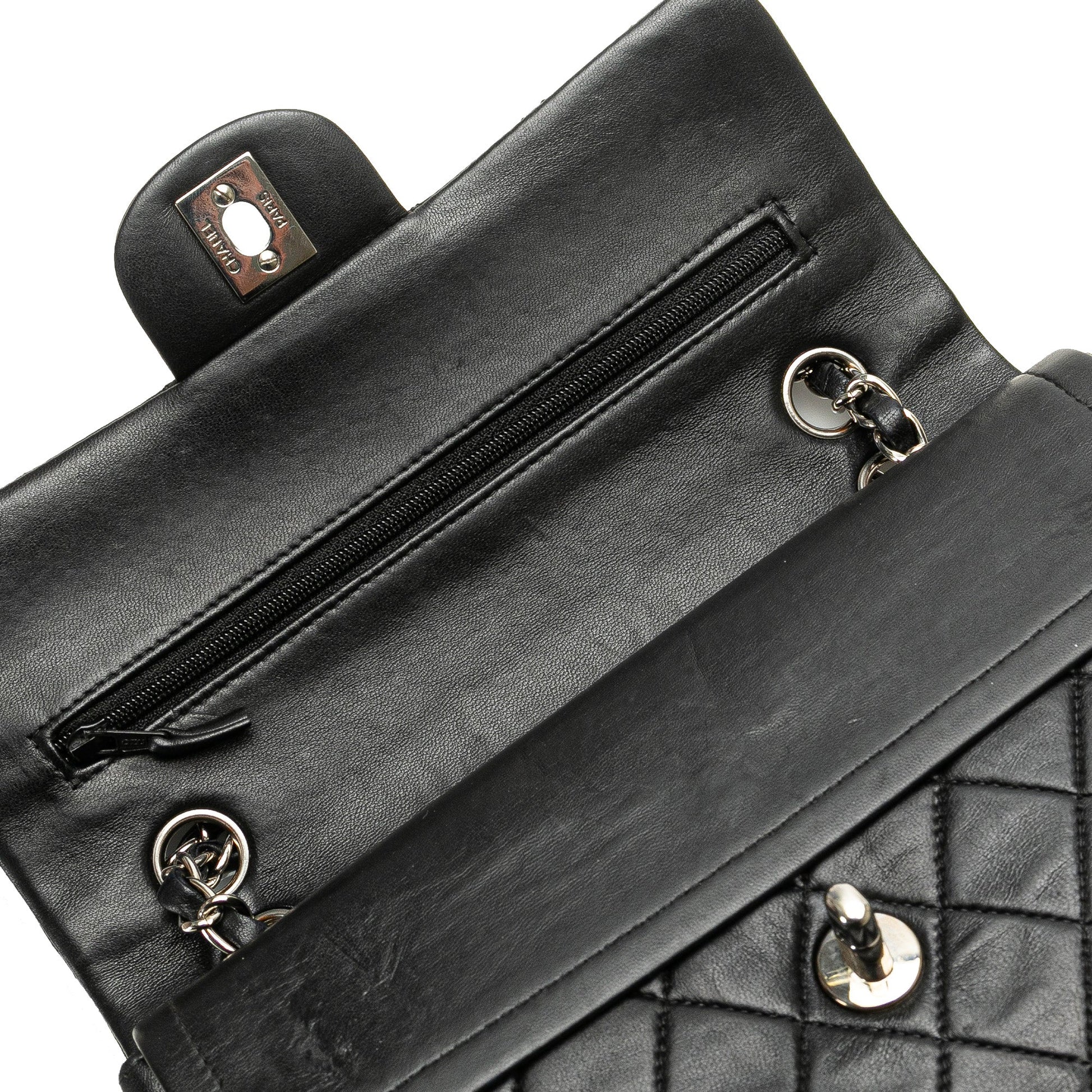 Product Details: Black Chanel Small Classic Lambskin Double Flap Shoulder Bag. This shoulder bag features a quilted lambskin body, leather woven chain shoulder straps, double front flaps with interlocking Cs and a twist lock closure, an exterior back slip pocket, and interior slip pockets. 6.1" L x 8.9" W x 2.4" D, 9.4" drop. Serial number 8574362.