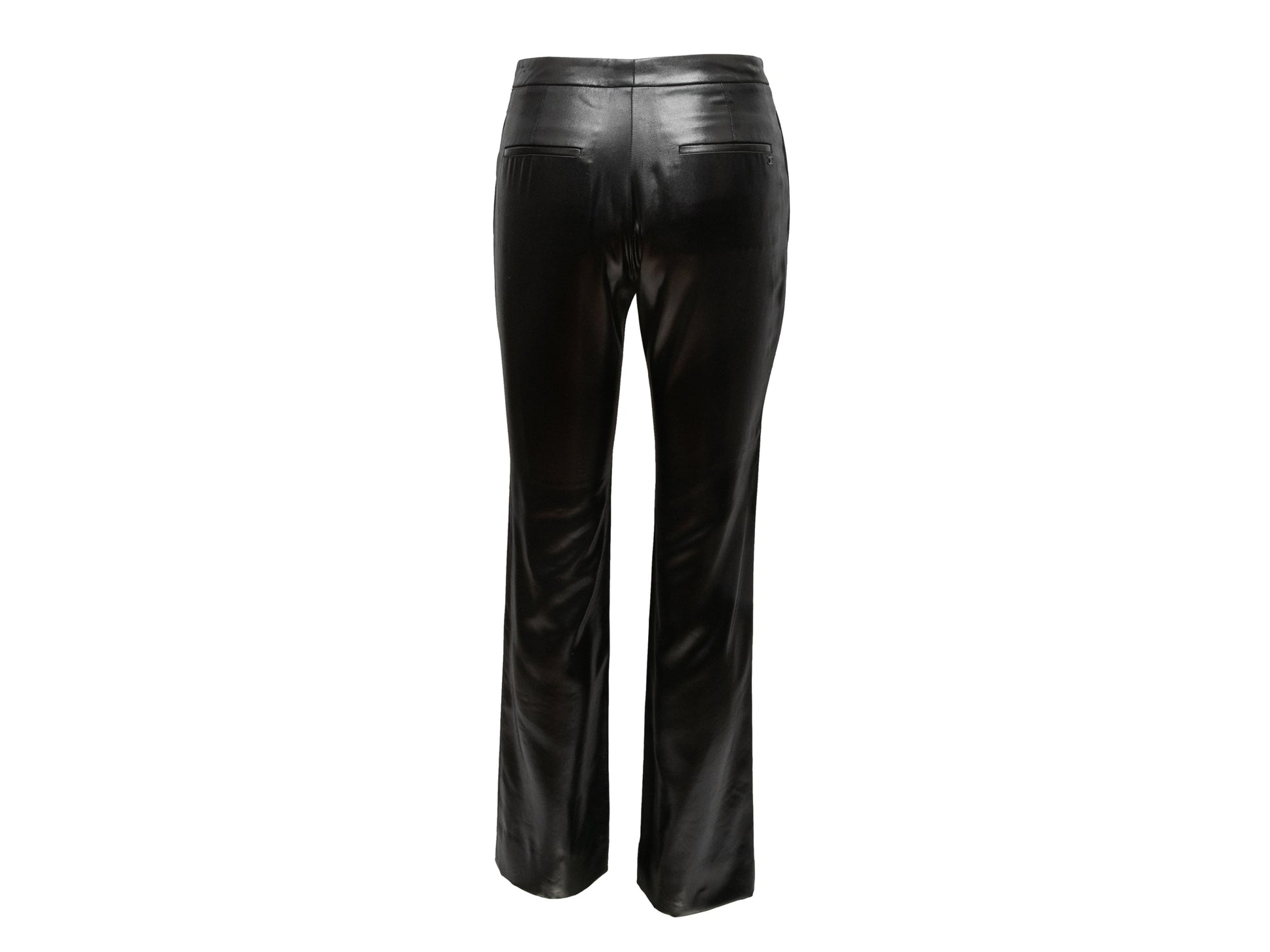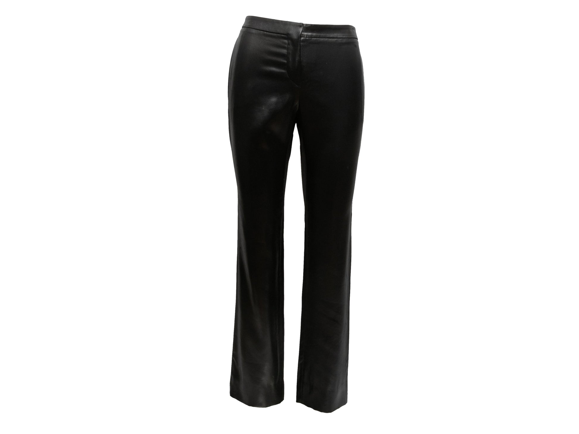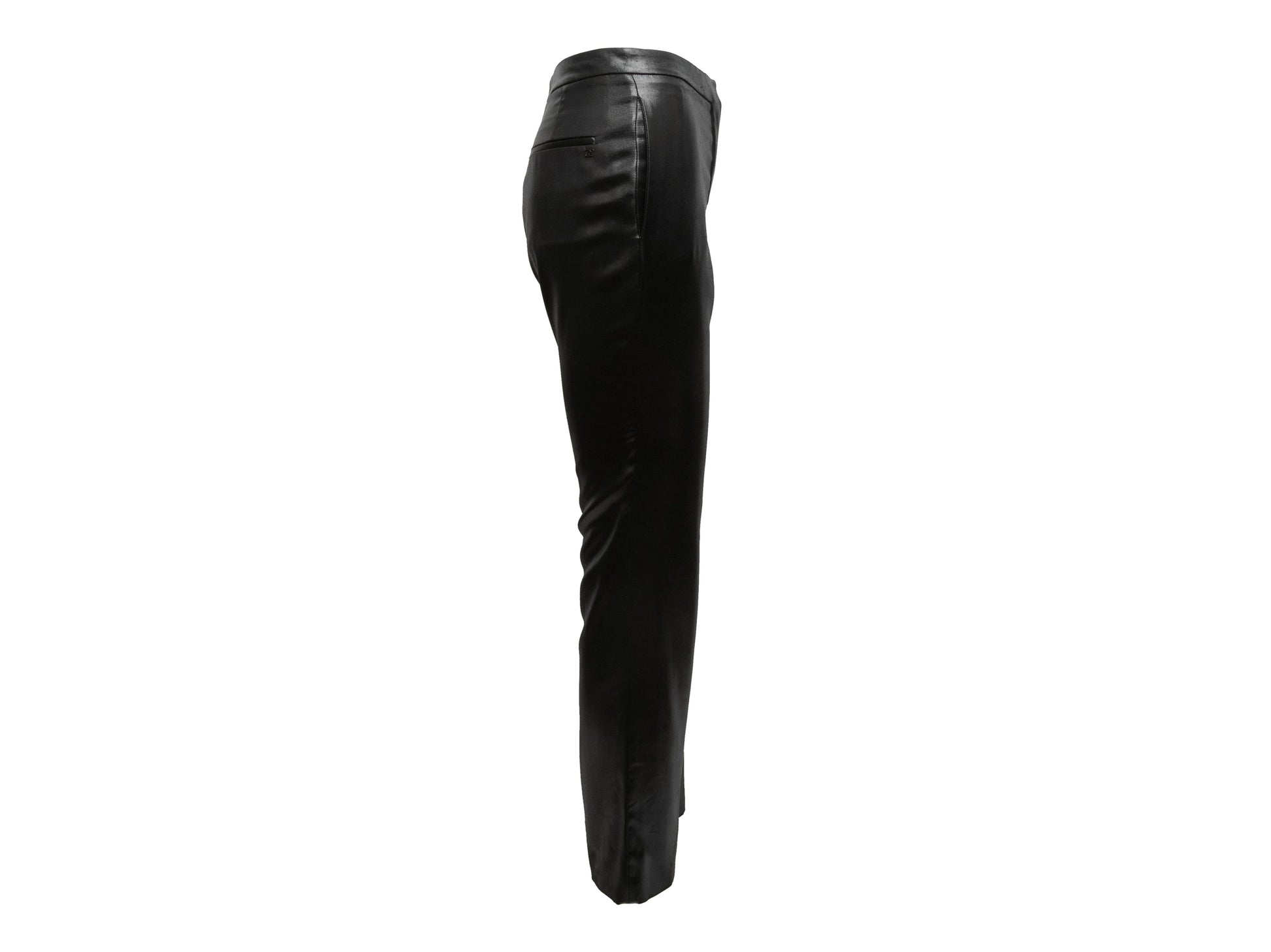 Product Details:Black shiny straight-leg trousers by Chanel. From the Spring/Summer 2009 Collection. Four pockets. Zip closure at front. 25" waist, 34" hips, 30" inseam, 5" rise, 40" length.