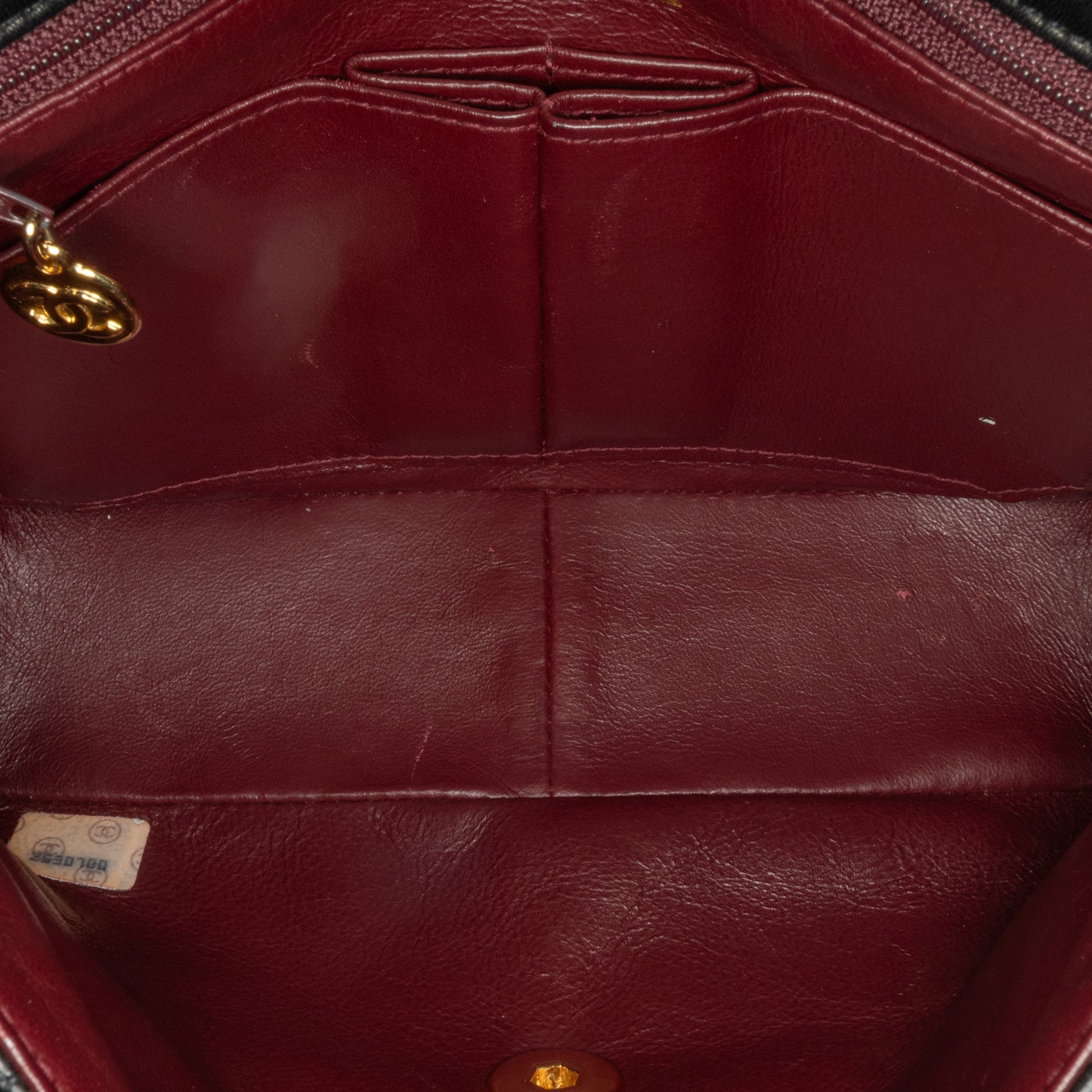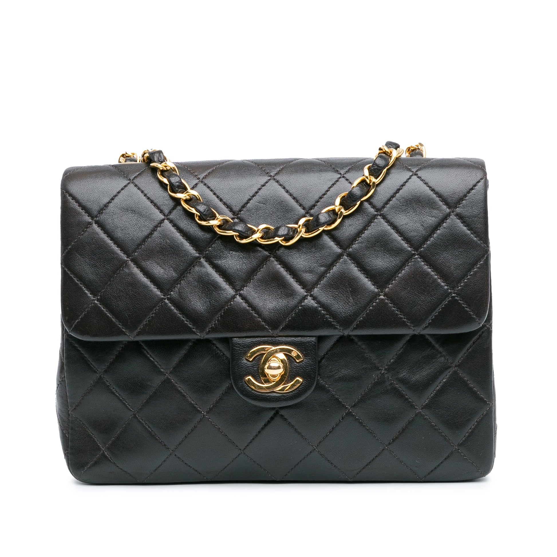 Product Details: Black Chanel Square Classic Quilted Lambskin Flap Crossbody Bag. The Square Flap features a lambskin leather body, a leather woven chain handle, a turnlock closure, and interior zip and slip pockets. 5.9" L x 7.9" W x 2.8" D. Serial number 2530700.