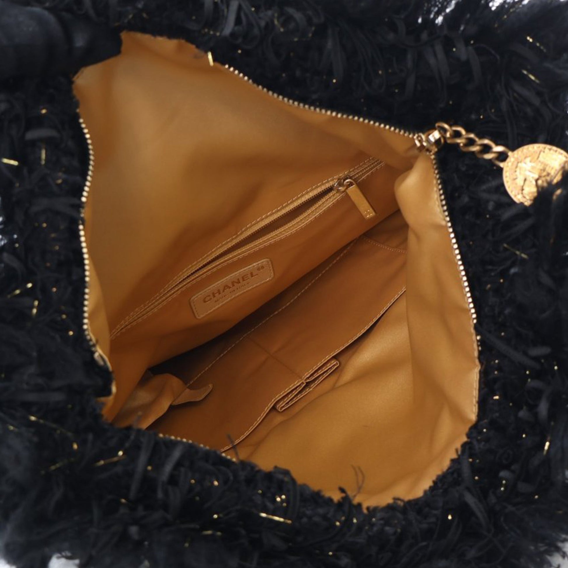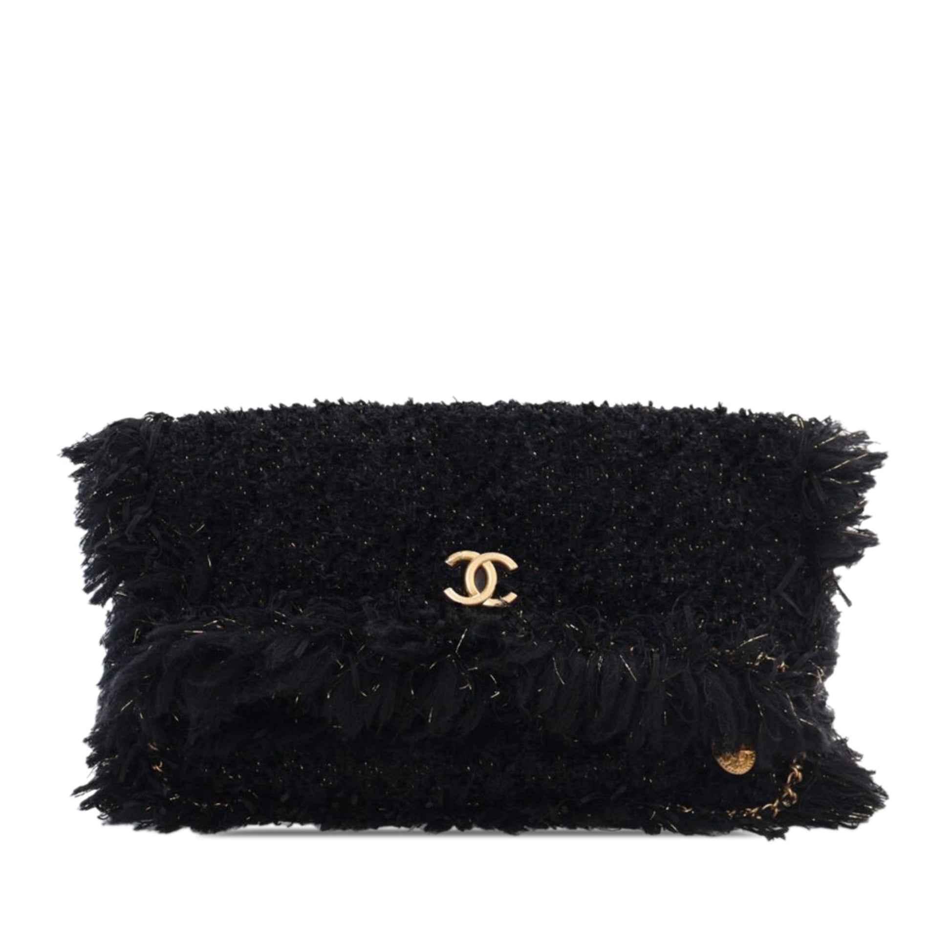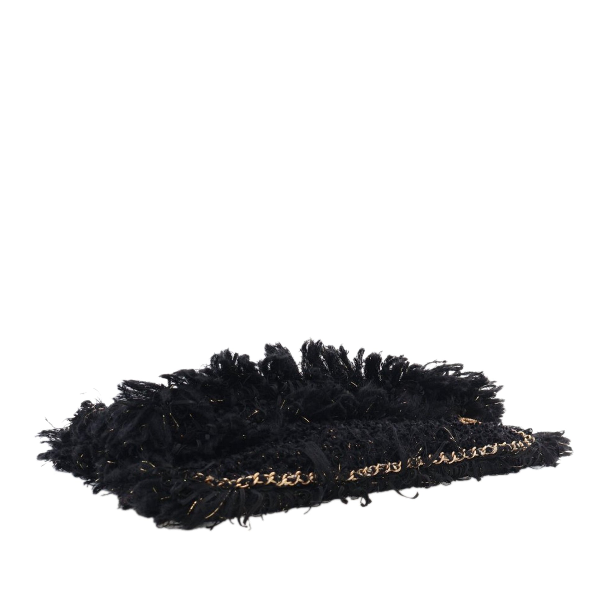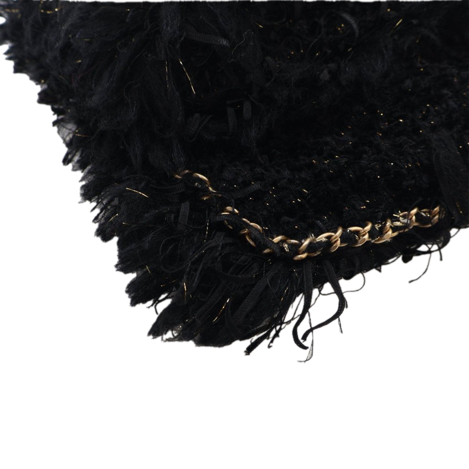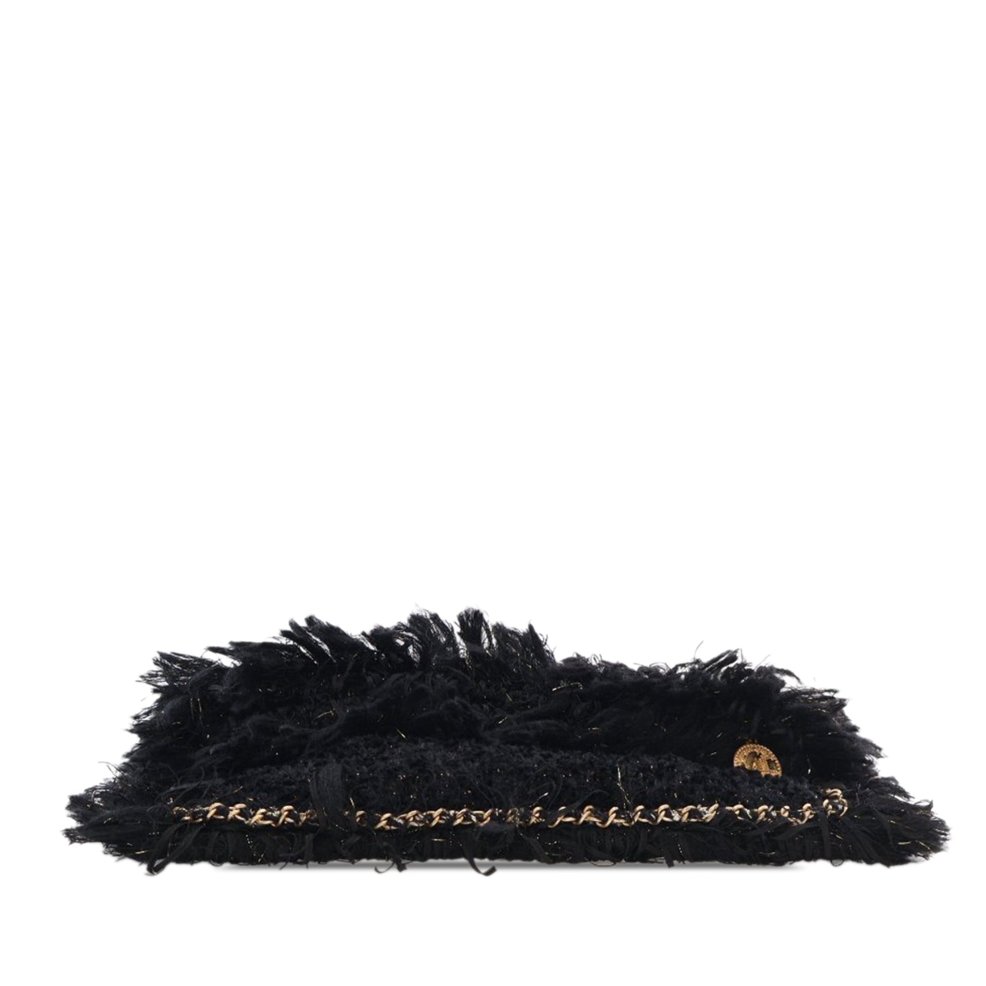Product Details: Black Chanel Tweed Fringe Paris Cosmopolite Clutch. The Paris Cosmopolite Clutch features a fringed tweed body with chain around details, a fold over top flap with magnetic snap and zip closure, and interior zip and slip pockets. 11.8" L x 15.7" W x 3.9" D. Serial number 2451xxxx.