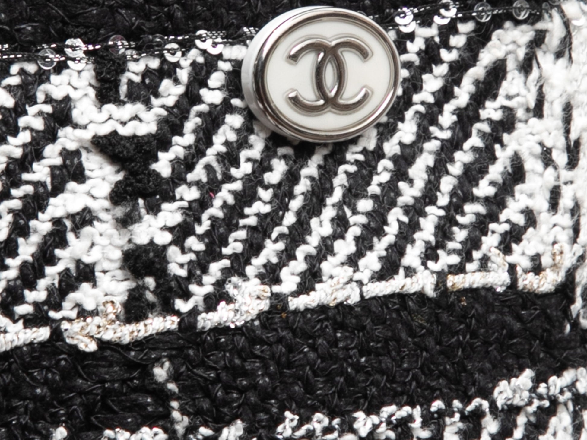Product Details: Black and white tweed plaid wide-leg trousers by Chanel. Side zip and CC button closure. 28" waist, 32" hips, 28.5" inseam, 13.5" rise, 44" length.