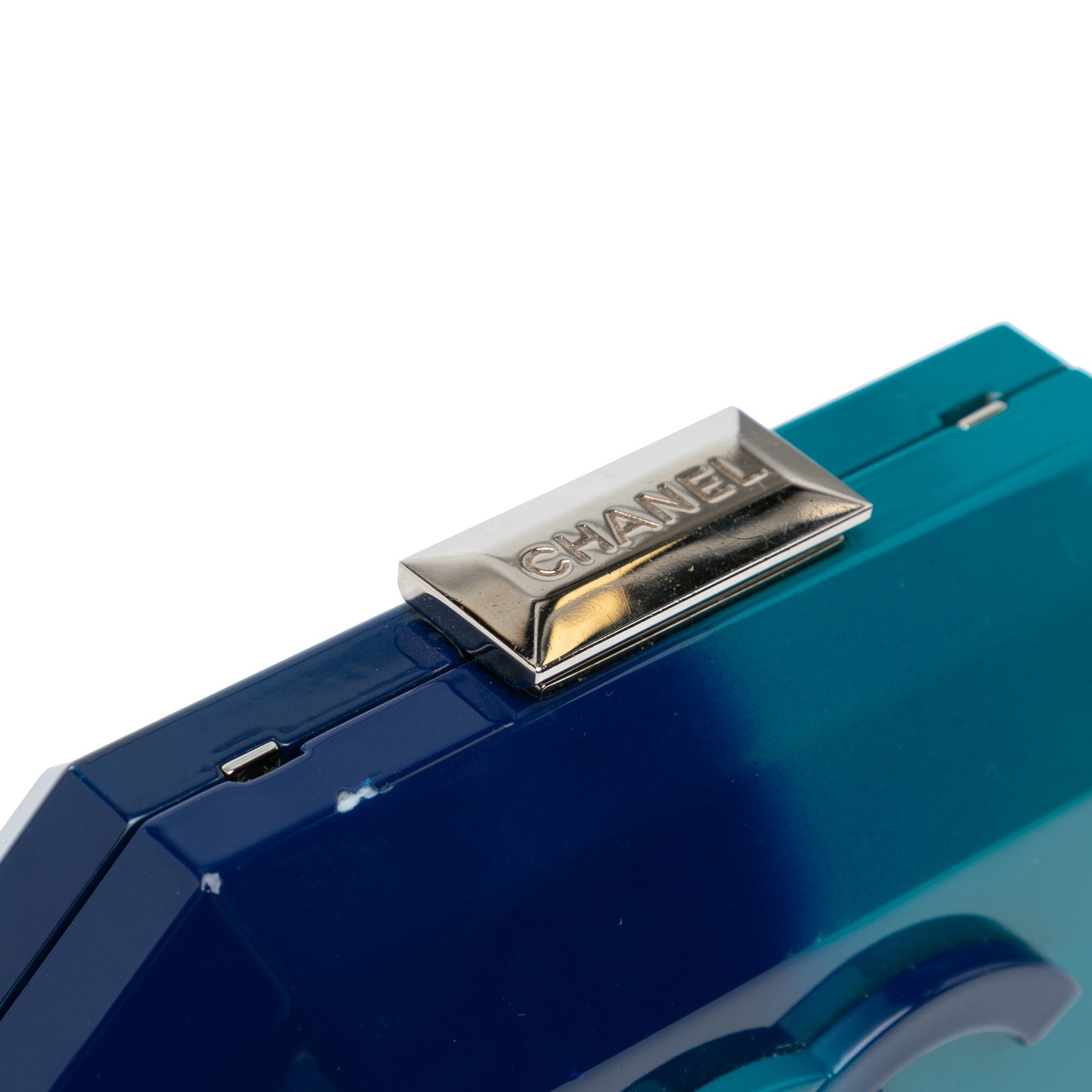 Product Details: Blue Chanel CC Ombre Acrylic Clutch on Chain Crossbody Bag. The Minaudiere features a plexiglass body, a leather woven chain strap, and snap closure. 5.5" L x 6.3" W x 1.2" D. Serial number 19424223.