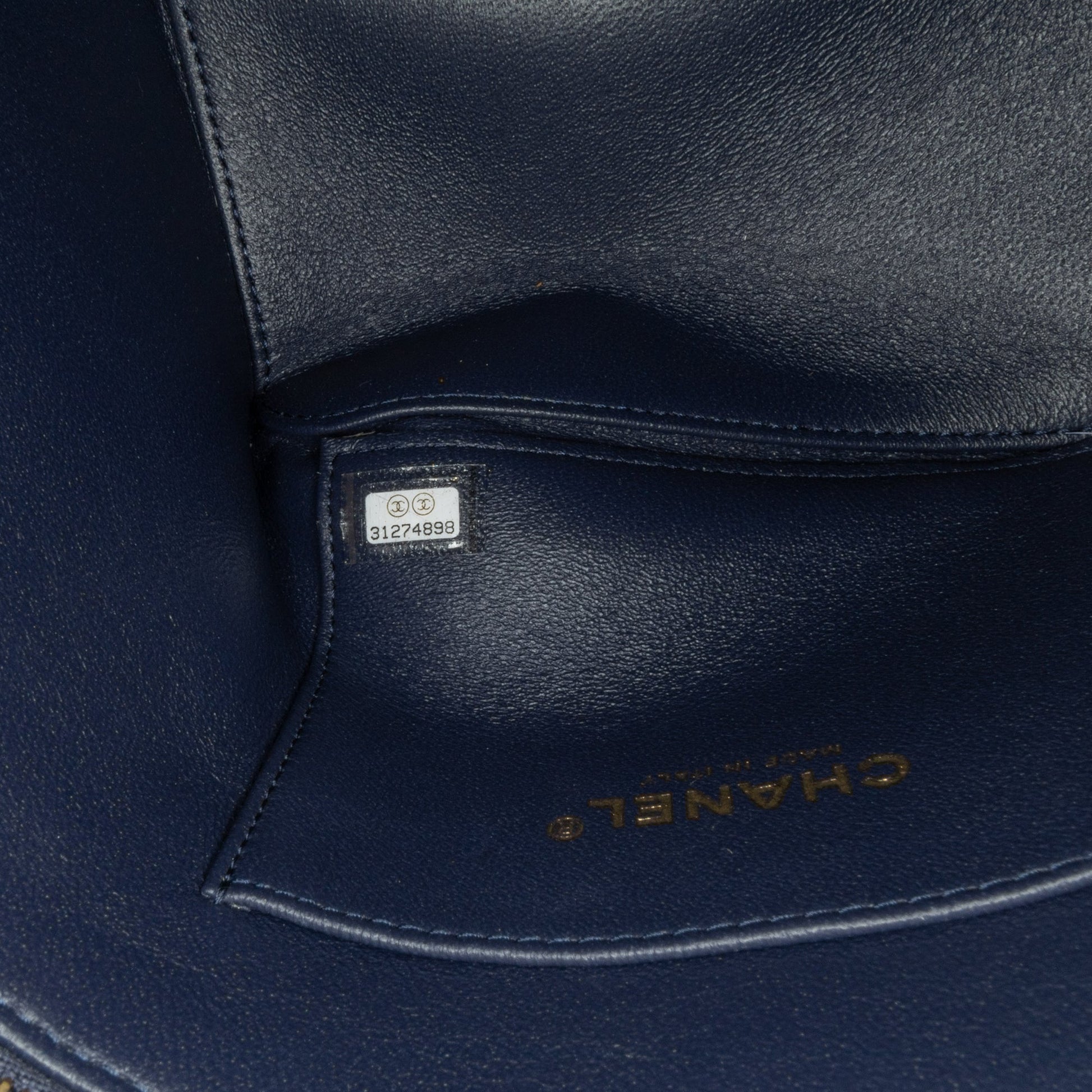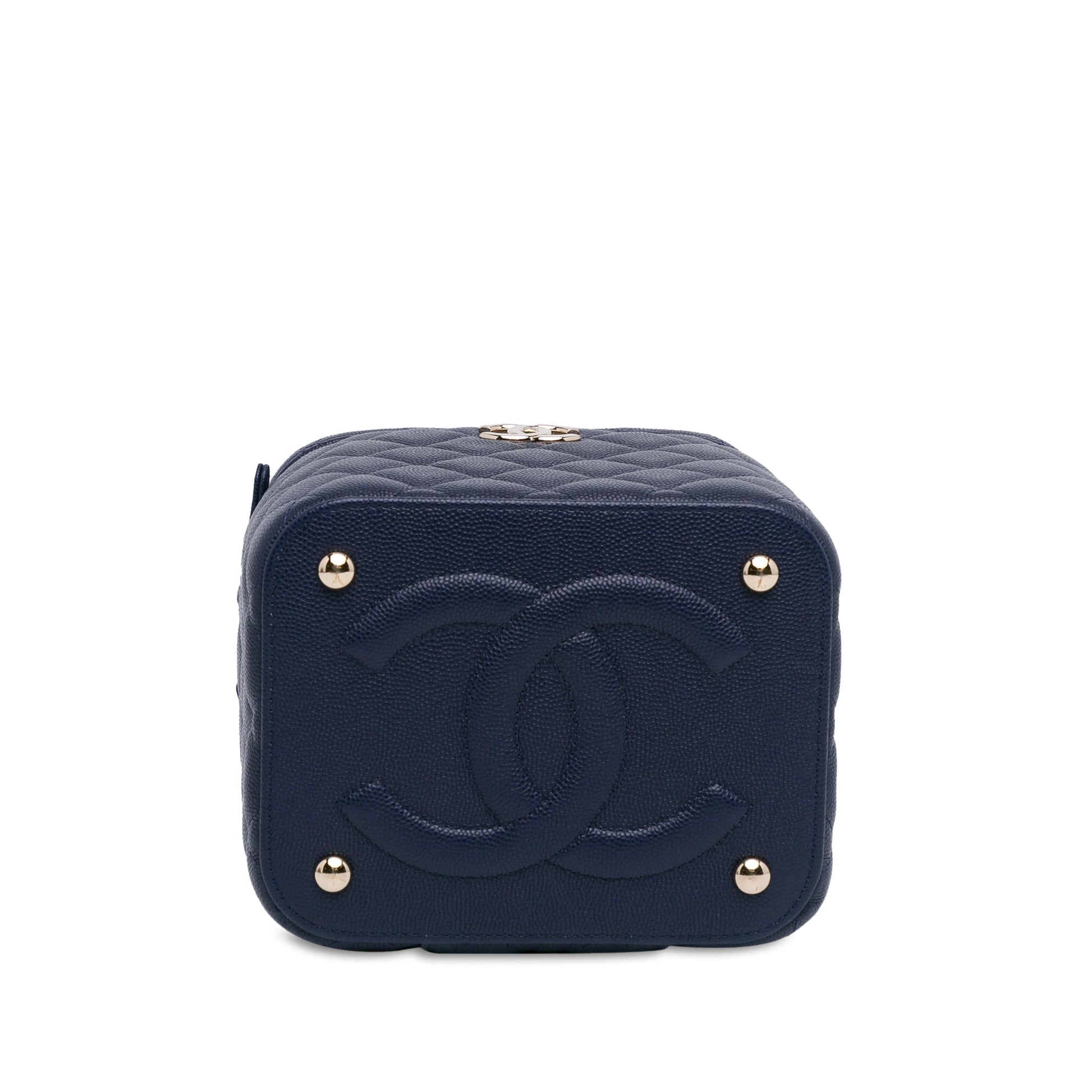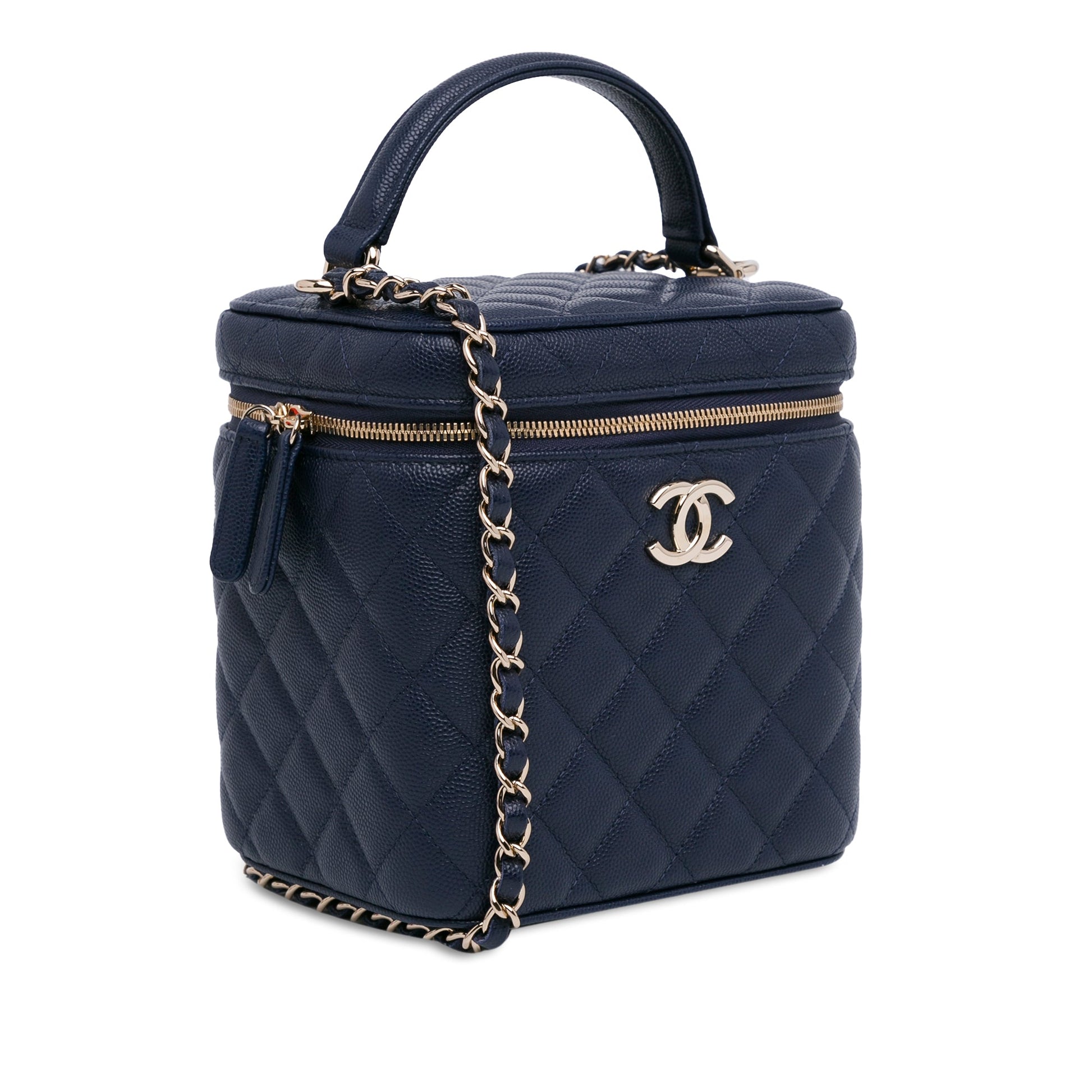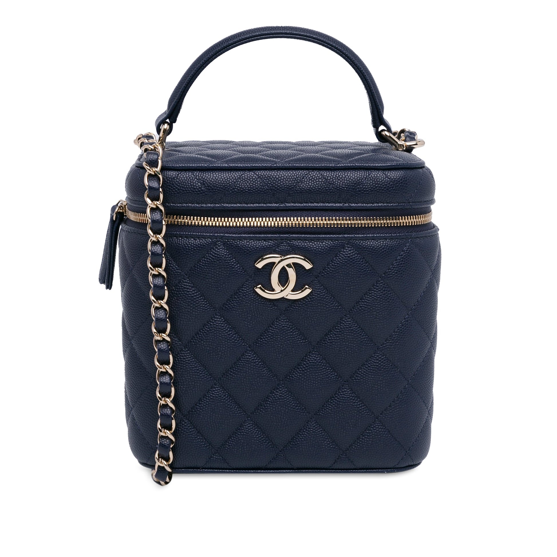 Product Details: Blue Chanel CC Quilted Caviar Top Handle Vanity Case with Chain. This vanity case features a quilted caviar leather body, a flat leather top handle, a leather woven chain strap, a top zip-around closure, and interior slip pockets. 6.3" L x 5.9" W x 4.7" D, 2.4" drop. Serial number 31274898.