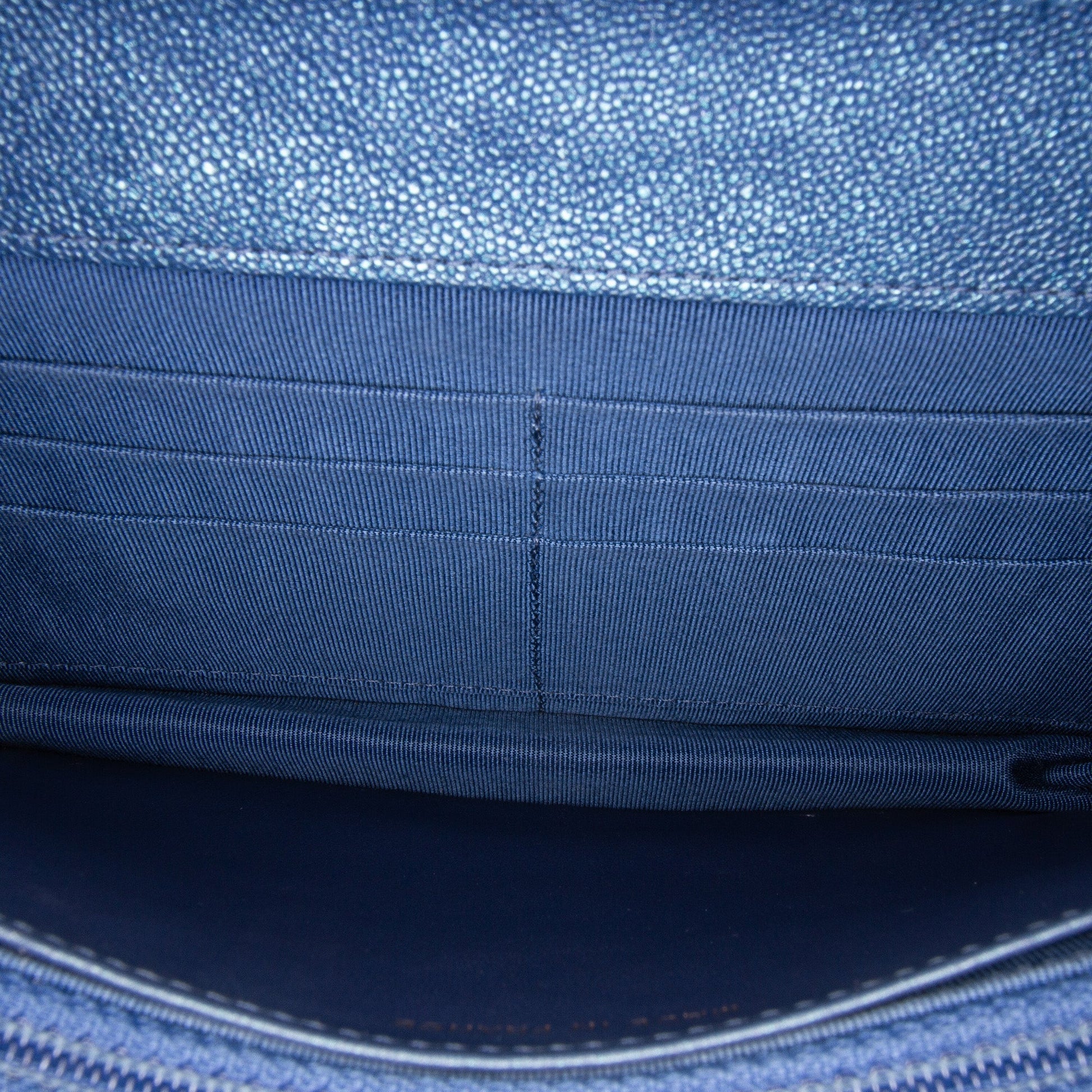 Product Details: Blue Chanel CC Quilted Iridescent Caviar Wallet on Chain Crossbody Bag. This wallet on chain features a quilted caviar leather body, a leather-woven chain strap, a front flap with magnetic snap closure, and interior slip pockets. 4.9" L x 7.5" W x 1.2" D. Serial number 27459799.