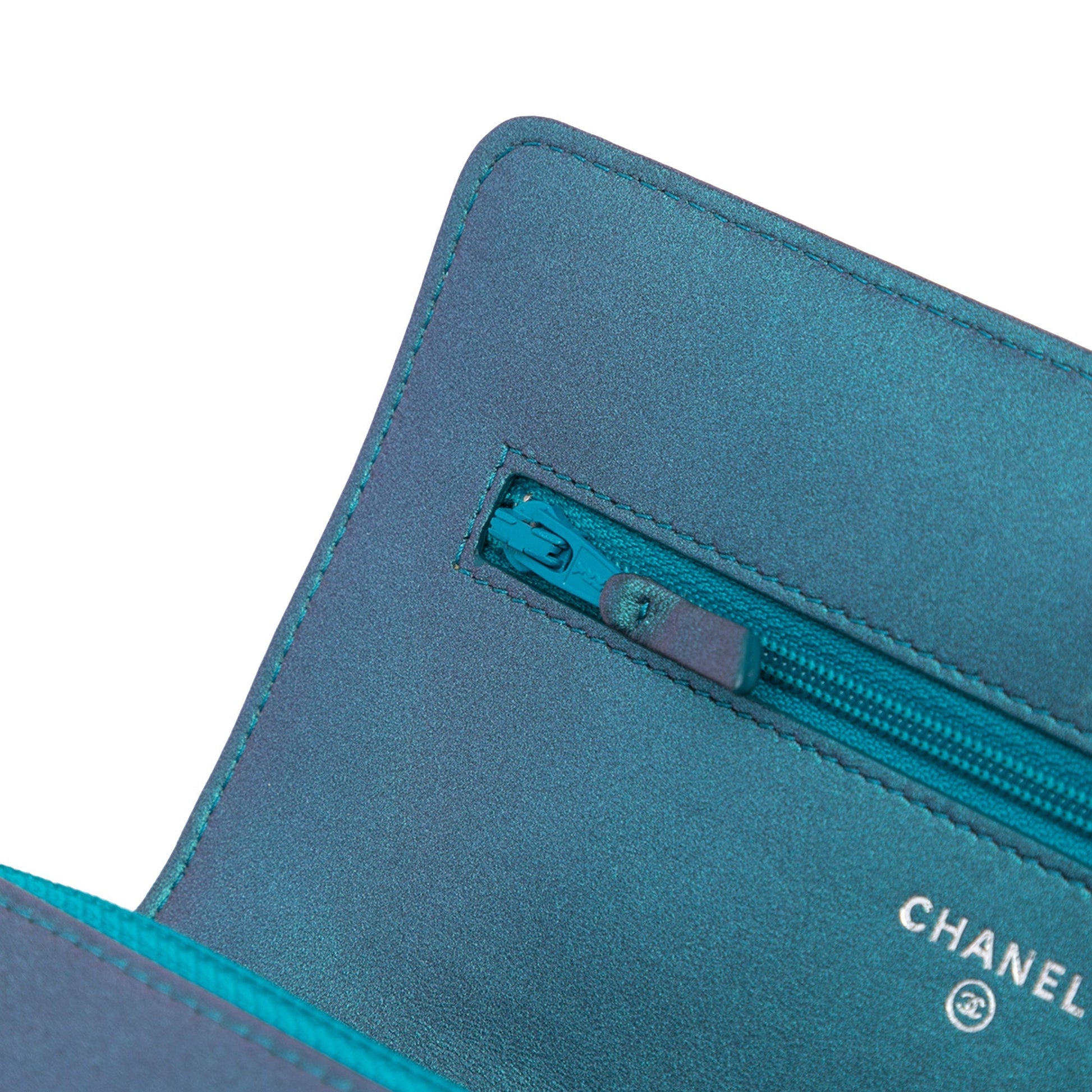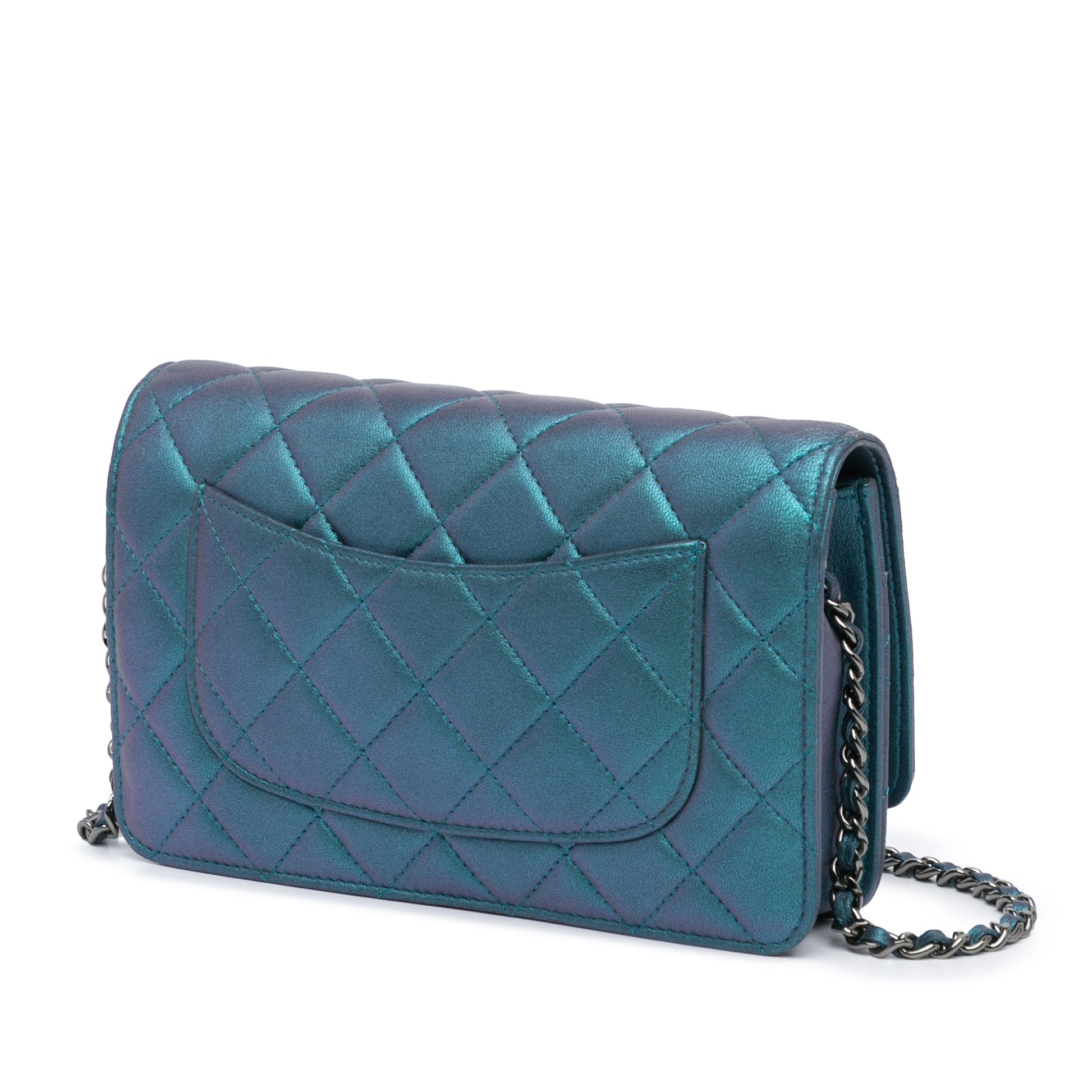 Product Details: Blue Chanel CC Quilted Metallic Lambskin Wallet On Chain Crossbody Bag. This wallet on chain features a quilted lambskin leather body, a leather woven chain shoulder strap, a front flap with magnetic closure, an exterior back slip pocket, and interior zip and slip compartments. 5.1" L x 7.5" W x 1.6" D. Serial number 24050637.