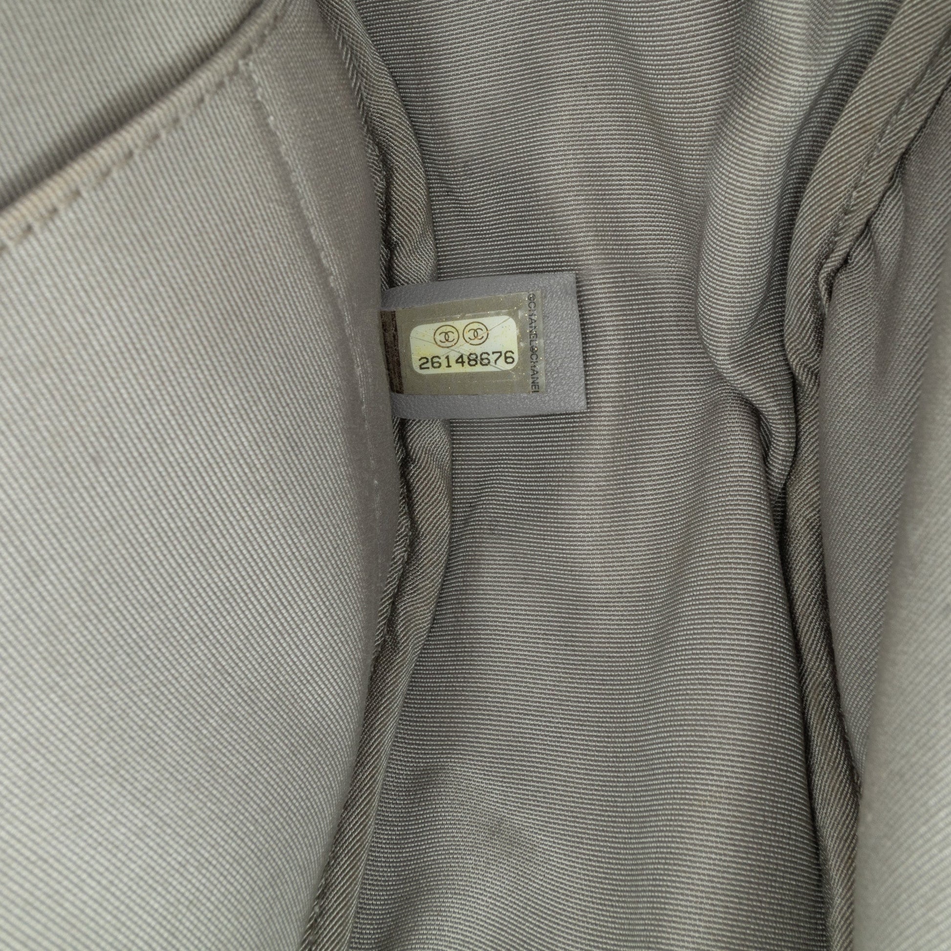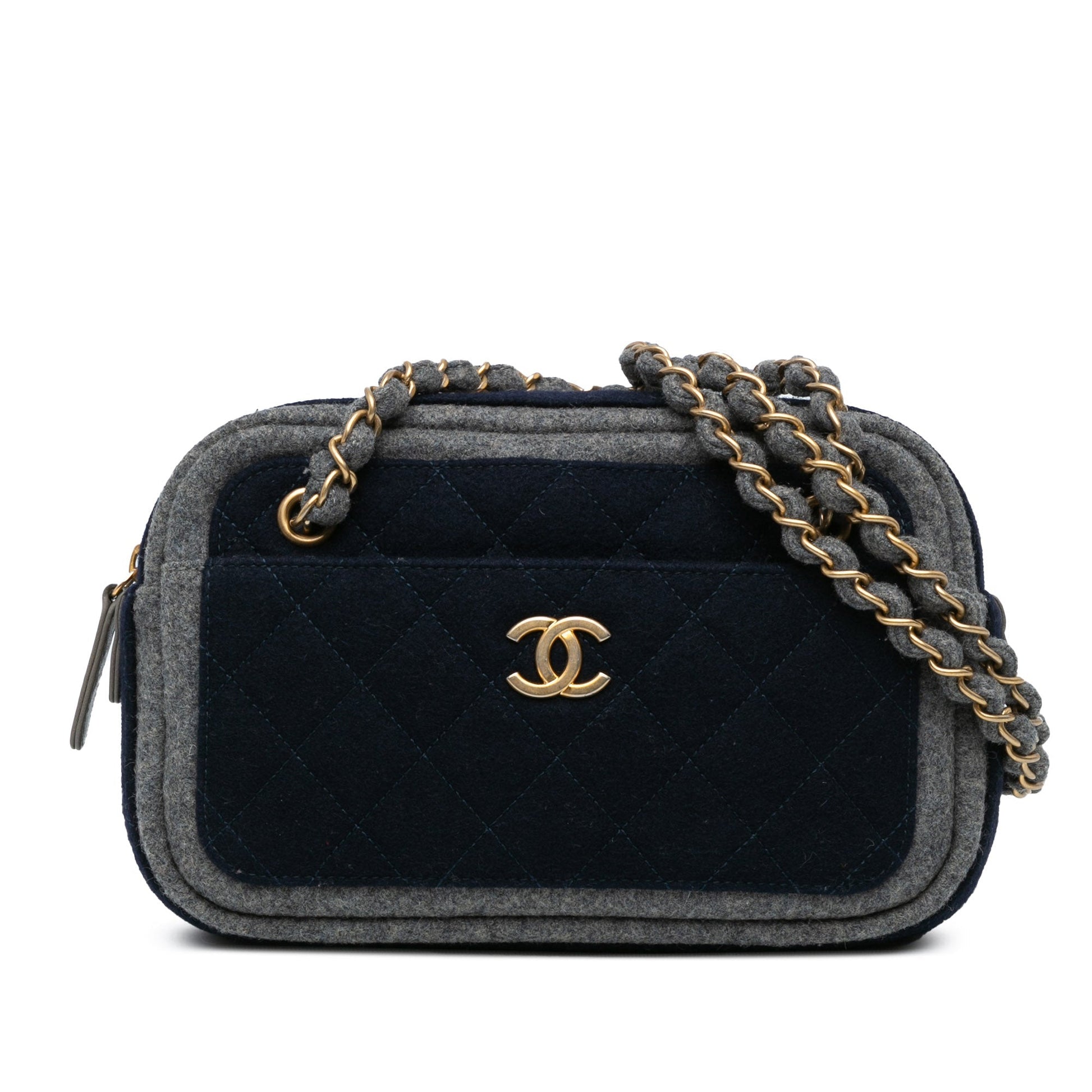 Product Details: Blue Chanel CC Wool Shoulder Bag. This shoulder bag features a quilted wool body, wool woven chain straps, a top zip closure, exterior front and back slip pockets, and interior zip and slip pockets. 6.3" L x 9.4" W x 2.4" D. Serial number 26148676.