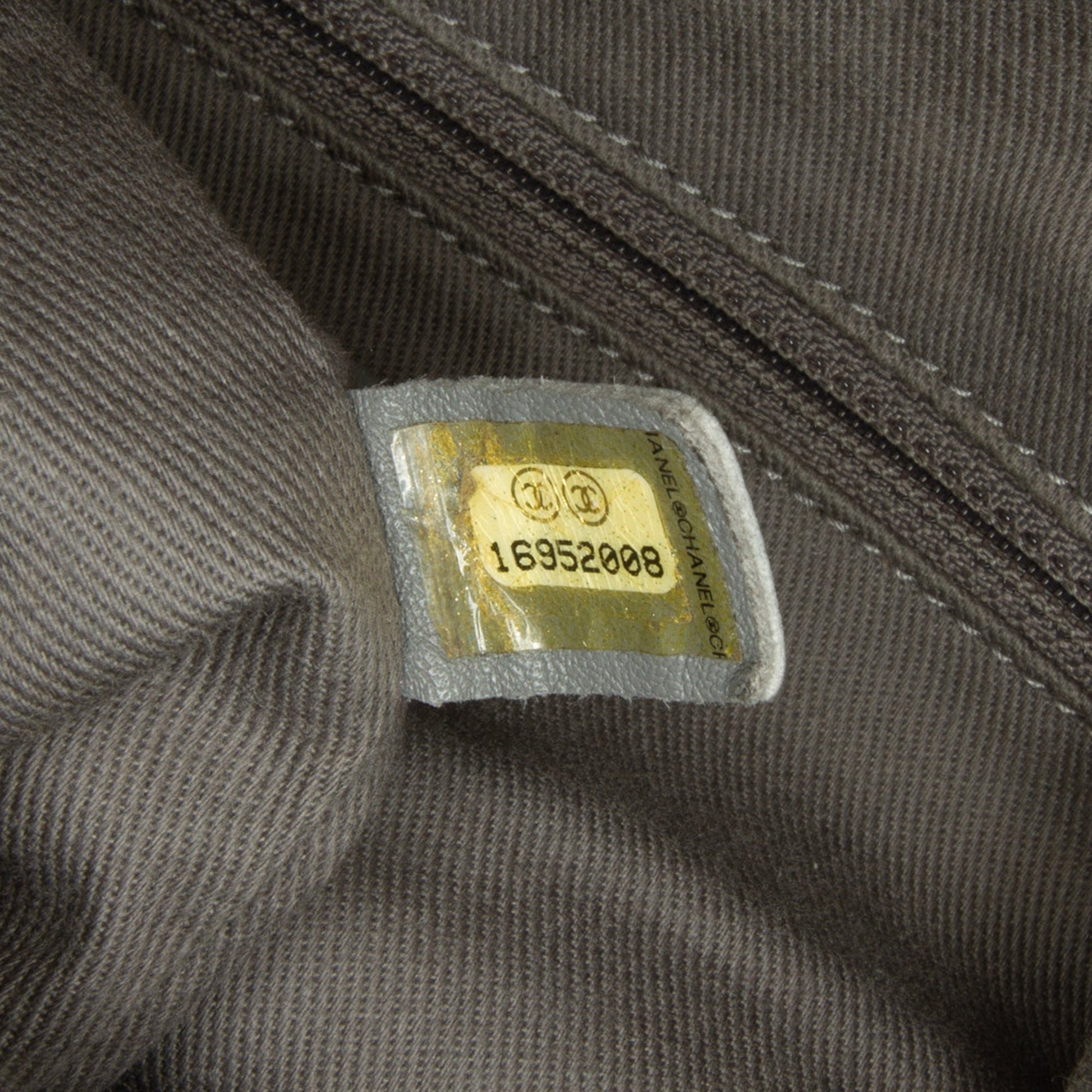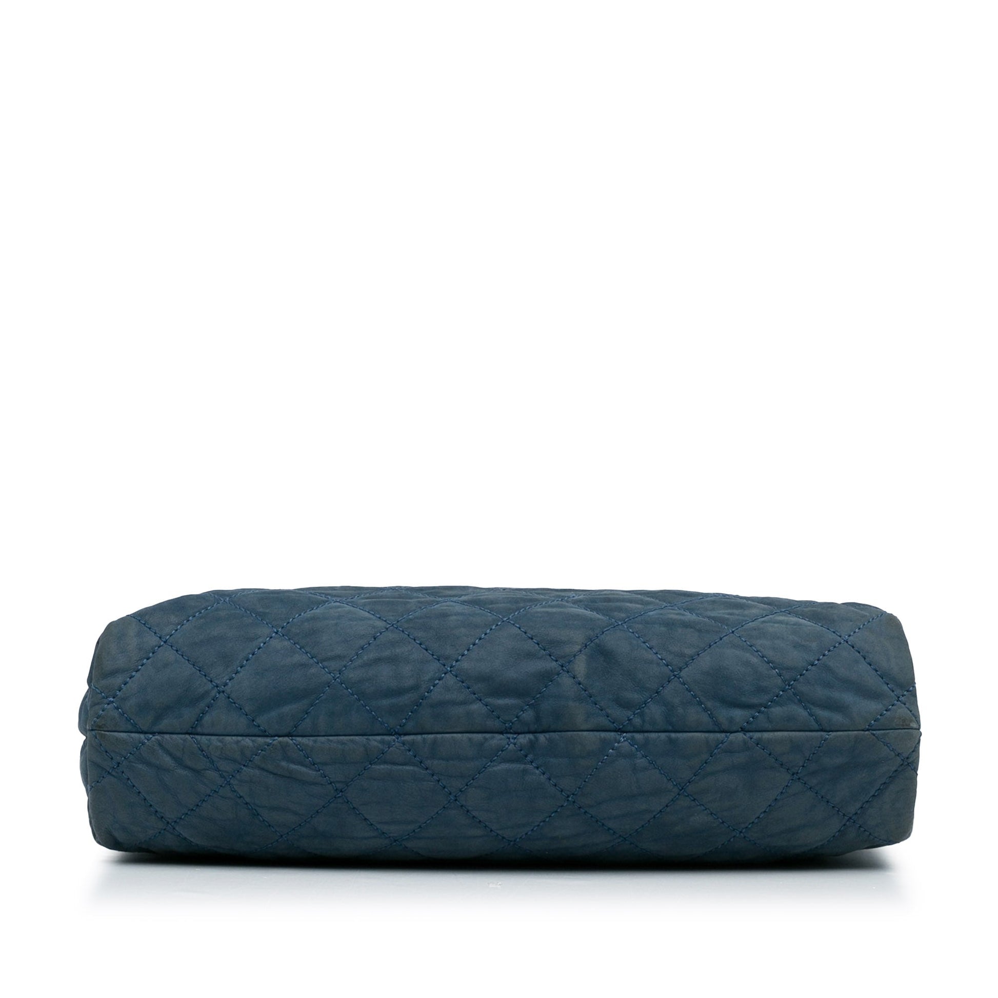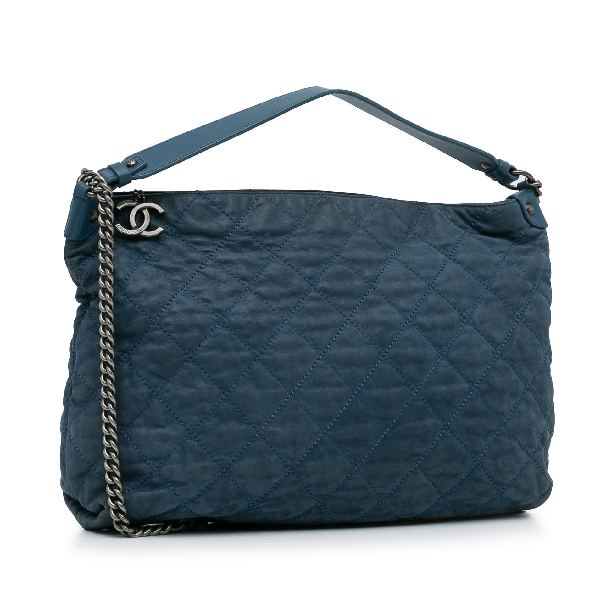 Product Details: Blue Chanel French Riviera Satchel. This satchel features a quilted leather body, a flat leather handle, a silver-tone chain strap, a top zip closure, and interior zip and slip pockets. 15.7" L x 10.6" W x 4.7" D, 5.9" drop. Serial number 16952008.