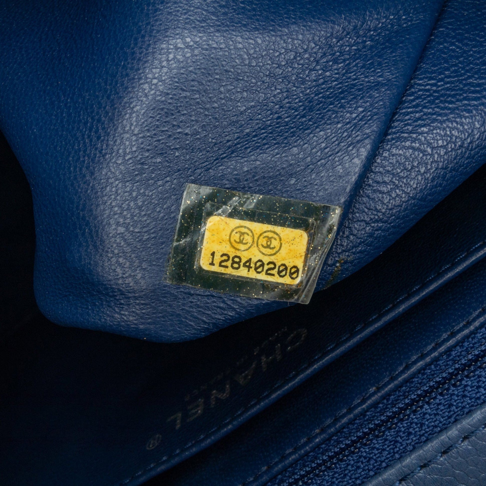 Product Details: Blue Chanel Jumbo Classic Caviar Single Flap Bag. This shoulder bag features a quilted caviar leather body, leather woven chain straps, a top flap with CC turn-lock closure, an exterior back slip pocket, and interior zip and slip pockets. 7.9" L x 11.8" W x 3.1" D, 13.4" drop. Serial number 12840200.
