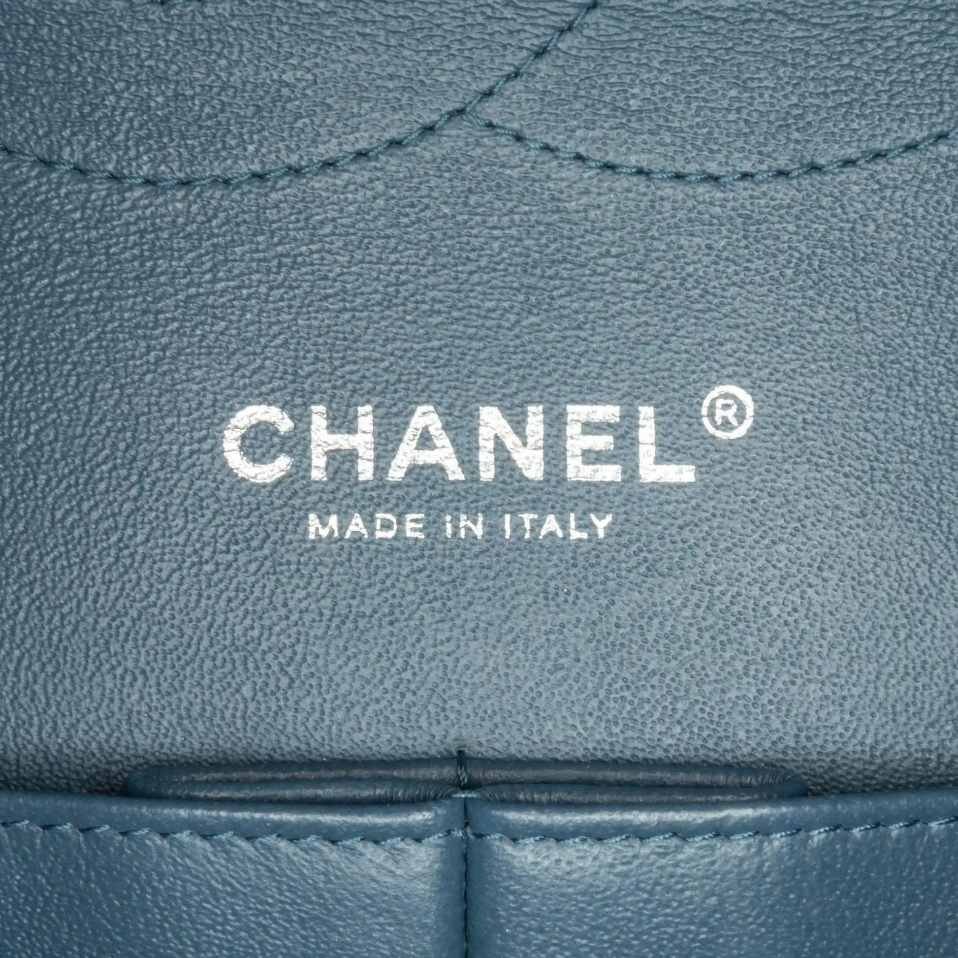 Product Details: Blue Chanel Jumbo Classic Lambskin Double Flap Shoulder Bag. This shoulder bag features a quilted lambskin leather body, leather-woven chain straps, double front flaps with CC turn-lock closure, an exterior back slip pocket, and interior zip and slip pockets. This bag was repainted. 7.9" L x 12.2" W x 3.5" D, 13.4" drop. Serial number 16865399.