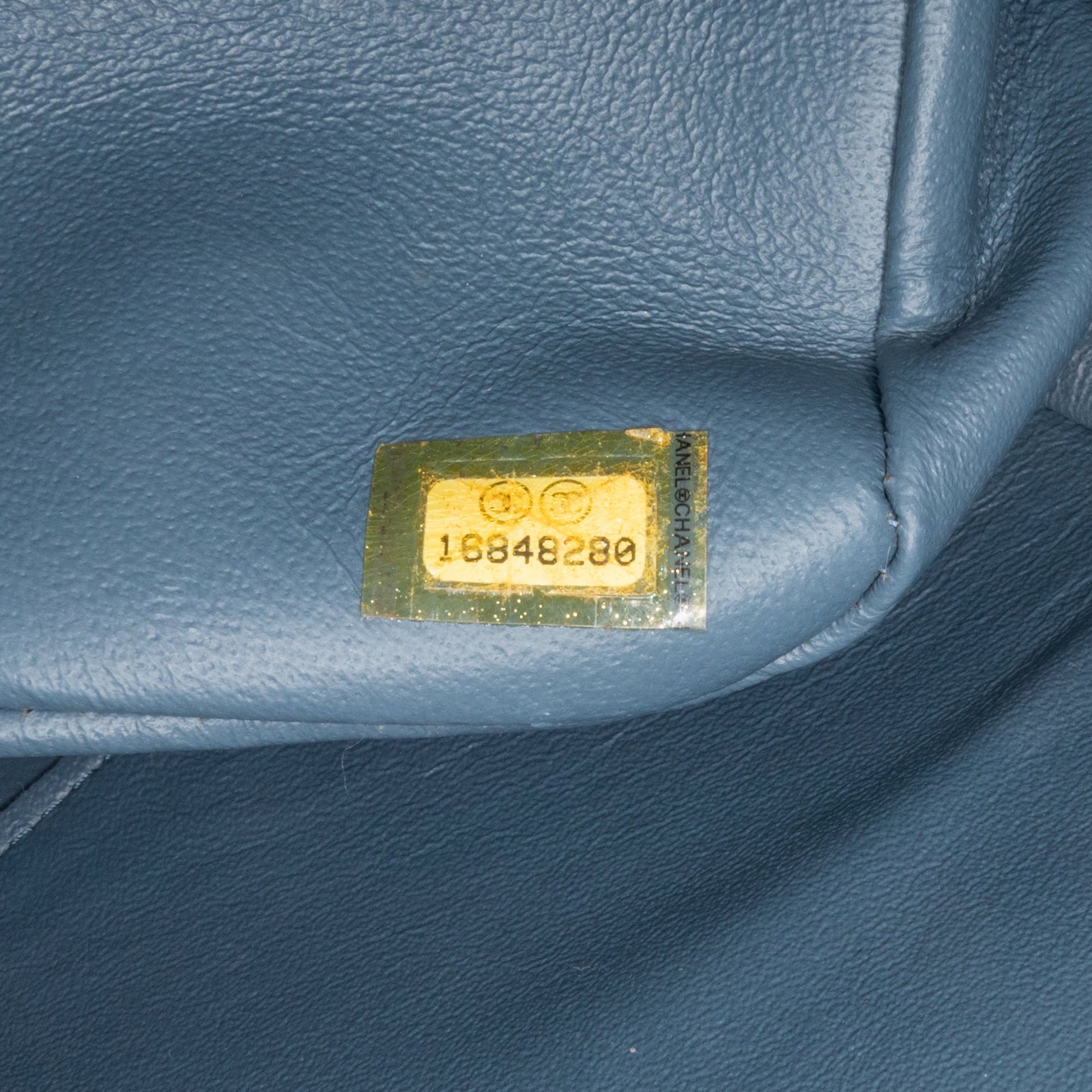 Product Details: Blue Chanel Jumbo Classic Lambskin Double Flap Shoulder Bag. This shoulder bag features a quilted lambskin leather body, leather-woven chain straps, double front flaps with CC turn-lock closure, an exterior back slip pocket, and interior zip and slip pockets. Exterior front and lining are repainted. 7.9" L x 11.8" W x 3.5" D, 13.2" drop. Serial number 16848280.